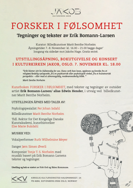 Kunstboken FORSKER I FØLSOMHET, med tekster og tegninger av outsider artist Erik Bomann-Larsen/ alias Edwin Hender, i utvalg ved billedkunstner Marit Benthe Norheim, lanseres 7. november i Jakobs Brønn, Kulturkirken Jakob, Oslo, kl- 18-21. Det foregår i utstillingen av Eriks tekster og tegninger, under samme tittel: FORSKER I FØLSOMHET. (Utstillingen er åpen den 7. og 8. november: kl. 16.00 – 21.00)