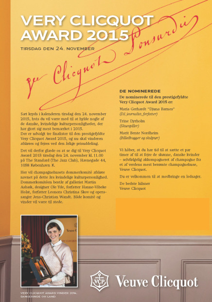 Marit Benthe Norheim var normineret til den fornemme Very Clicquot Award 2015, en pris der gives til nogle af de danske, kvindelige kulturpersonligheder, der har gjort sig mest bemærket i 2015. Vinder af prisen blev Maria Gerhardt