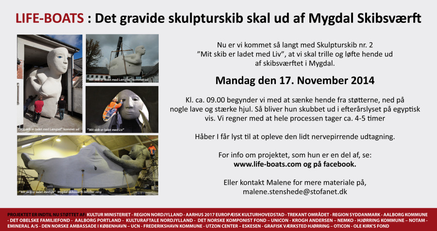 Jeg arbejder frem mod at skabe tre kvindeskulpturer i beton, som skal blive til funktionelle både. De skal være ca 12 meter lange og 3 meter høje over vandlinien og have plads til passagerer. ”Life-boats” skal sejle fra Nordjylland ud på de Europæiske kanaler, der naturligt fører skibene igennem centrum af Europas byer, som er bygget op omkring de gamle vandveje. Projekt Life-boats er et tredelt portræt af kvinden i forskellige almengyldige stadier og tilstande. Projektet ”Life-boats” vil handle om møder – om udveksling – om at tage imod fremmede udtryksformer, om at turde bevæge sig i et ukendt terræn og skabe nye forbindelser. Det første skulpturelle skib "Mit skib er ladet med længsel" er færdig og er flyttet udenfor, for at gøre plads til at bygge det næste skulpturelle skib "Mit skib er ladet med Liv" i værkstedet. Denne proces er godt igang og skelettet til nummer 2 skib er ved at være færdigt og er snart klar til støbning.