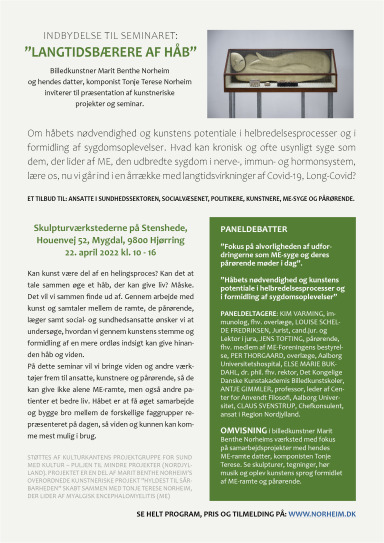 Seminaret er gratis og støtte af KulturKANtens projektgruppe for Sund med Kultur – puljen til mindre projekter (Nordjylland). Projektet er en del af Marit Benthe Norheim’s overordnede kunstneriske projekt ”Hyldest til sårbarheden” skabt sammen med Tonje Terese Norheim, der lider af Myalgisk Encephalomyelitis (ME)