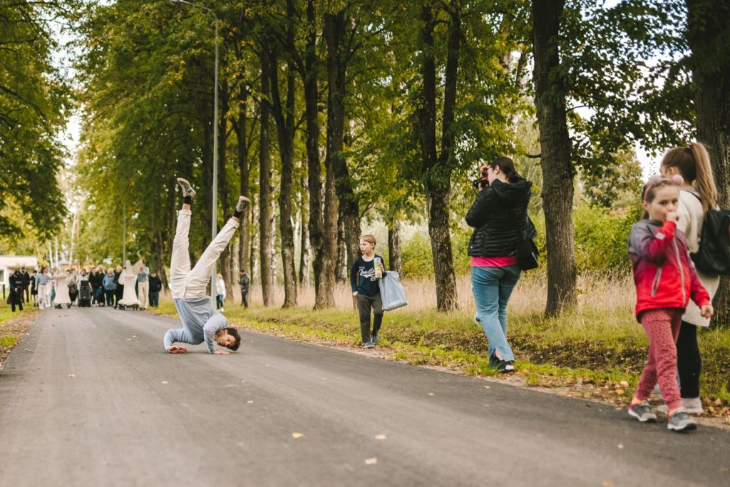 Rullende Engle trilles igennem landsbyen Linksmakalnis uden for Kaunas, sammen med et internationalt team af kunstnere i en nutidig cirkusforestilling "Radio Angels: Arrival".