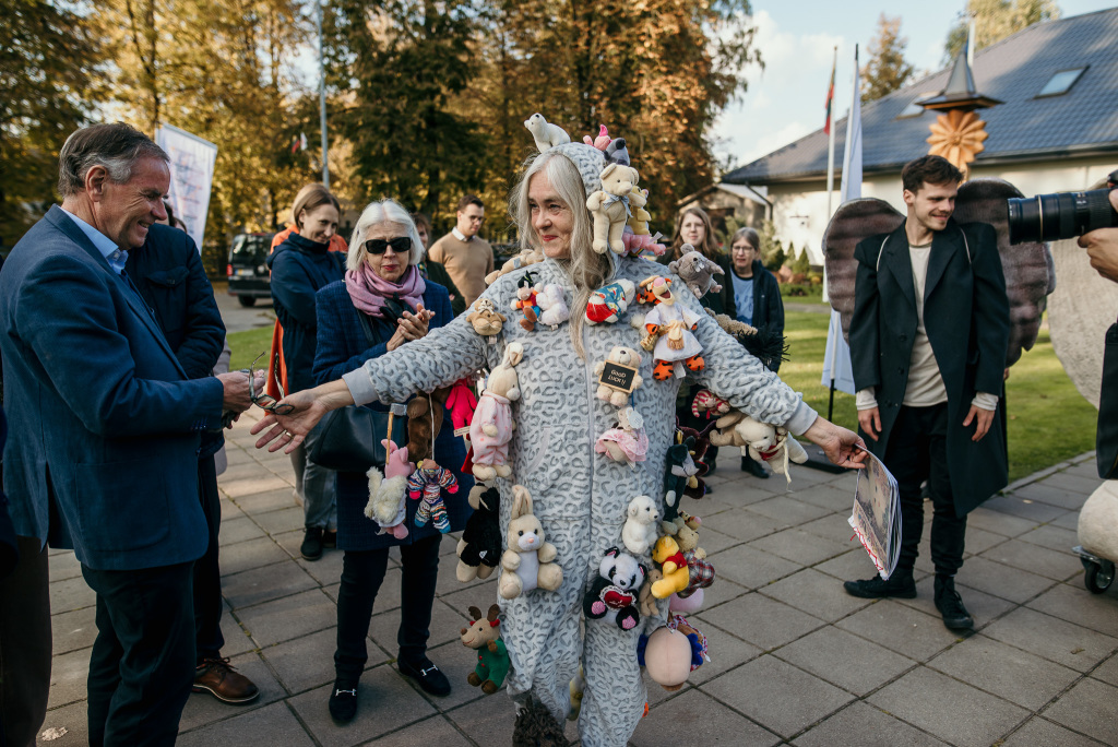 Stasé Samulevičienė lavede små fluffy væsner, som også illustrerede hendes historier. Som et arrangement til åbningsceremonien havde jeg samlet brugte bamser fra Danmark og sat dem fast på mit kostume med sikkerhedsnåle.