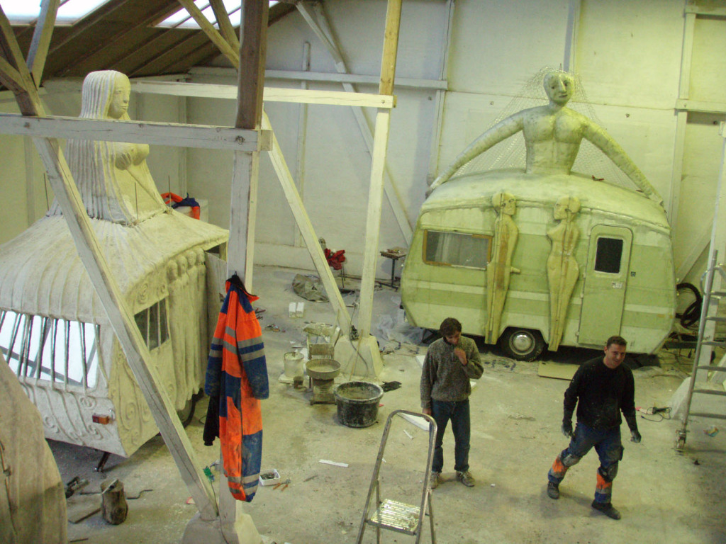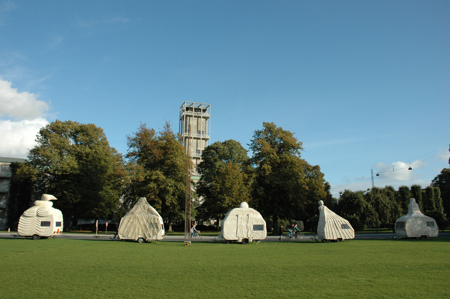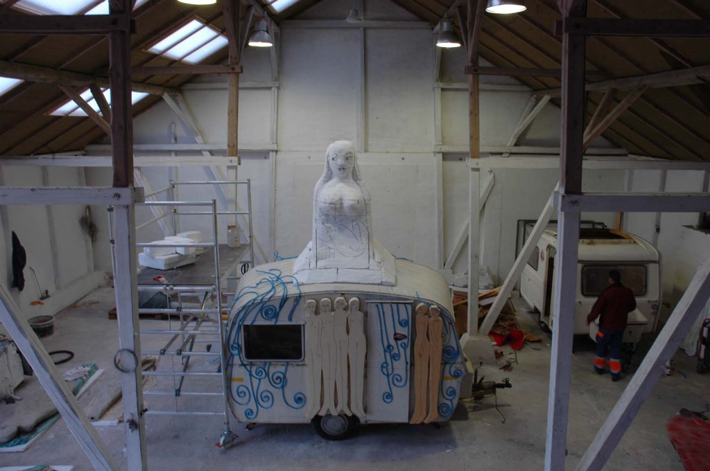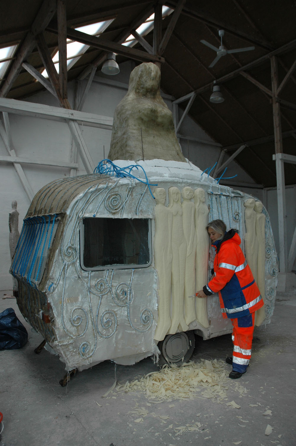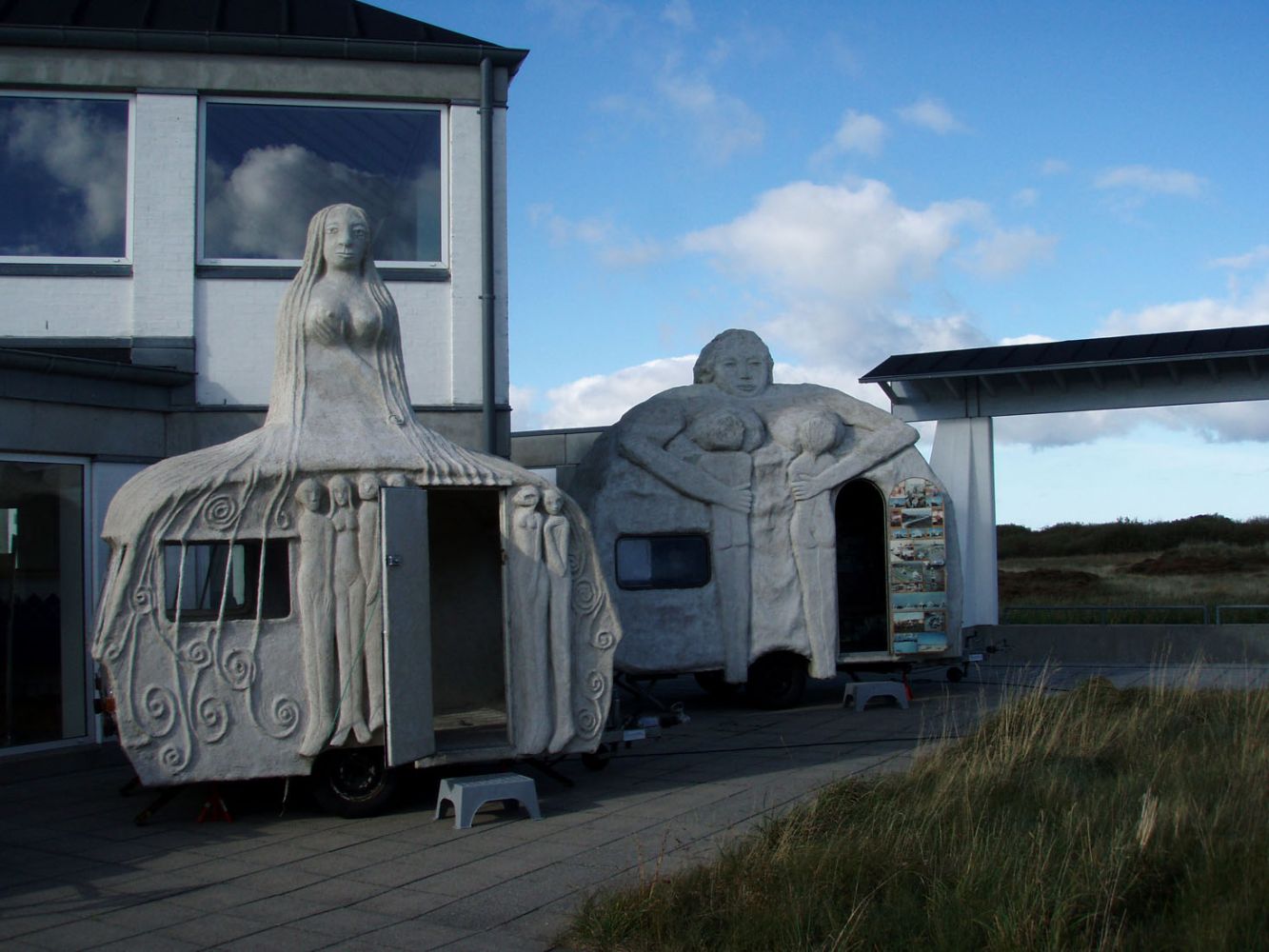 Den bærende idé og samtidigt den indre armering til opbygning af betonskulpturerne, er funktionelle campingvogne, fra tresserne og halvfjerdserne. De indre rum er bearbejdet på forskellige måder, både visuelt og med musik: Flygtningekvinden er fyldt med porcelænsrelief om det at flygte, lavet af børn og flygtningekvinder i samarbejde. Bruden og Campingmama er tapetseret med indsamlede fotos, fra hhv. bryllup og camping. Jomfru Maria optræder som beskytter og bærer af smerte, mens Sirenen er den ambivalente frister og forfører.
