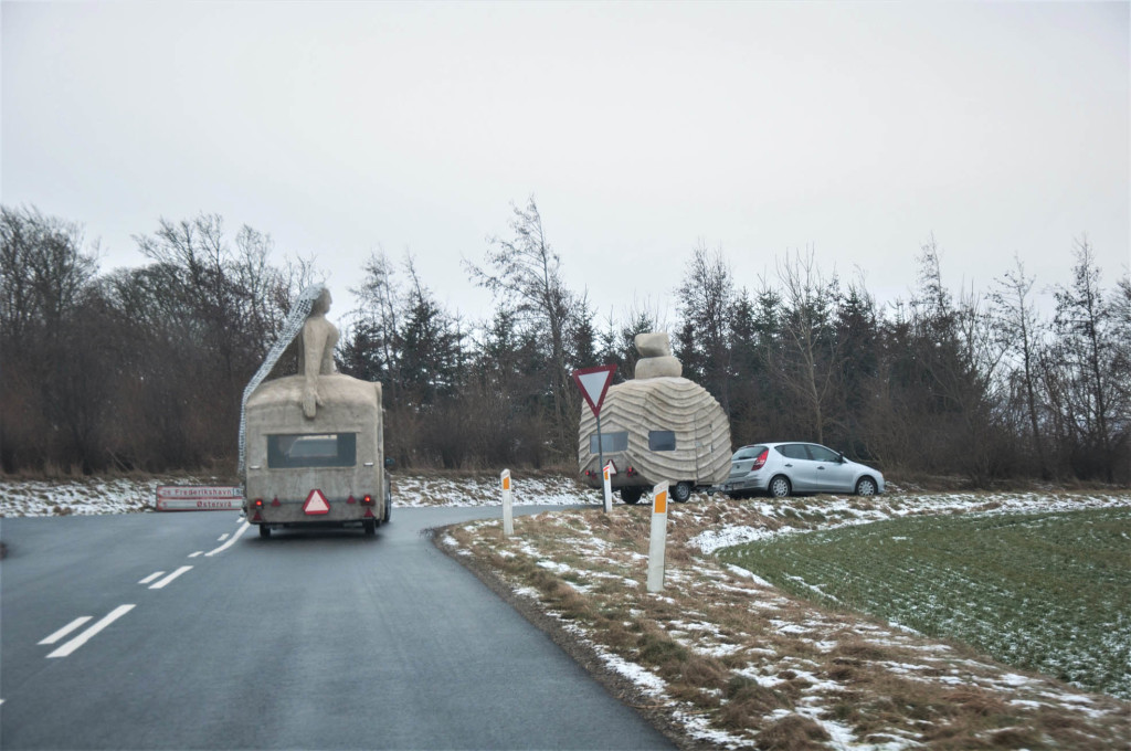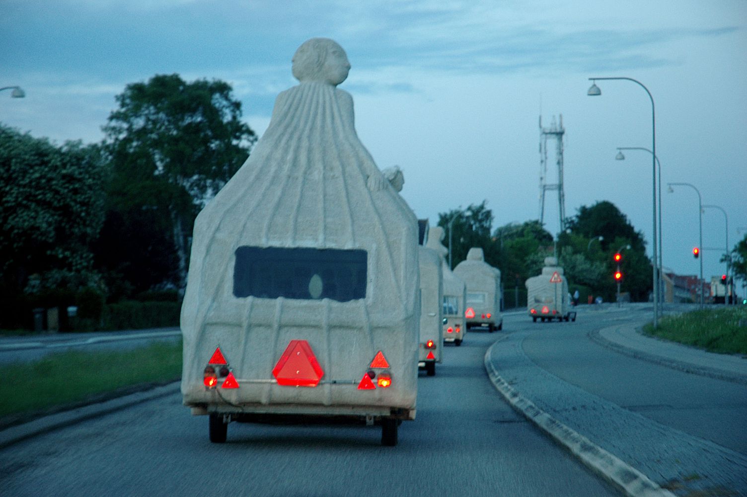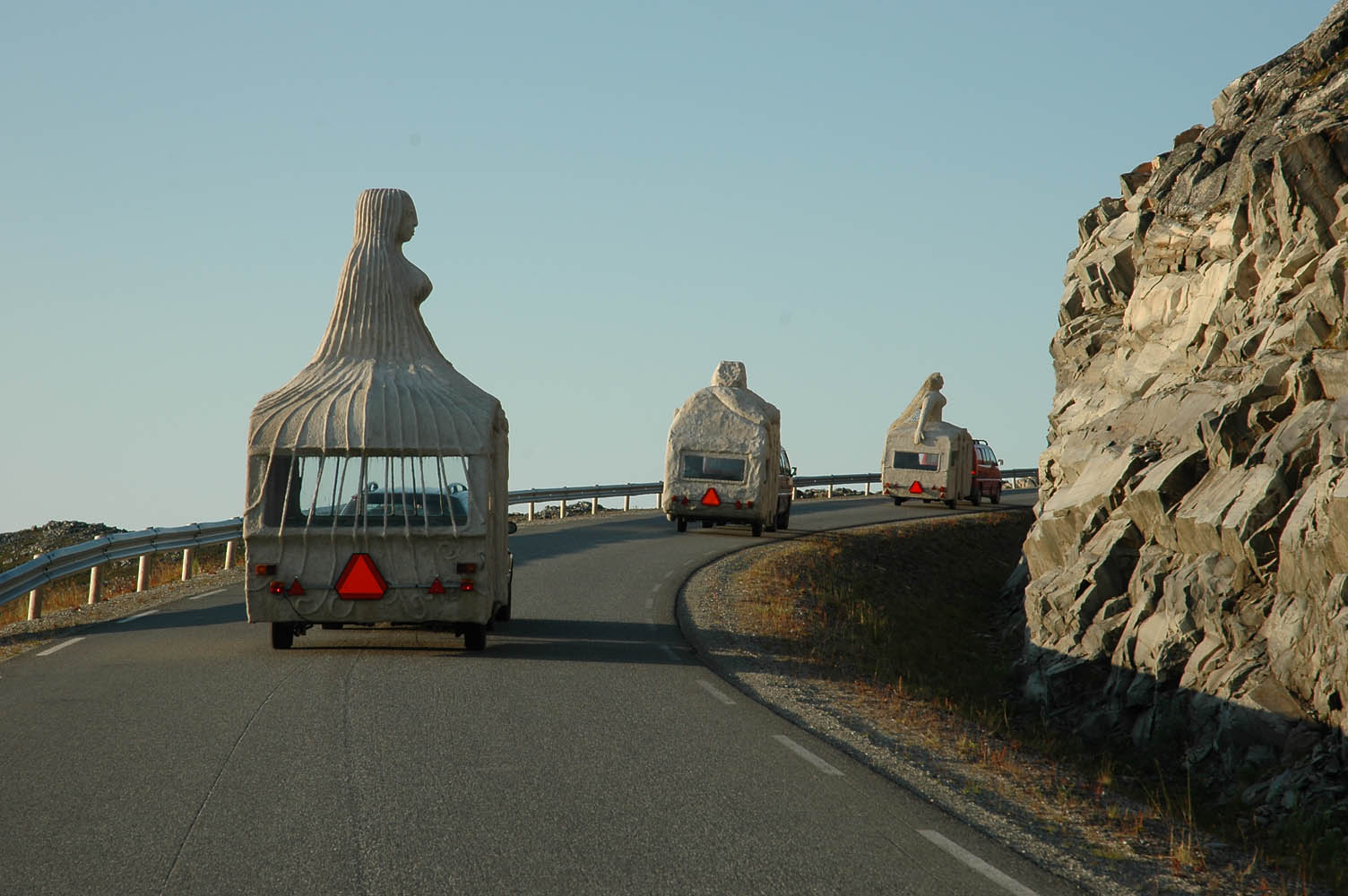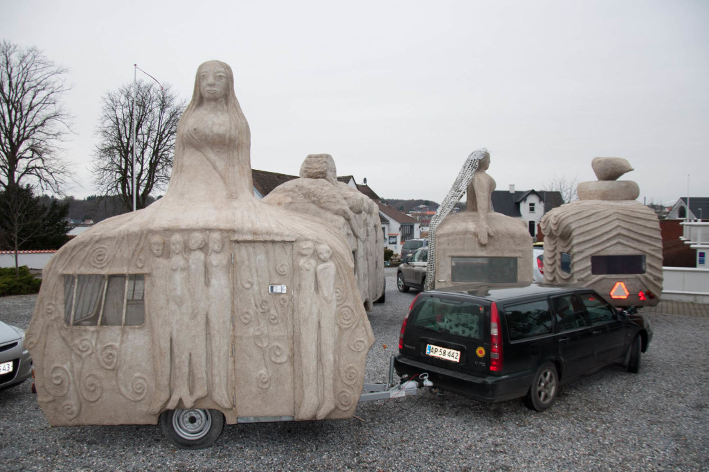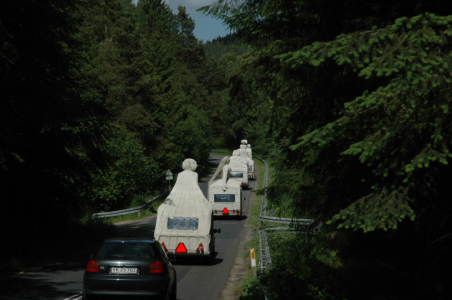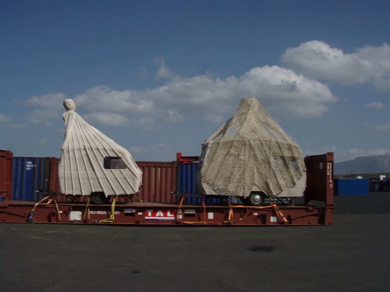 Skulpturerne er i kørbar stand, de ankommer bag hver sin bil og har været på lange campingture i Norge, Danmark og på Island.