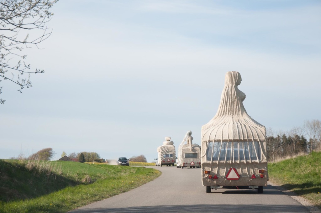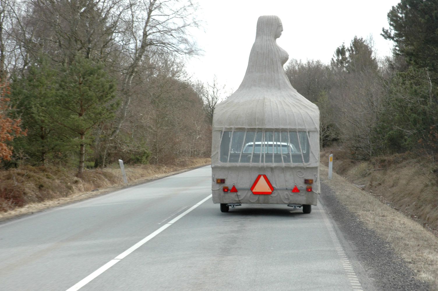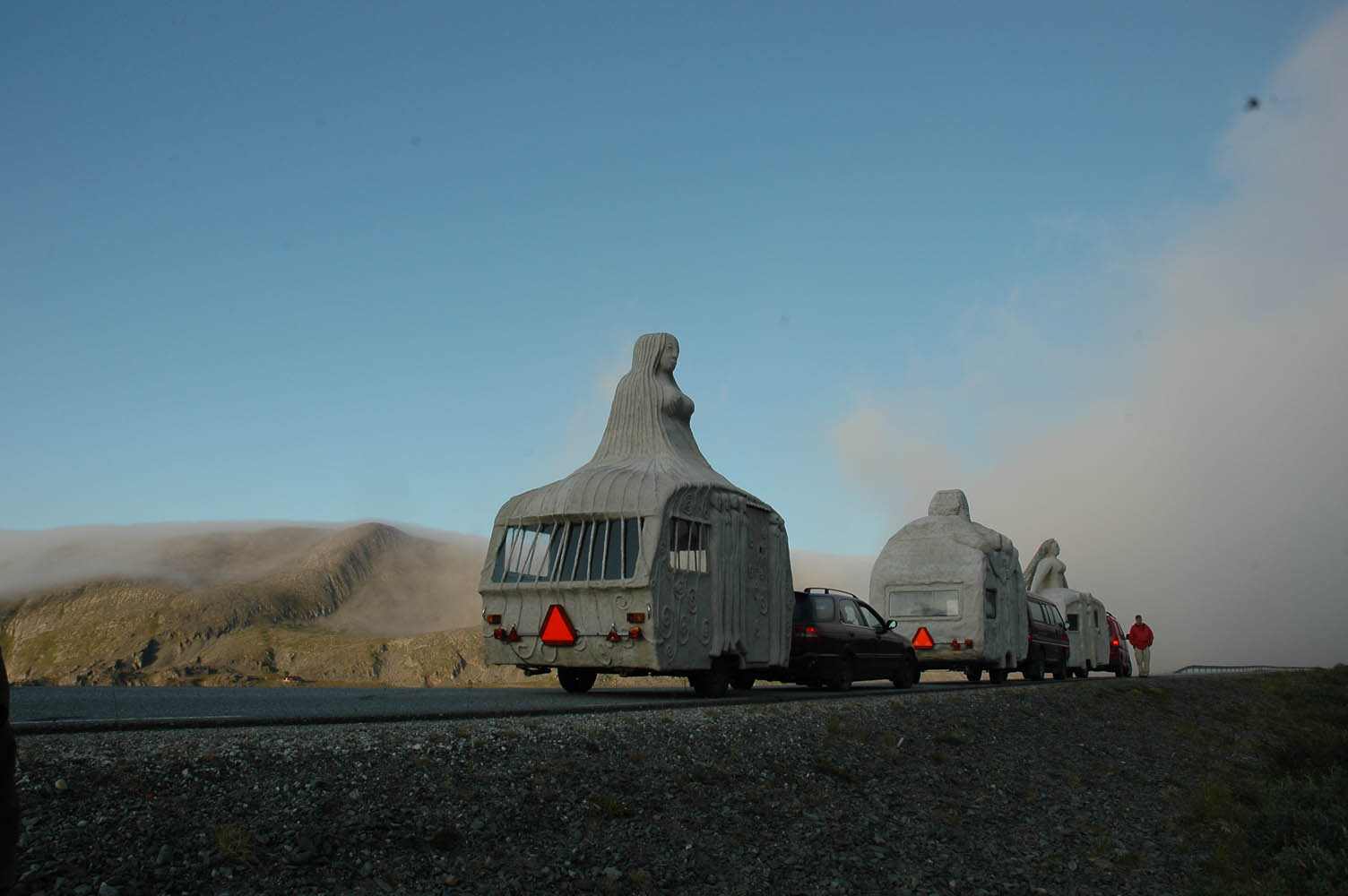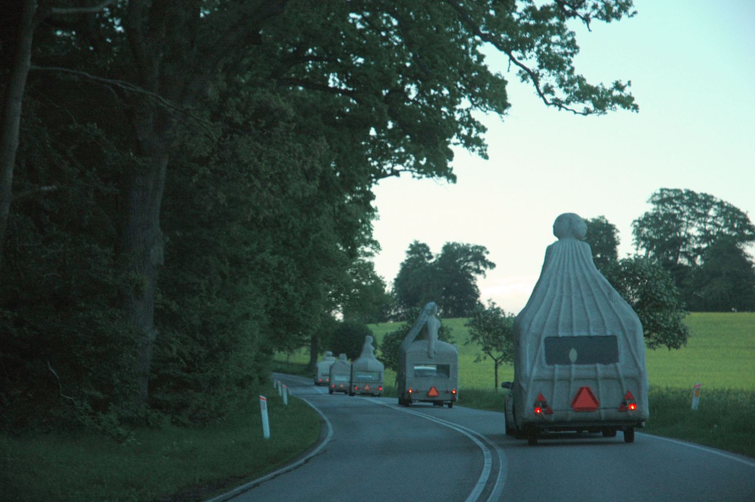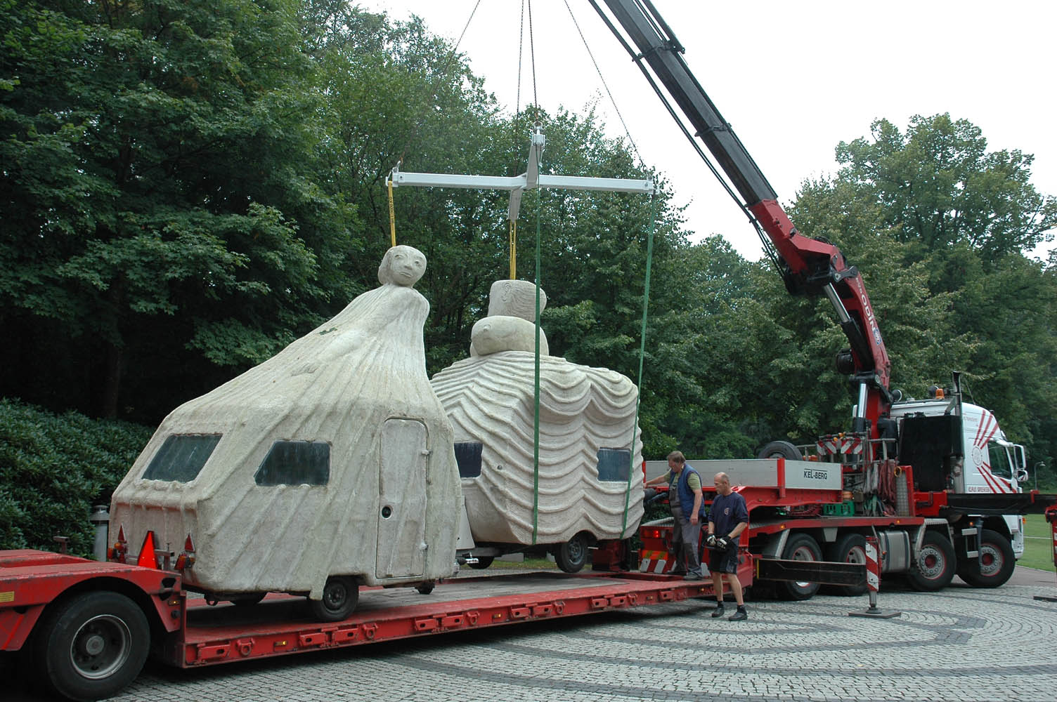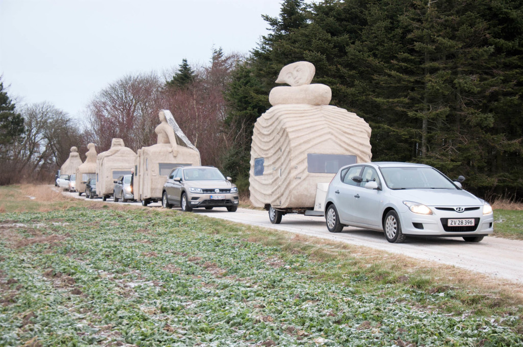 Skulpturerne er i kørbar stand, de ankommer bag hver sin bil og har været på lange campingture i Norge, Danmark og på Island.