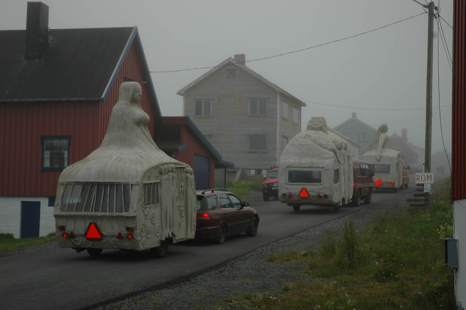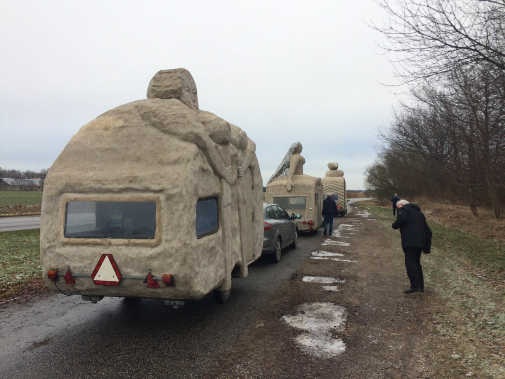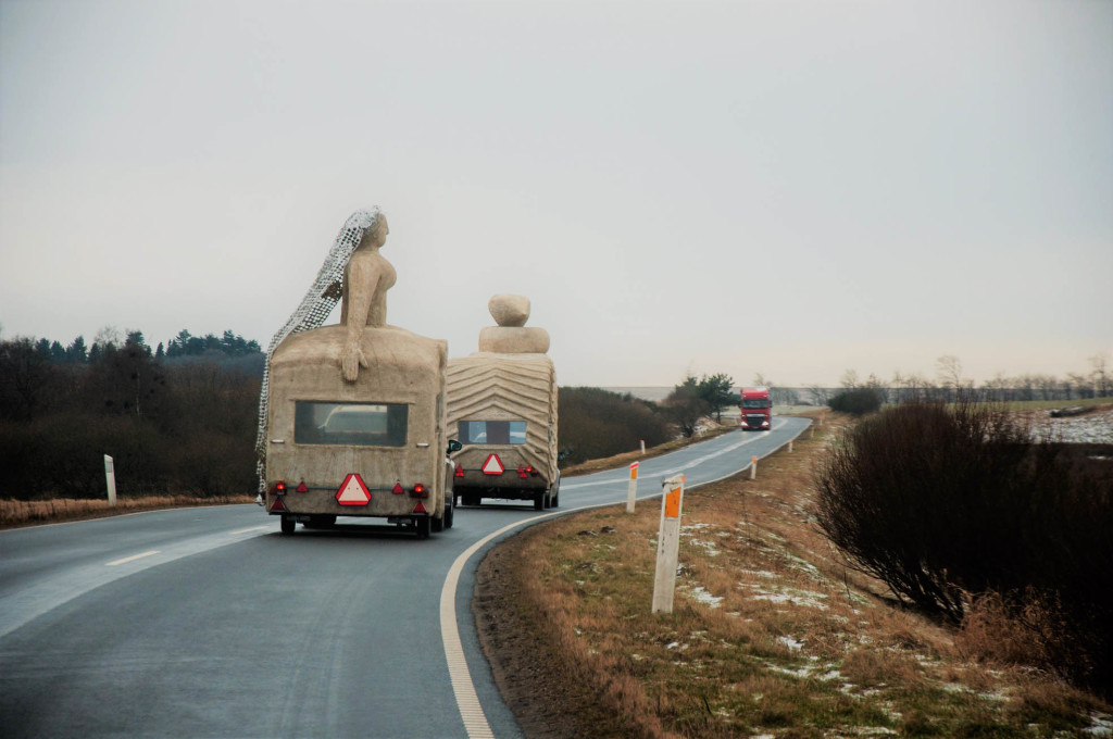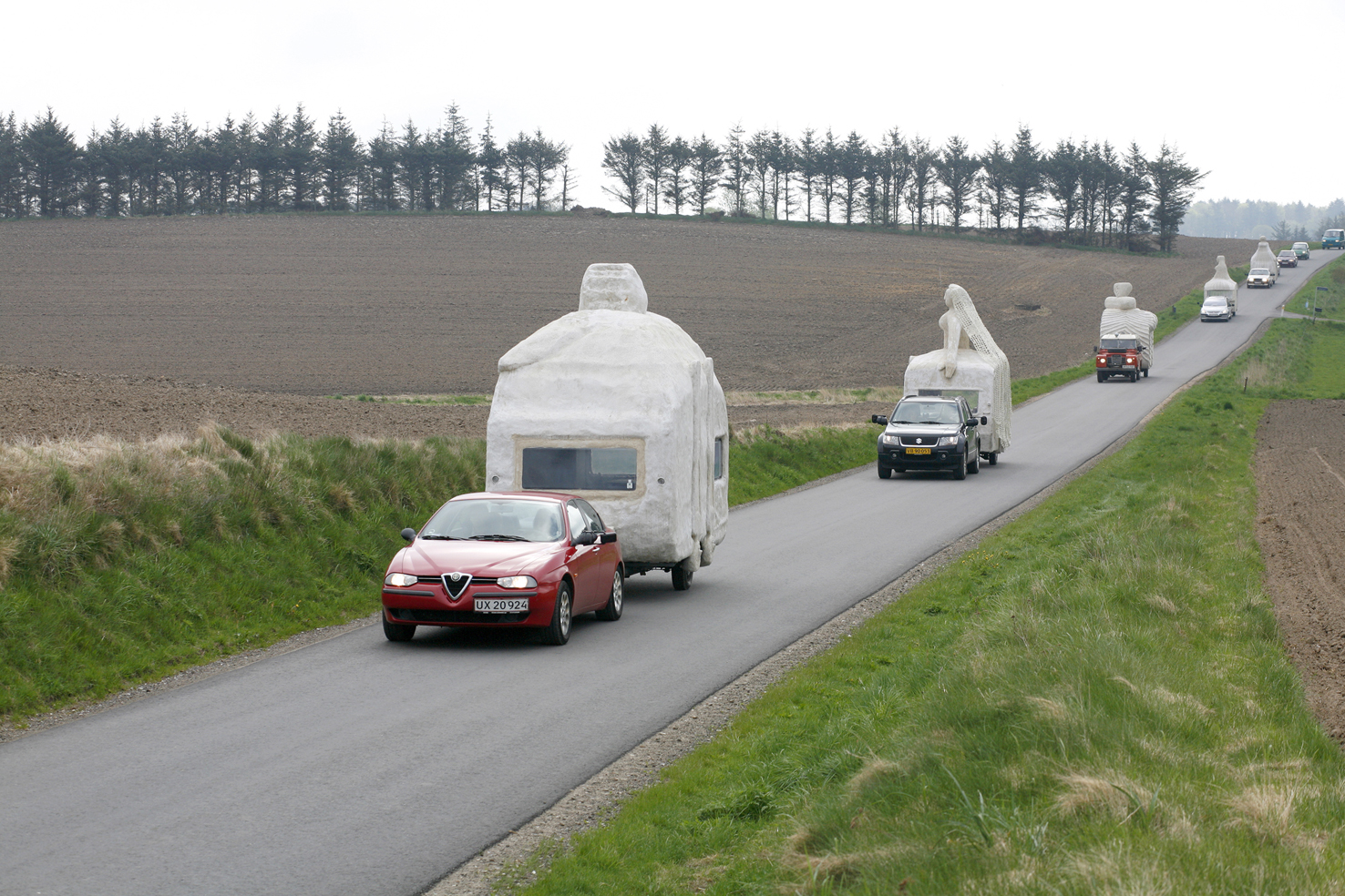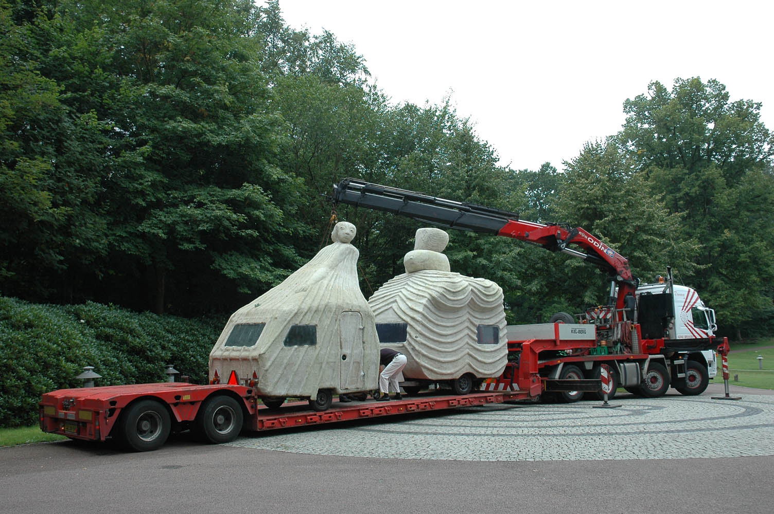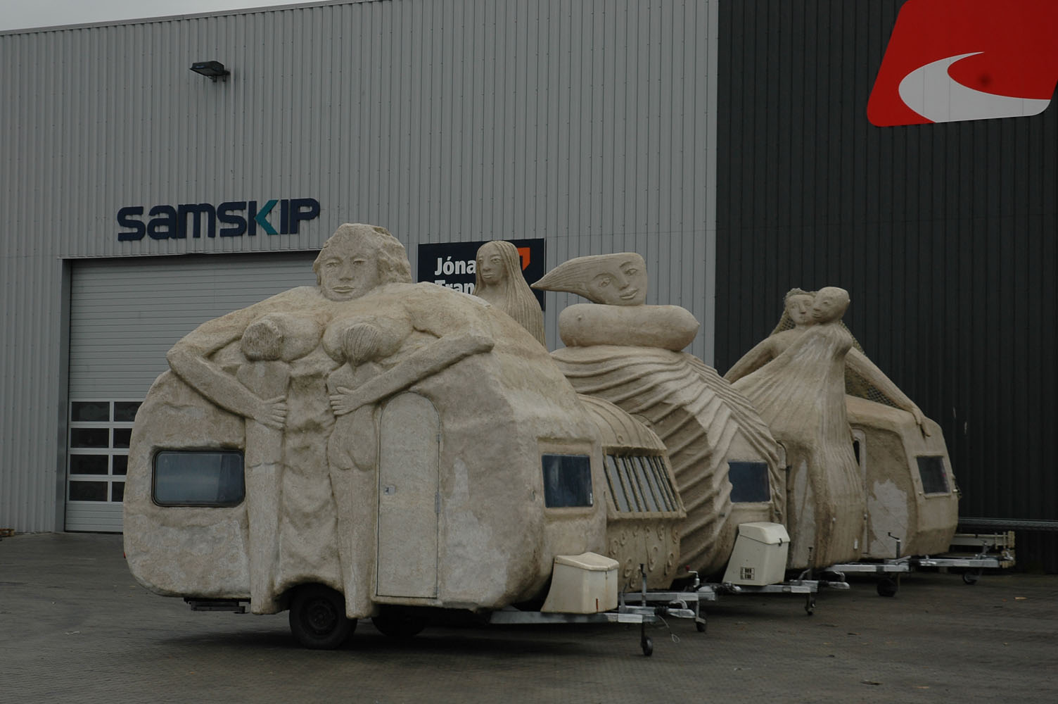 Skulpturerne er i kørbar stand, de ankommer bag hver sin bil og har været på lange campingture i Norge, Danmark og på Island.