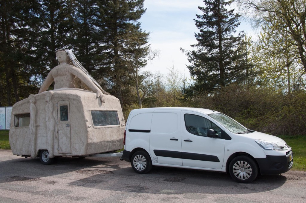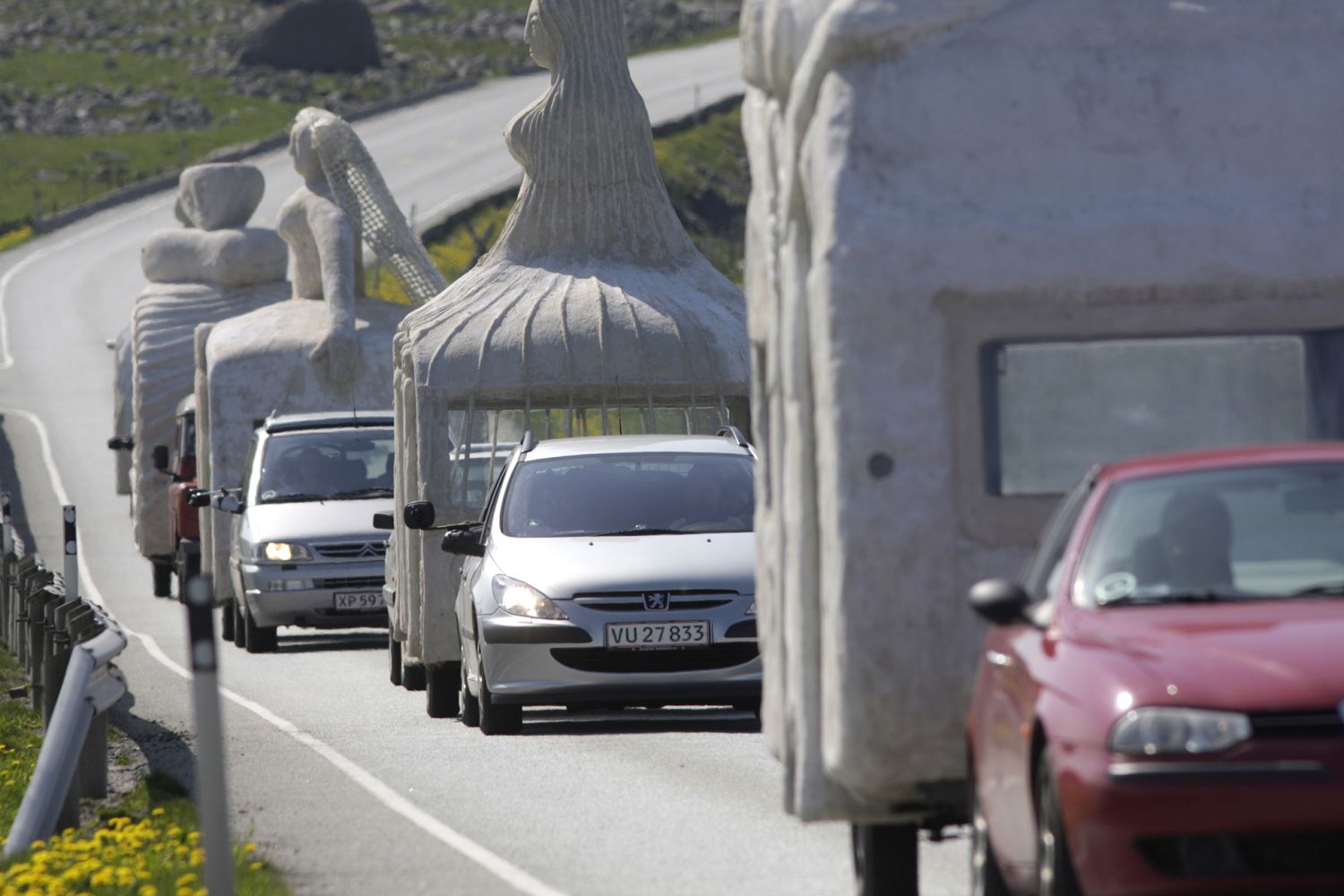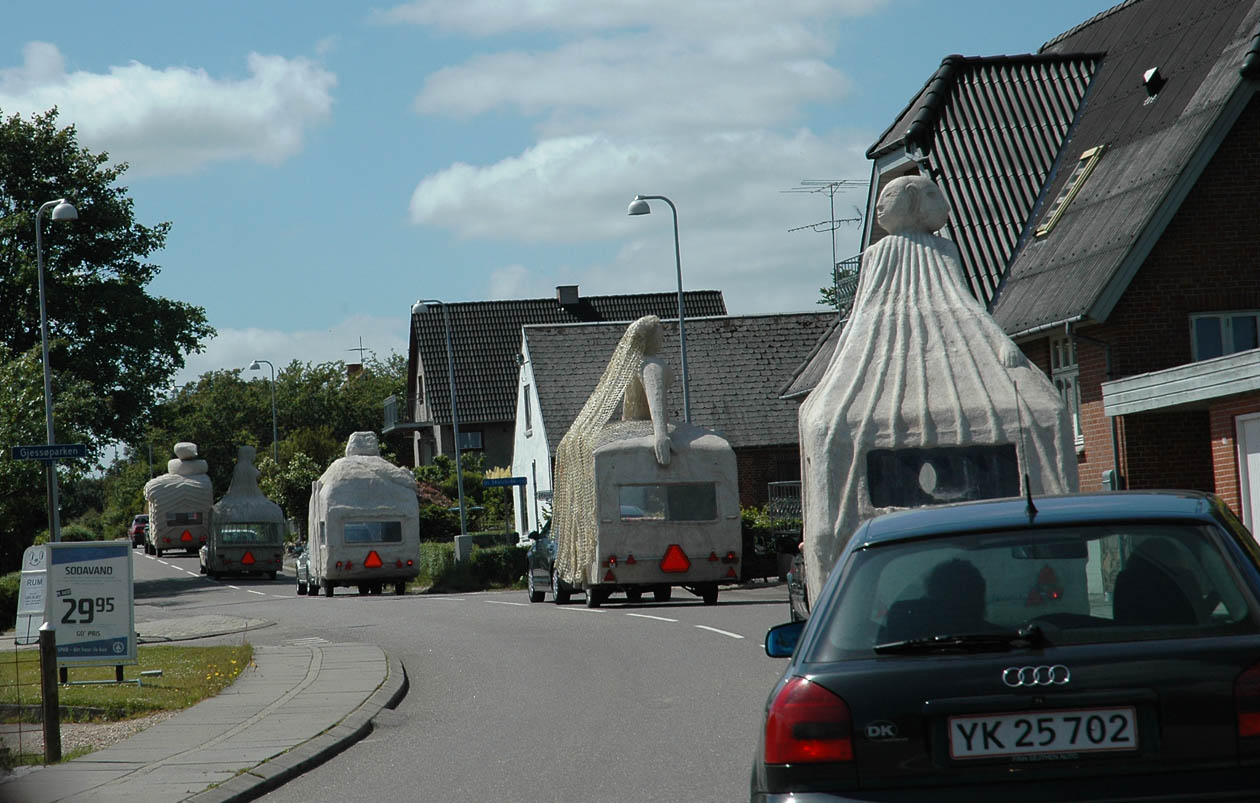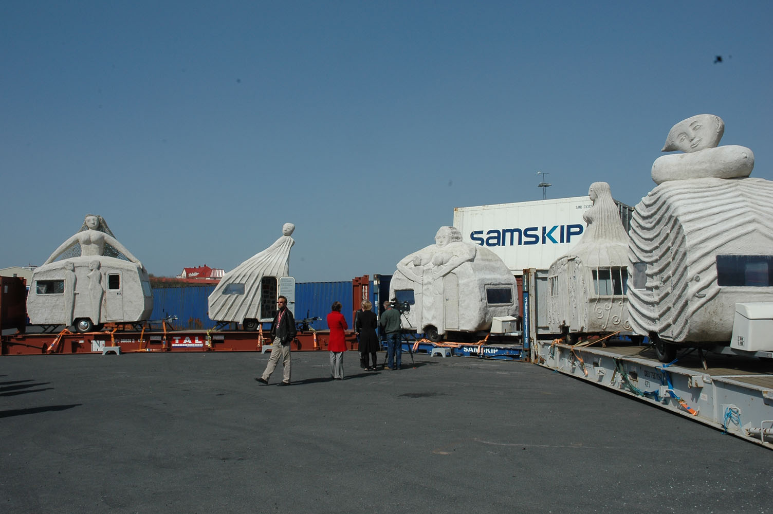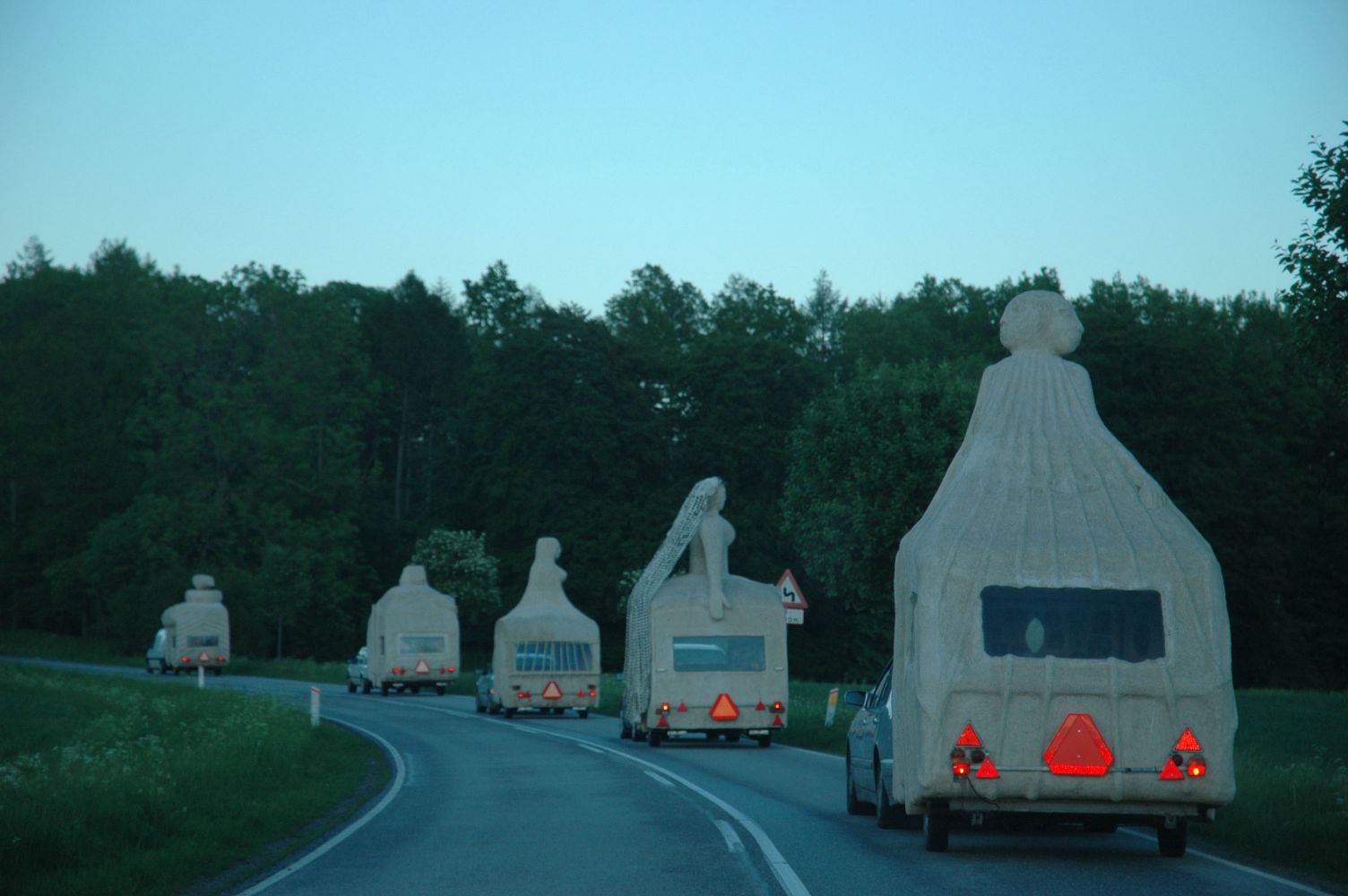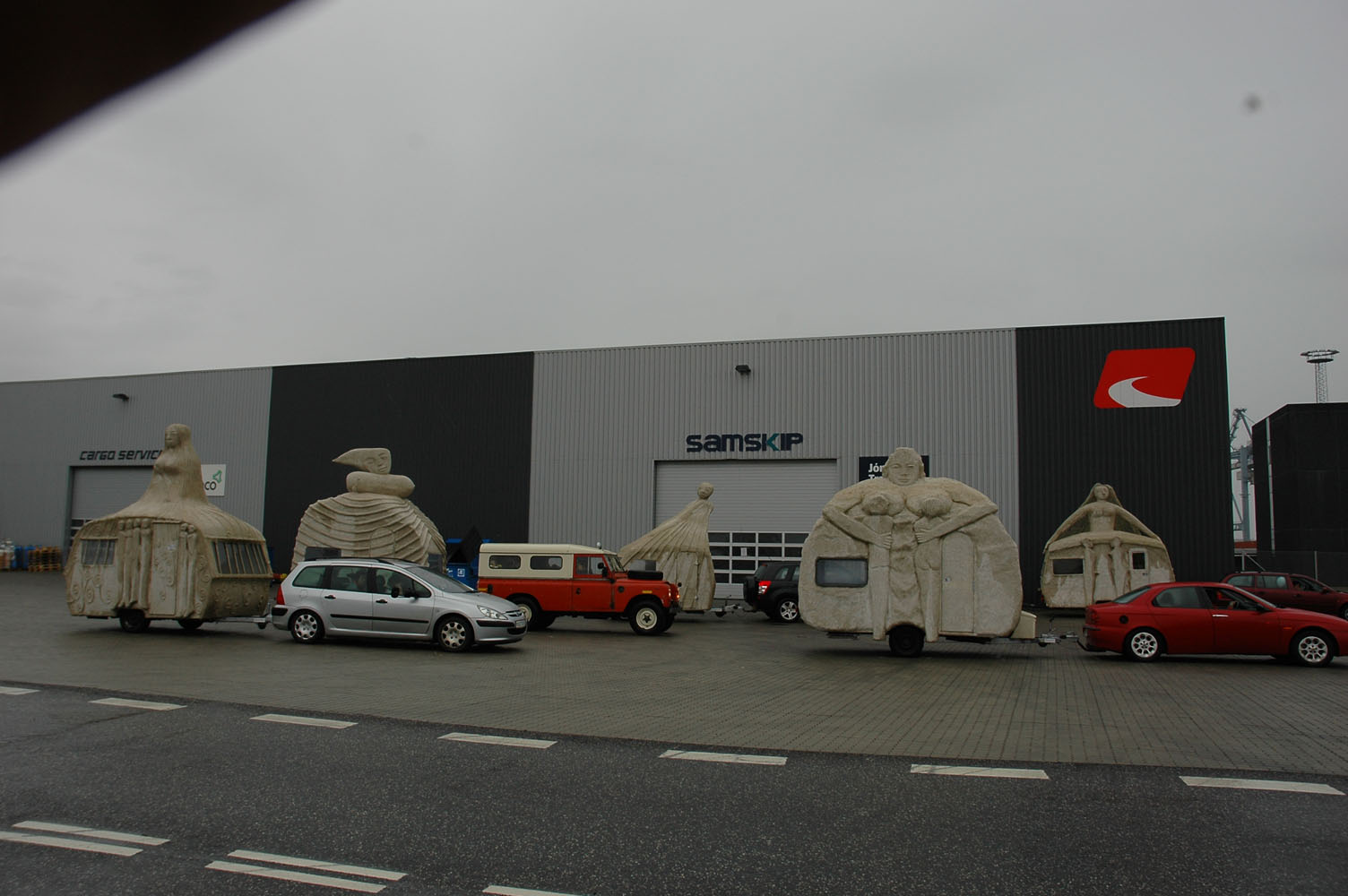 Skulpturerne er i kørbar stand, de ankommer bag hver sin bil og har været på lange campingture i Norge, Danmark og på Island.