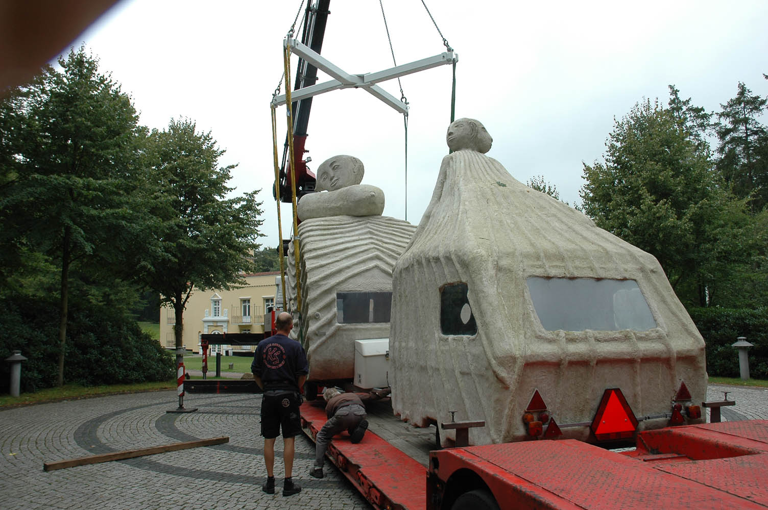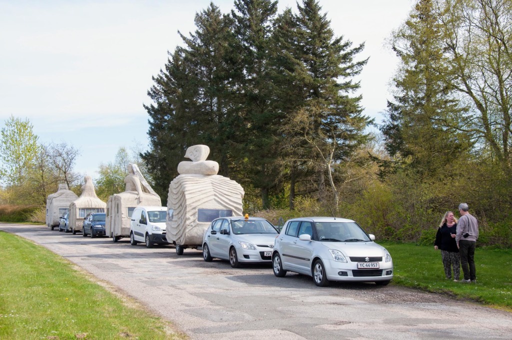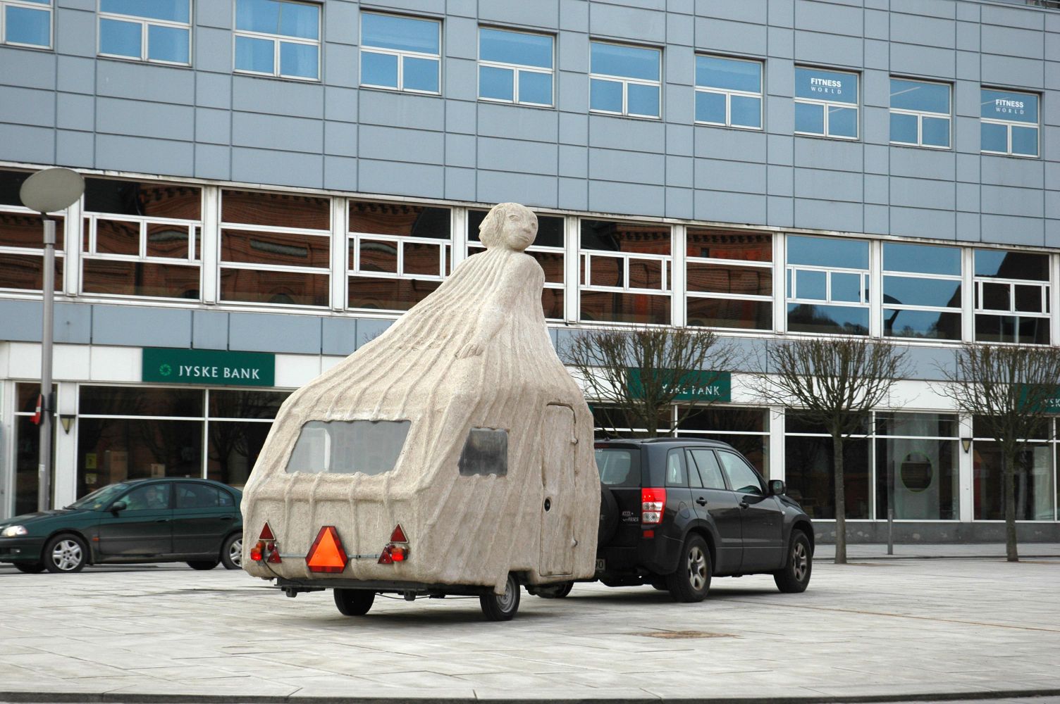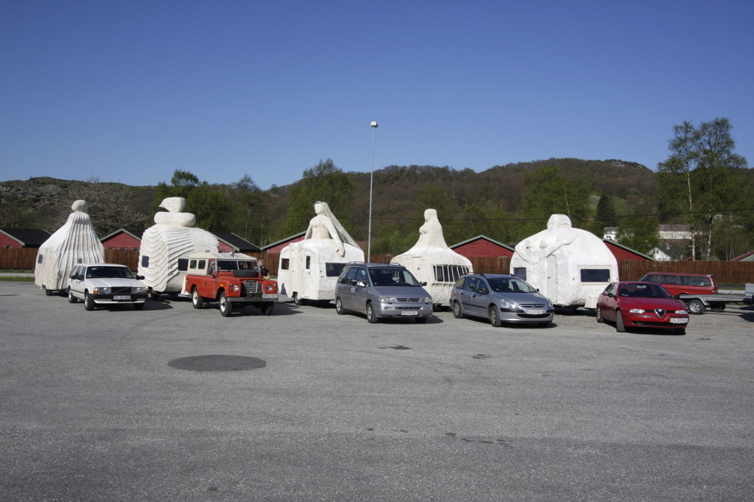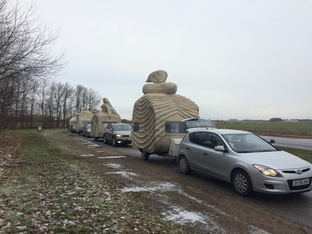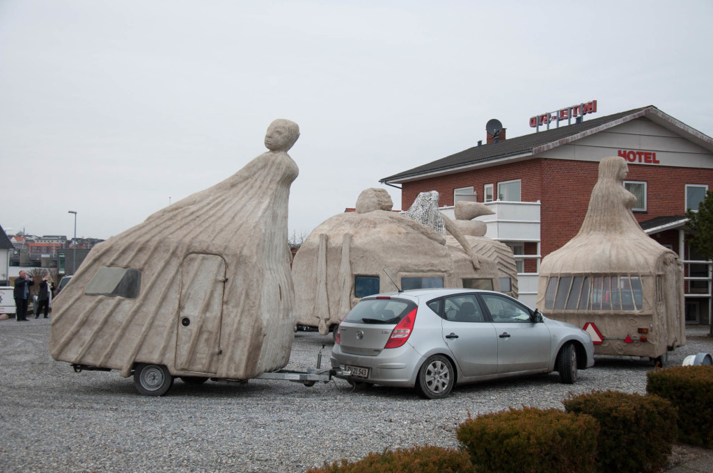 Skulpturerne er i kørbar stand, de ankommer bag hver sin bil og har været på lange campingture i Norge, Danmark og på Island.