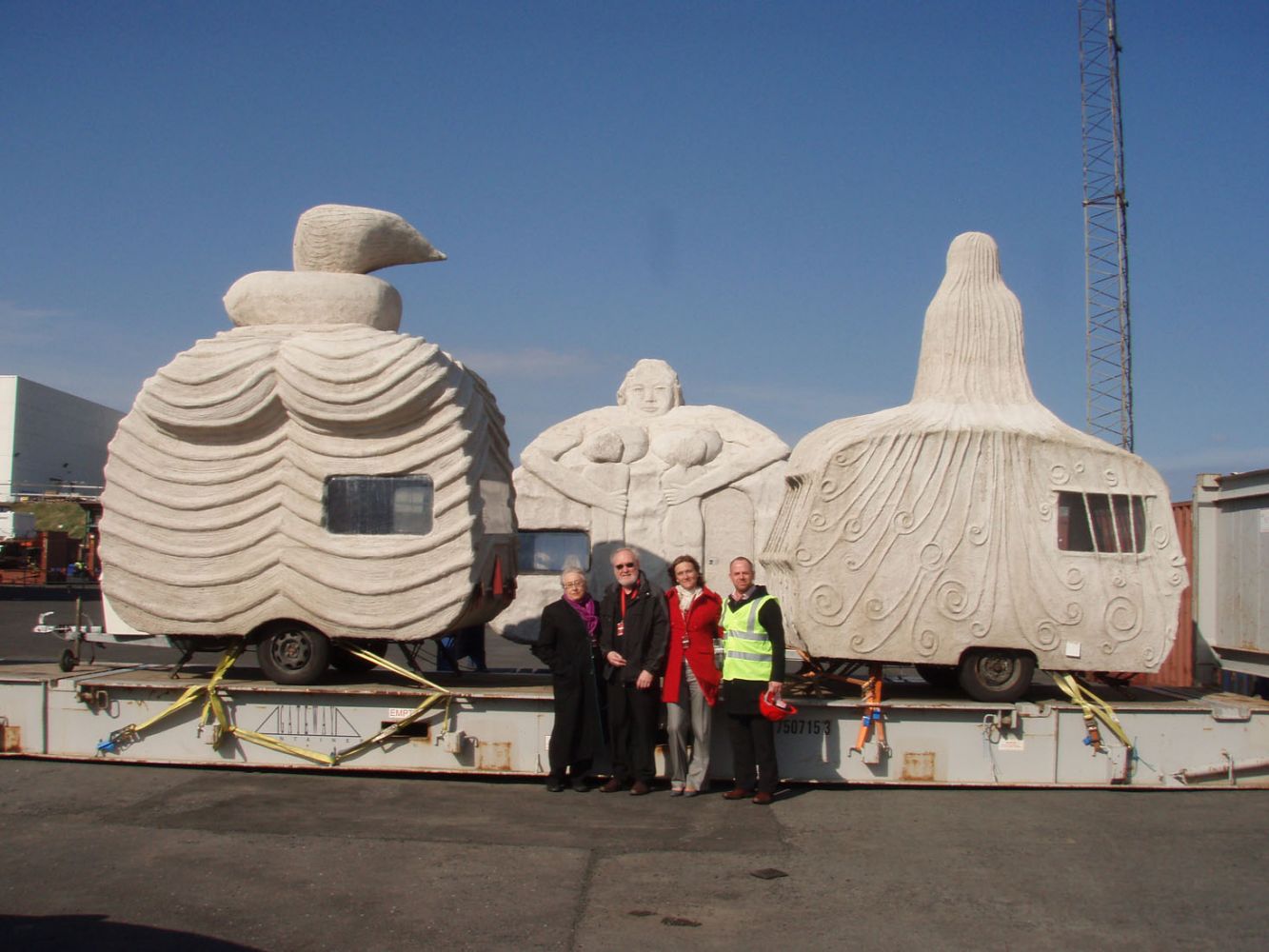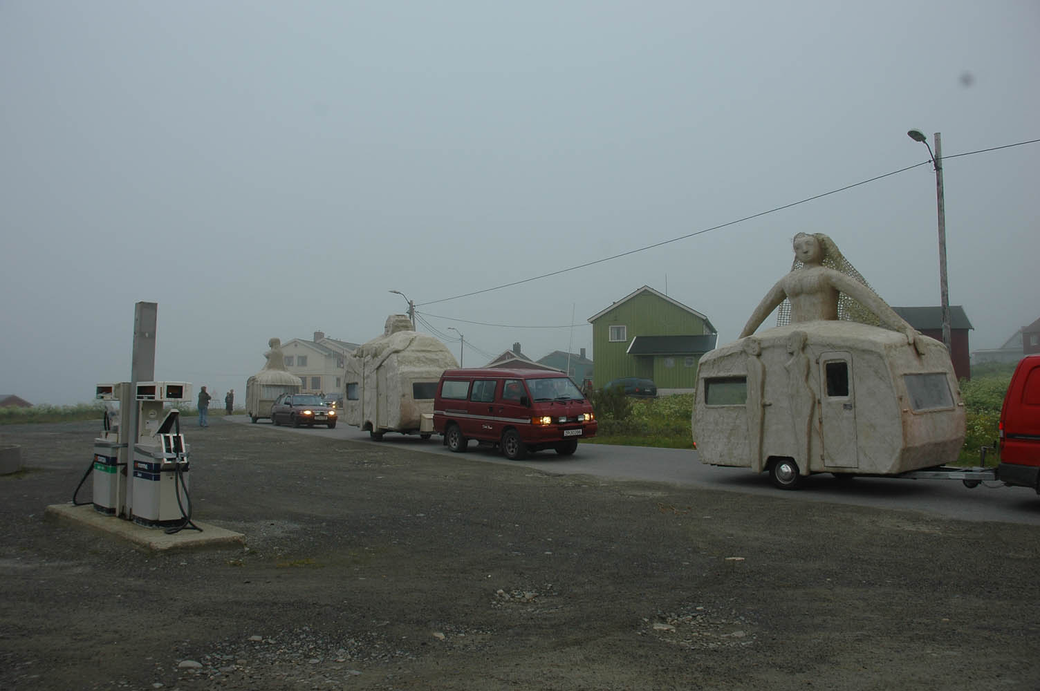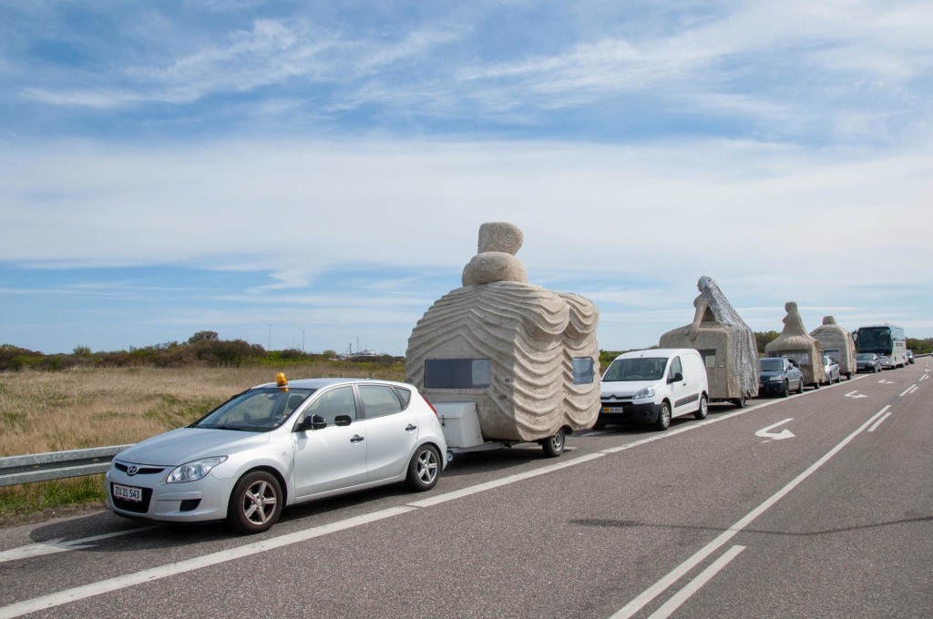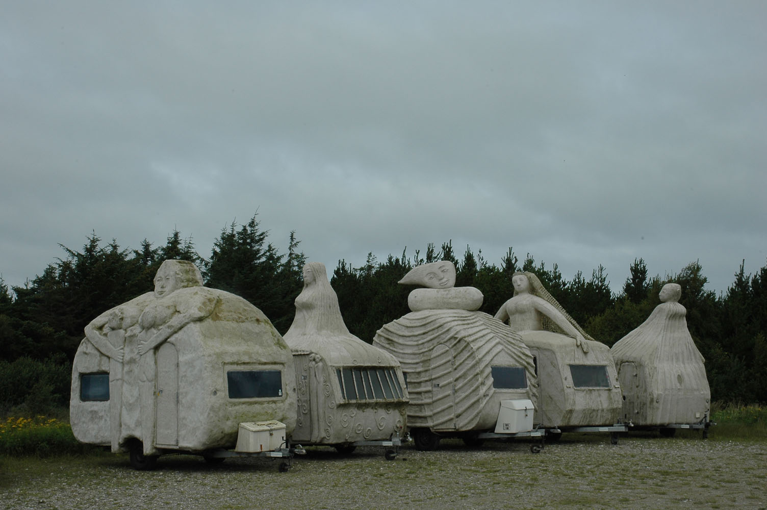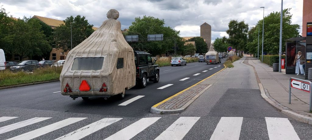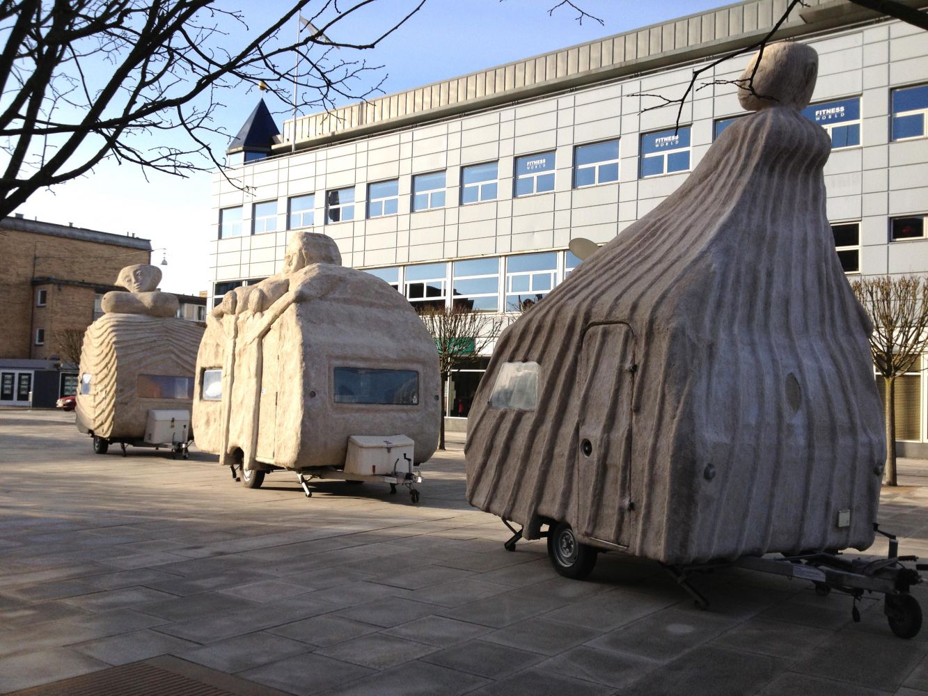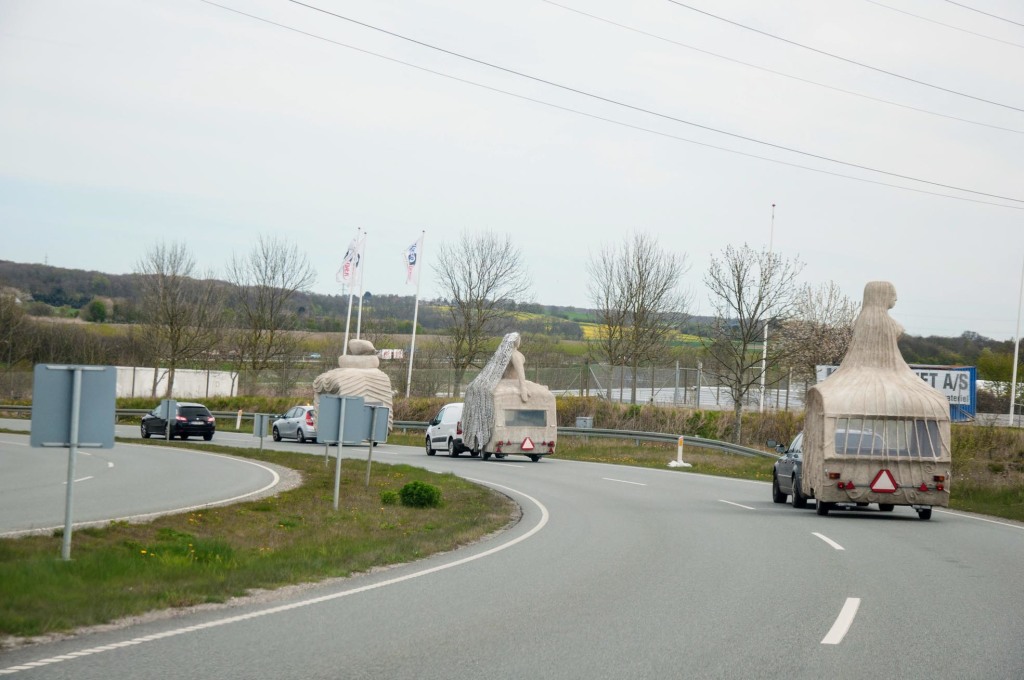 Skulpturerne er i kørbar stand, de ankommer bag hver sin bil og har været på lange campingture i Norge, Danmark og på Island.