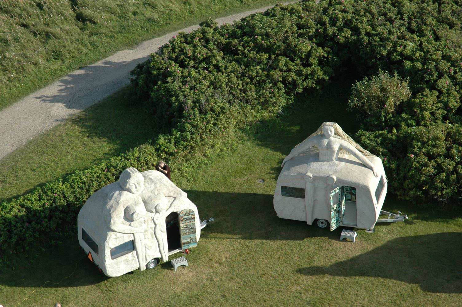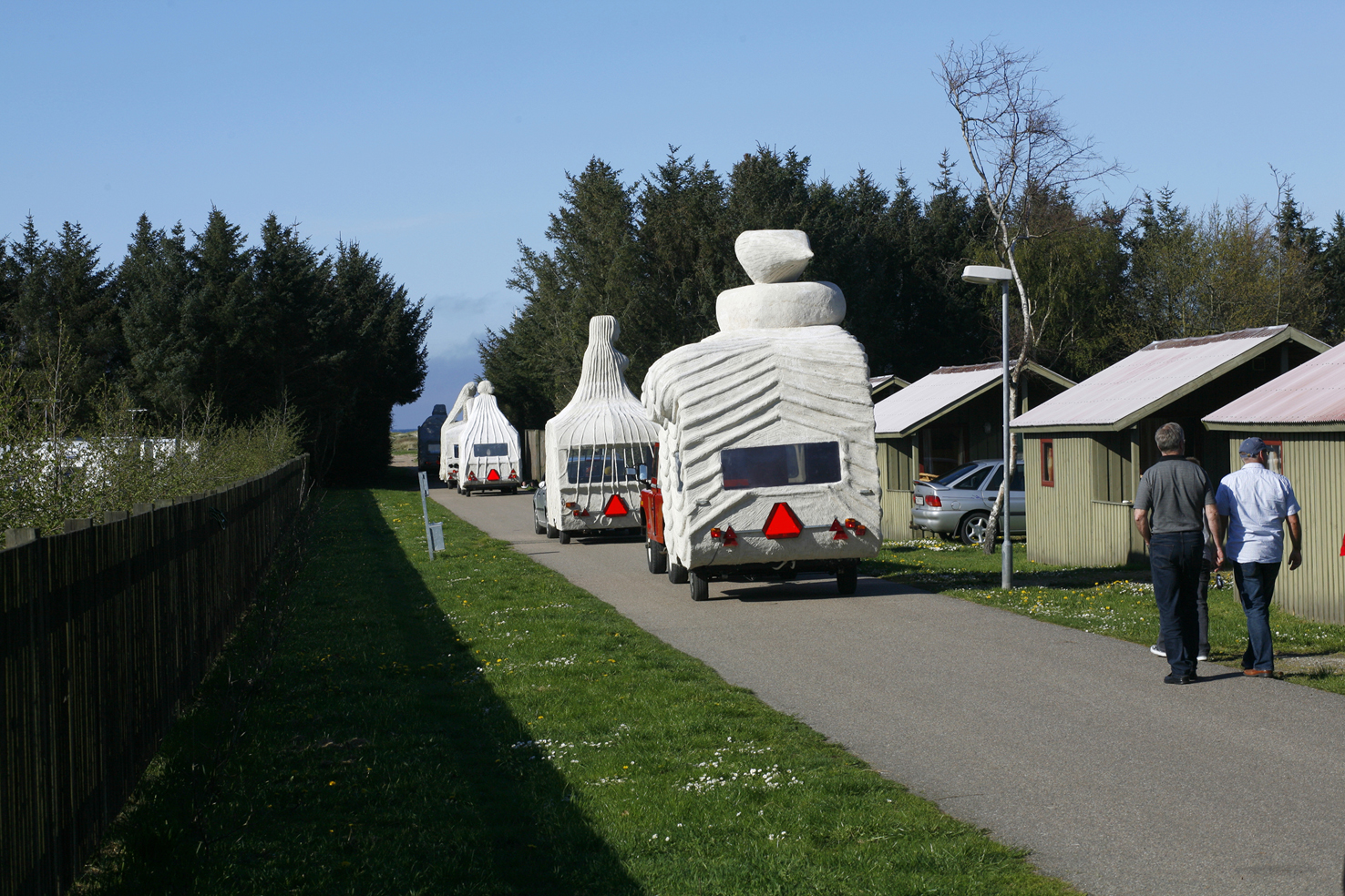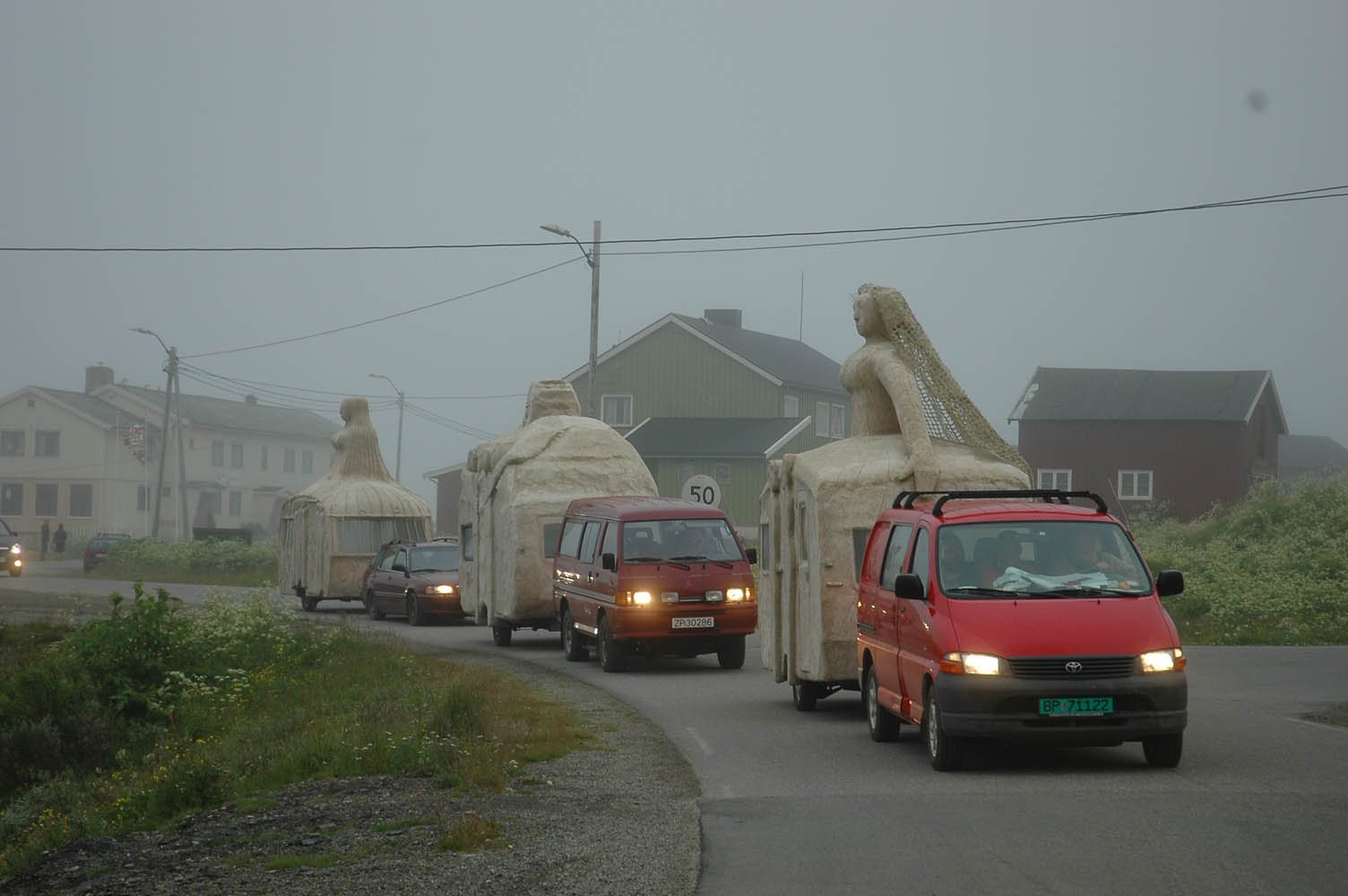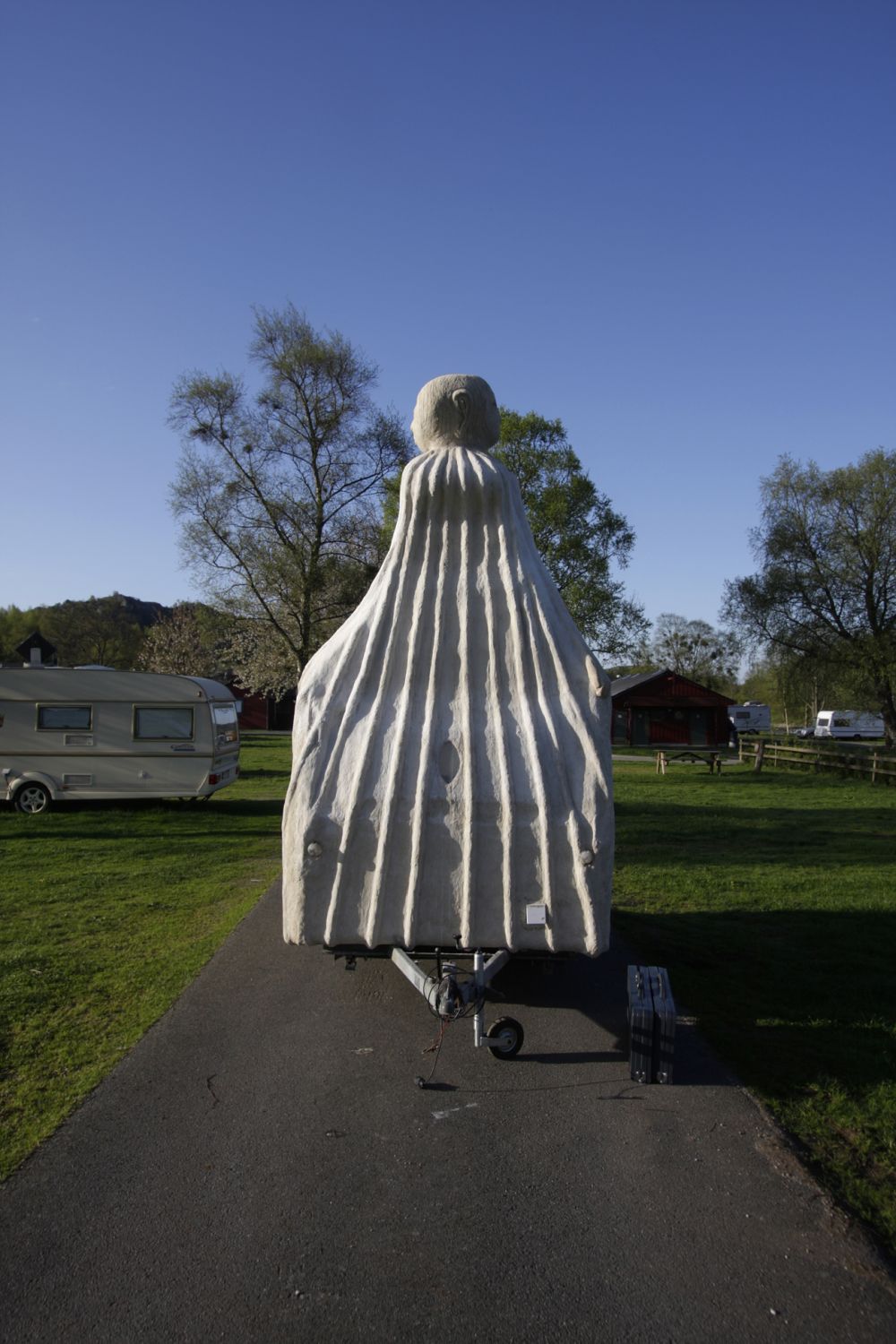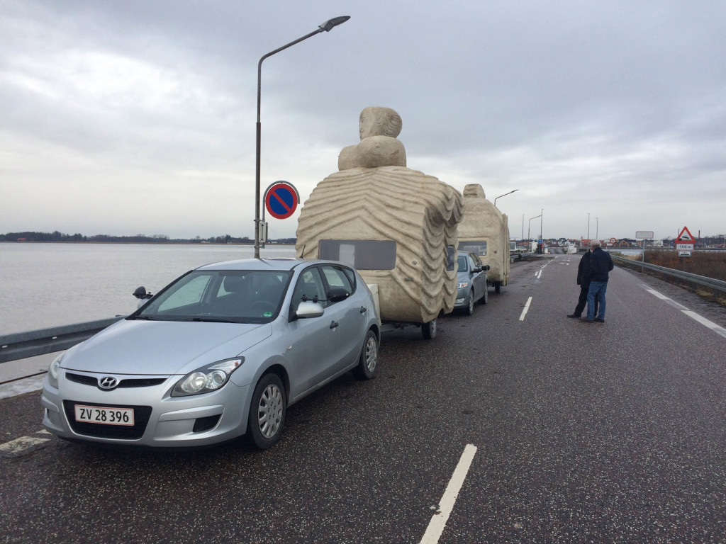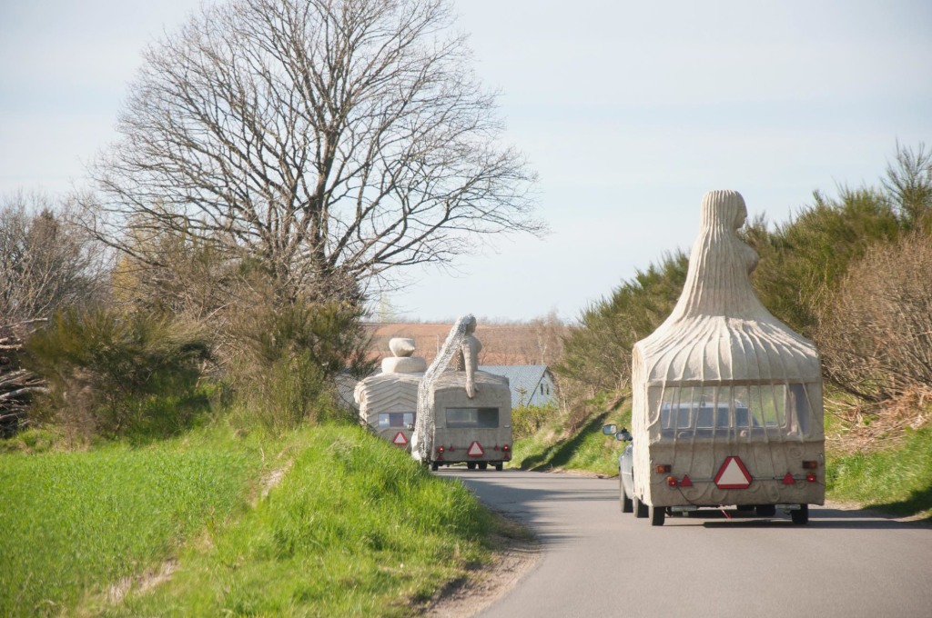 Skulpturerne er i kørbar stand, de ankommer bag hver sin bil og har været på lange campingture i Norge, Danmark og på Island.