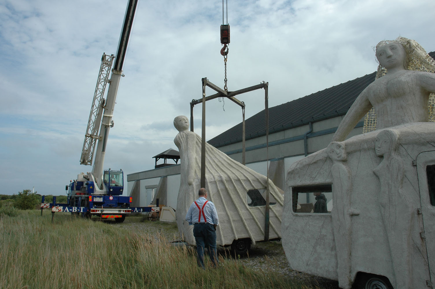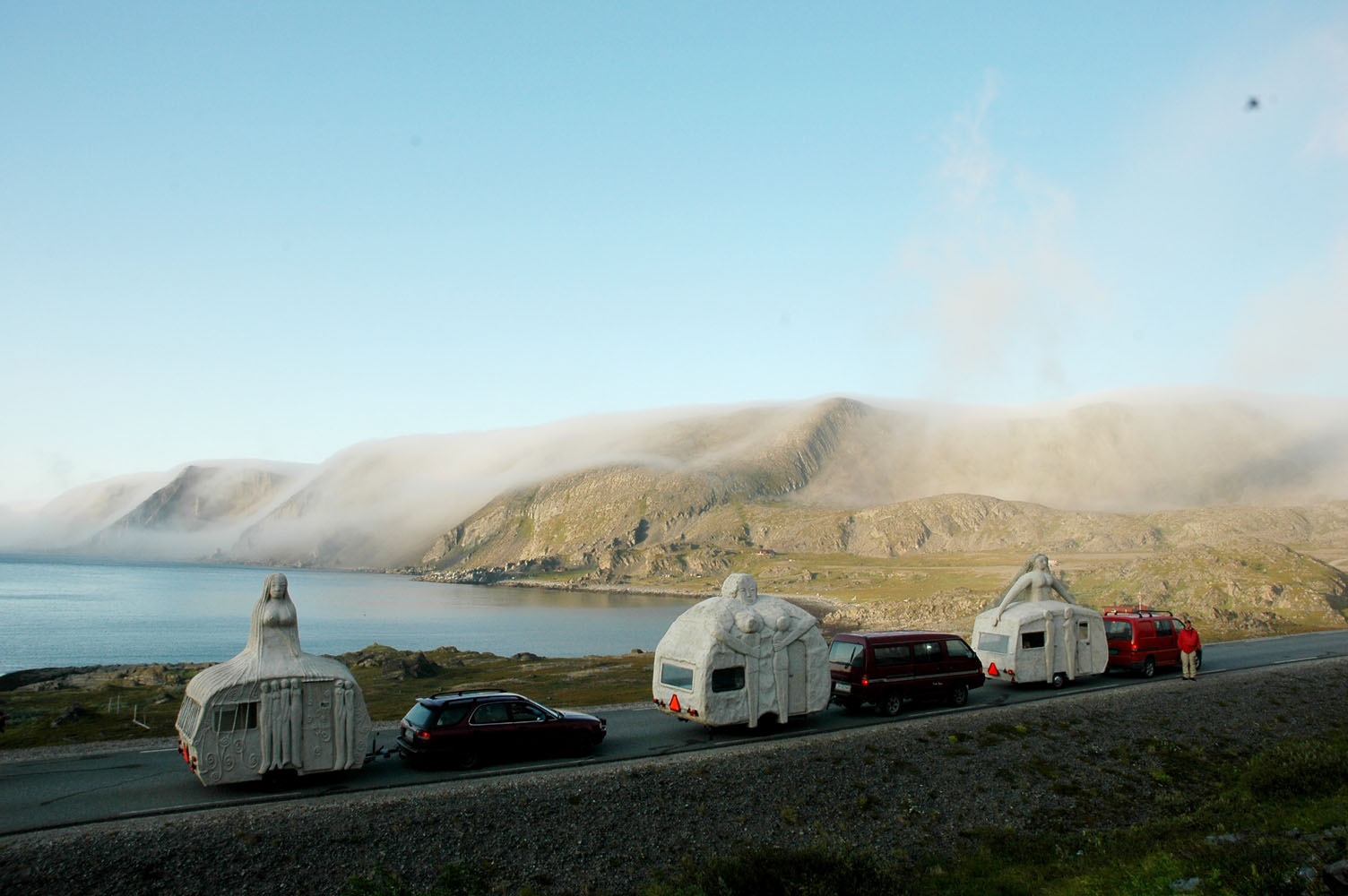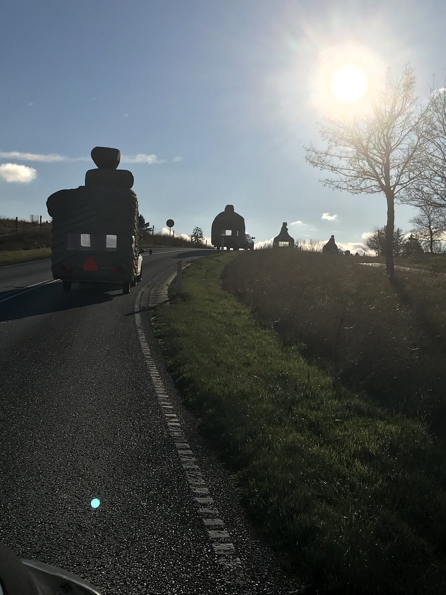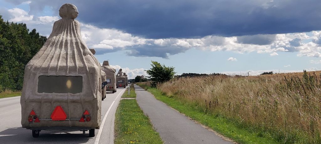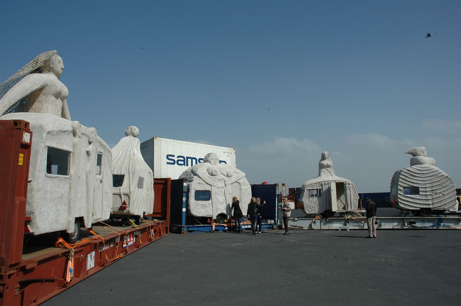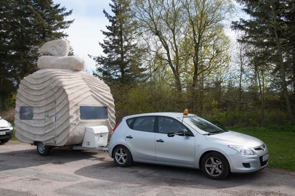 Skulpturerne er i kørbar stand, de ankommer bag hver sin bil og har været på lange campingture i Norge, Danmark og på Island.