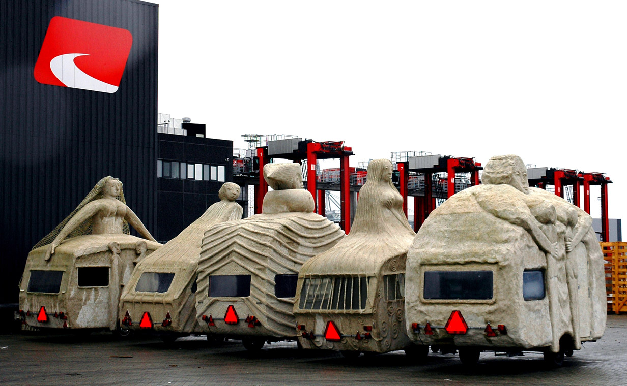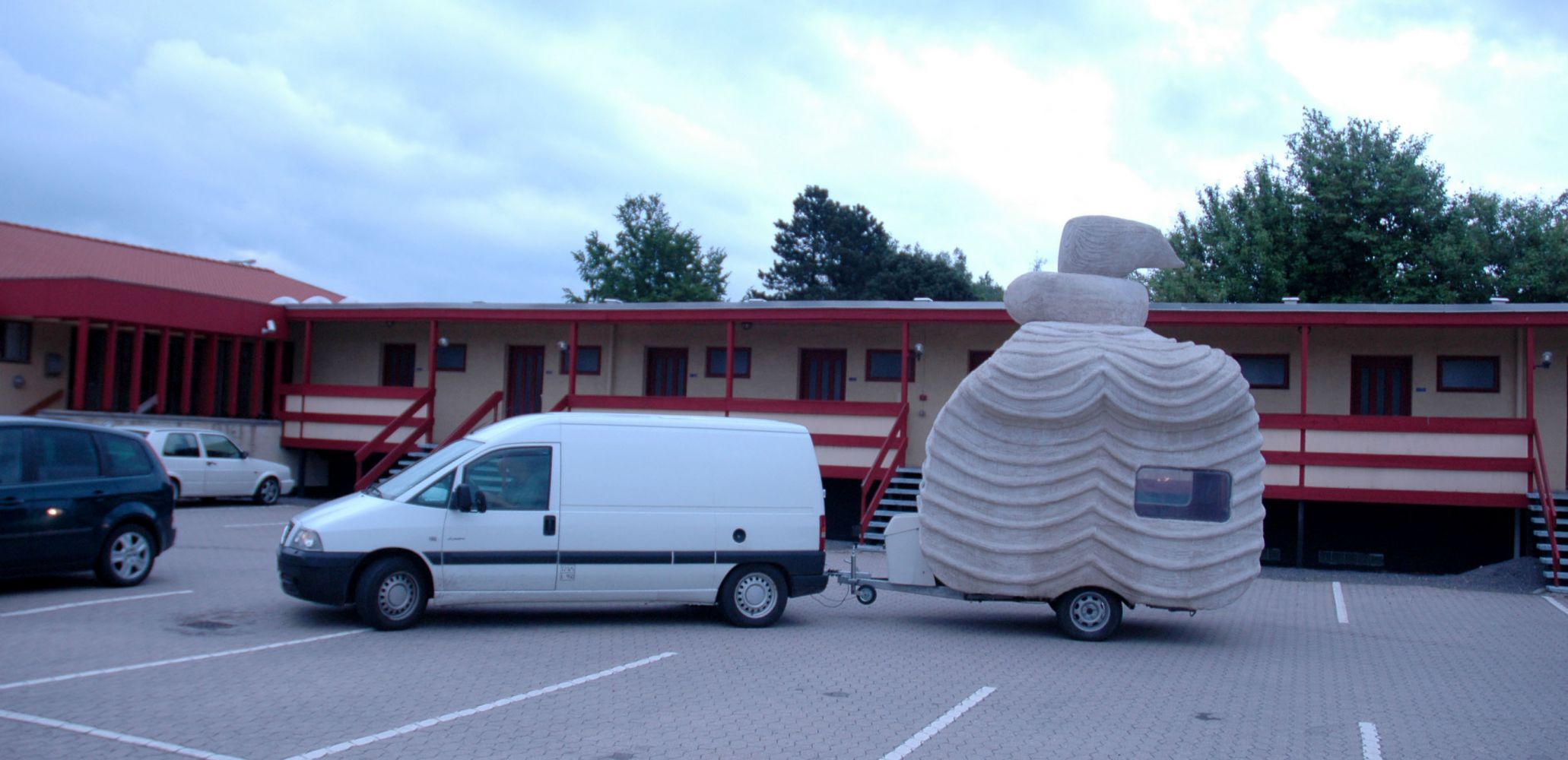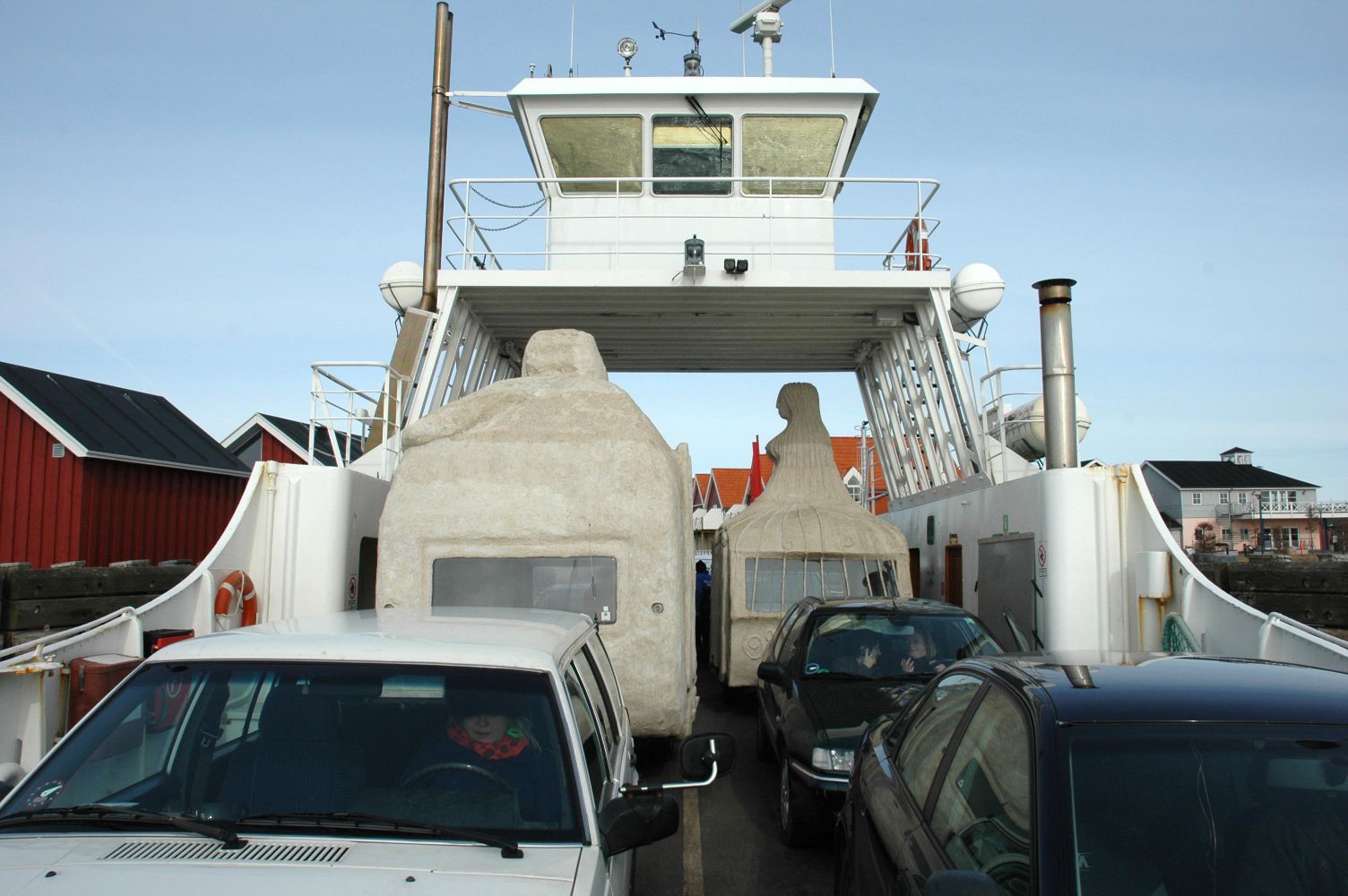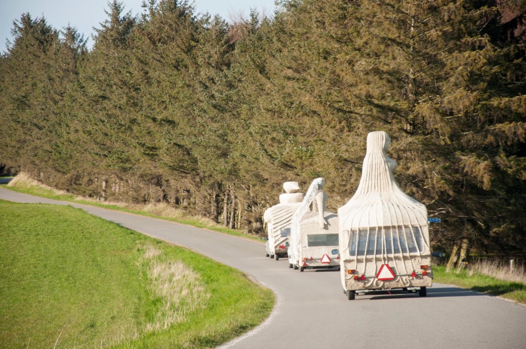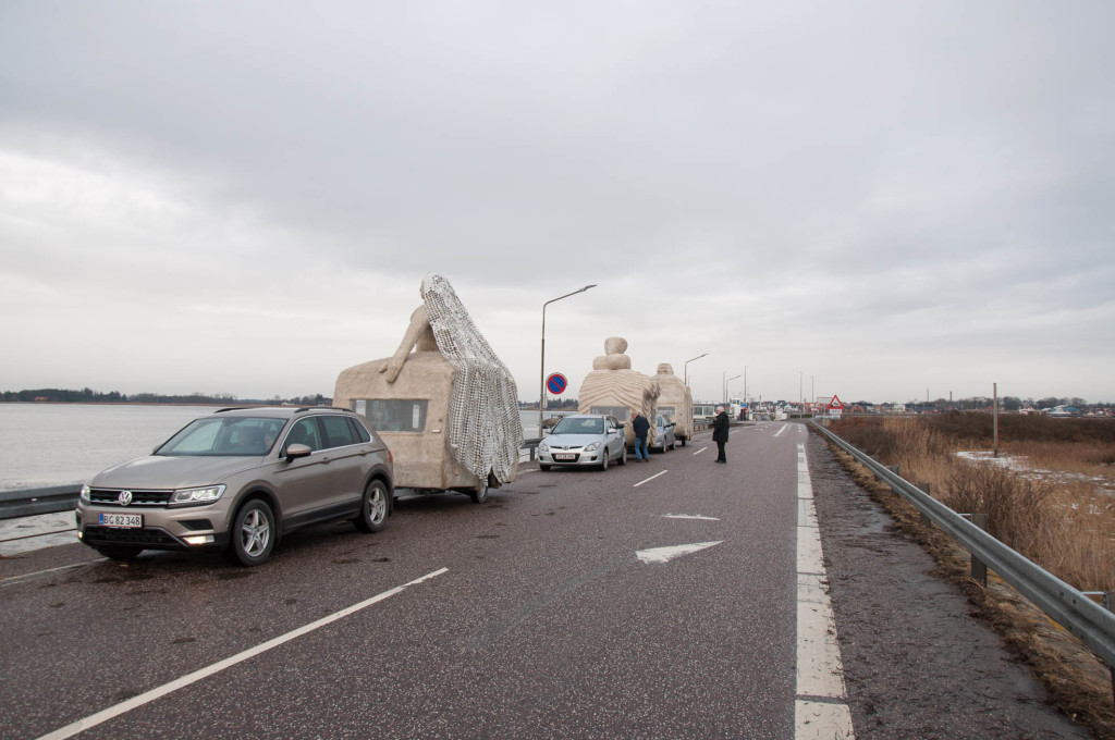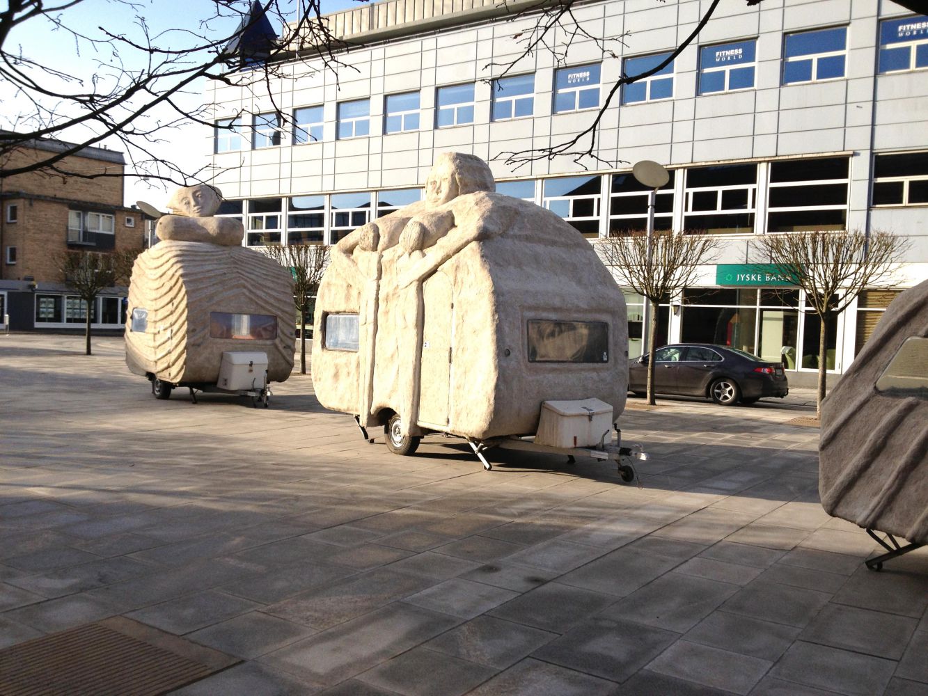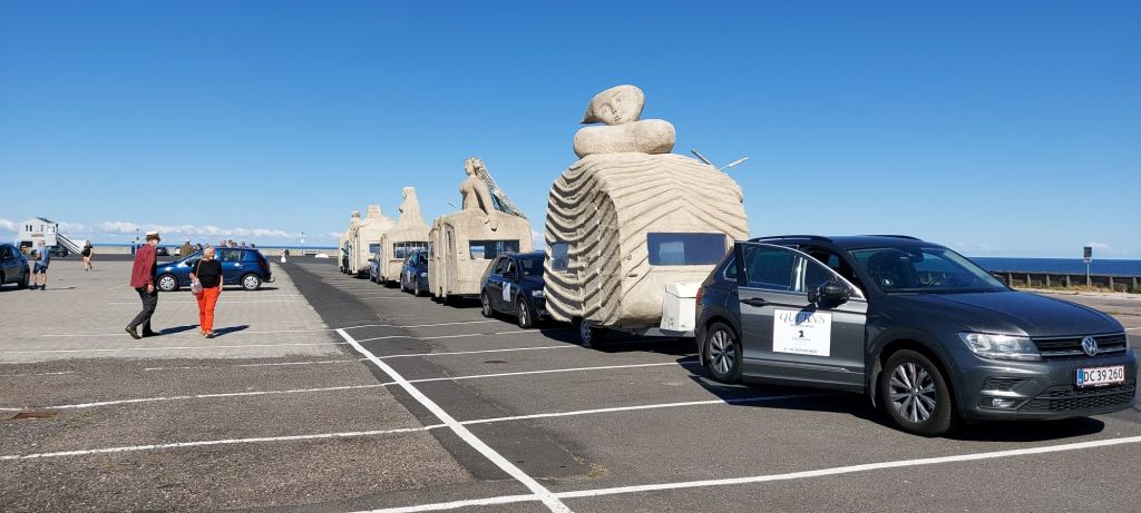 Skulpturerne er i kørbar stand, de ankommer bag hver sin bil og har været på lange campingture i Norge, Danmark og på Island.