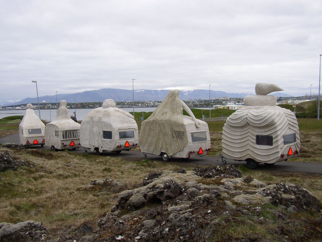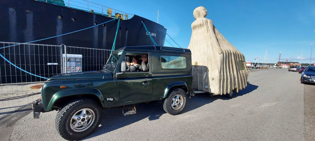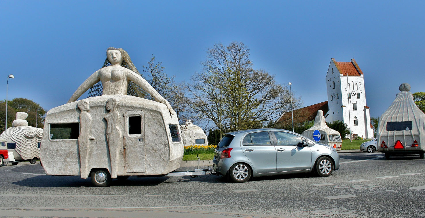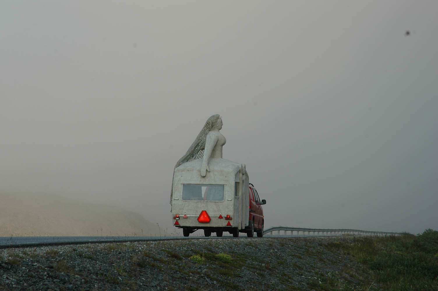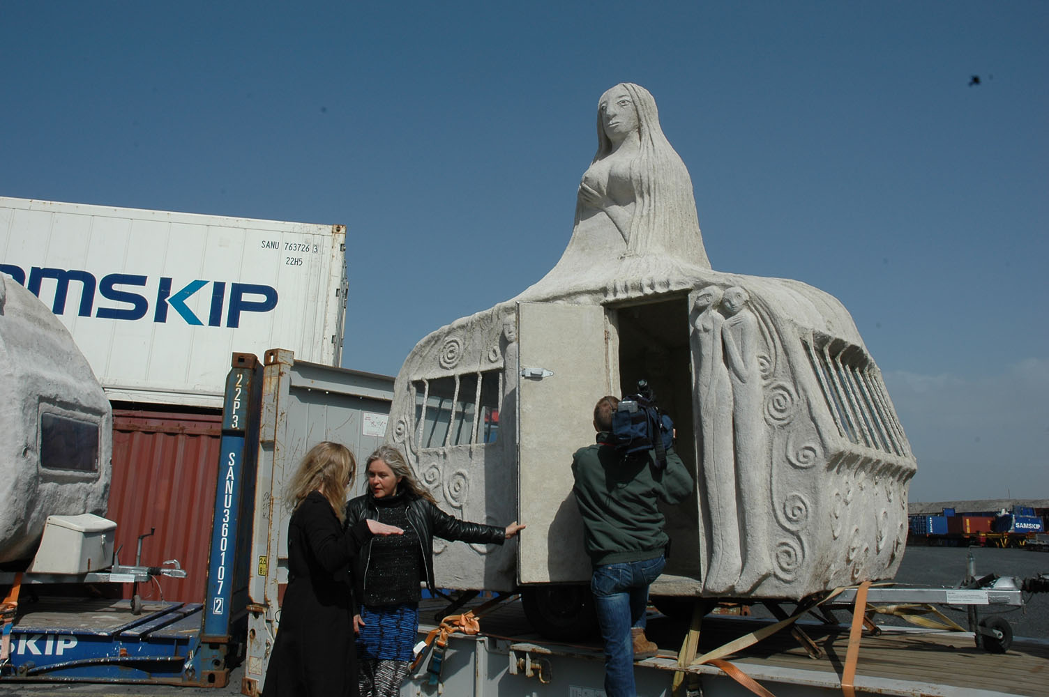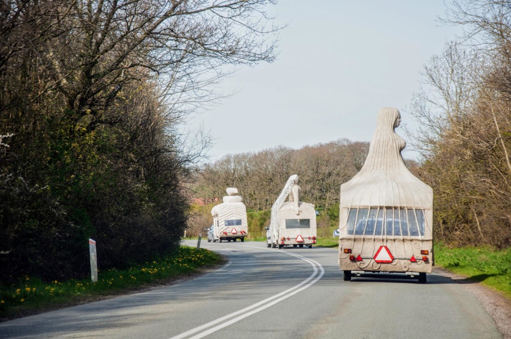 Skulpturerne er i kørbar stand, de ankommer bag hver sin bil og har været på lange campingture i Norge, Danmark og på Island.