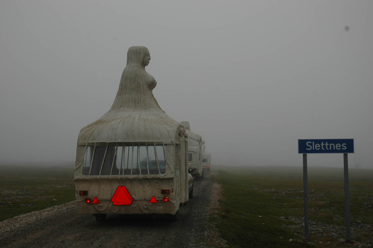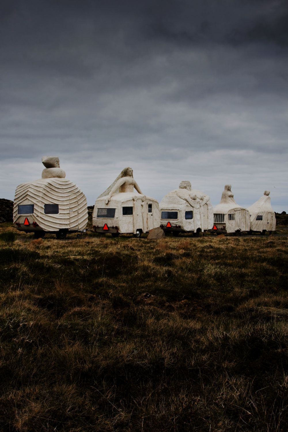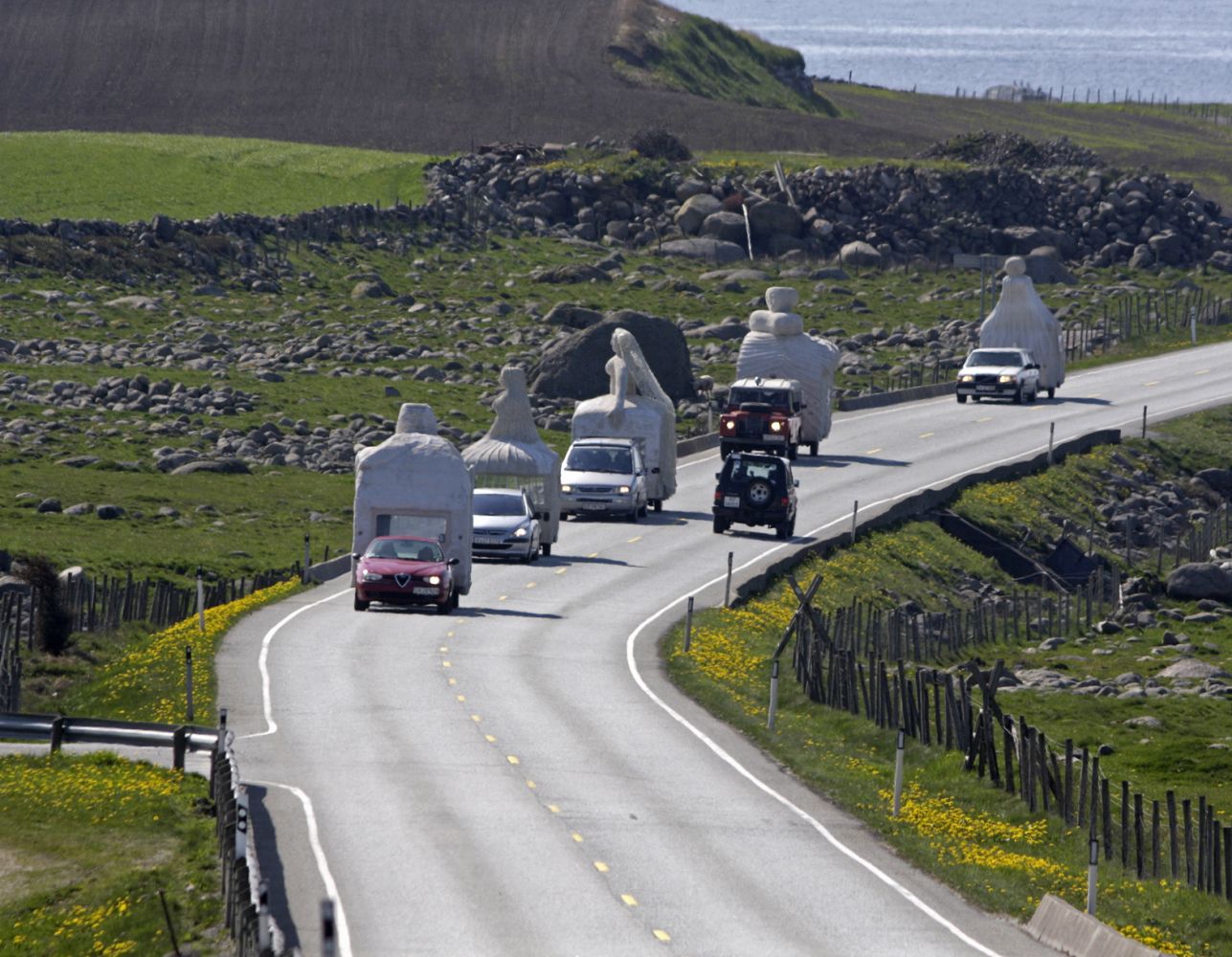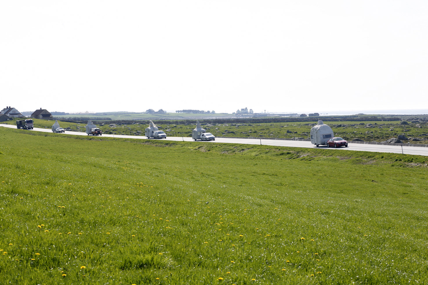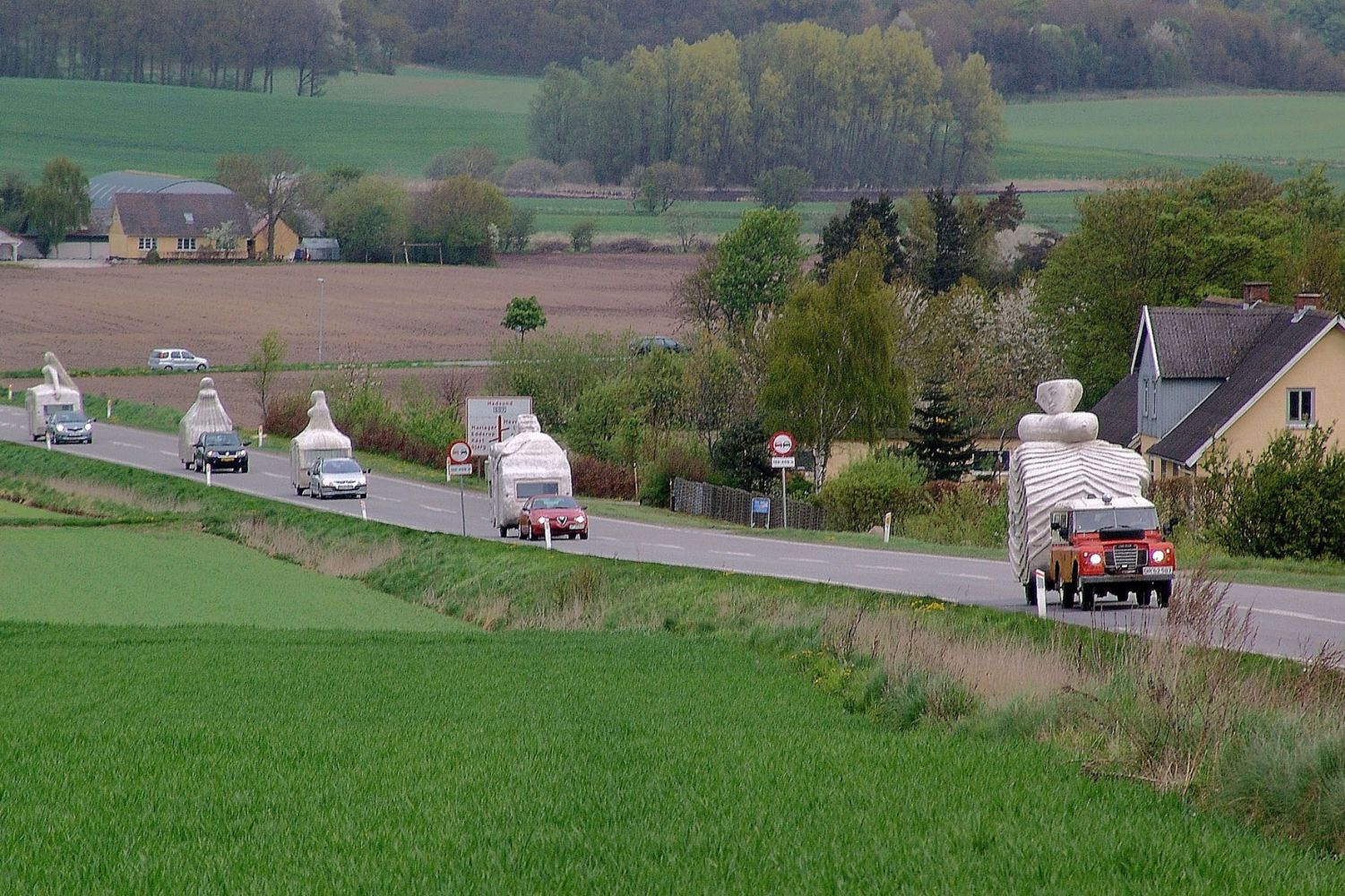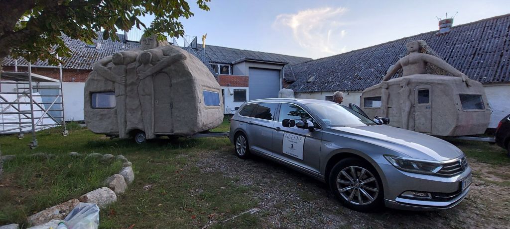 Skulpturerne er i kørbar stand, de ankommer bag hver sin bil og har været på lange campingture i Norge, Danmark og på Island.