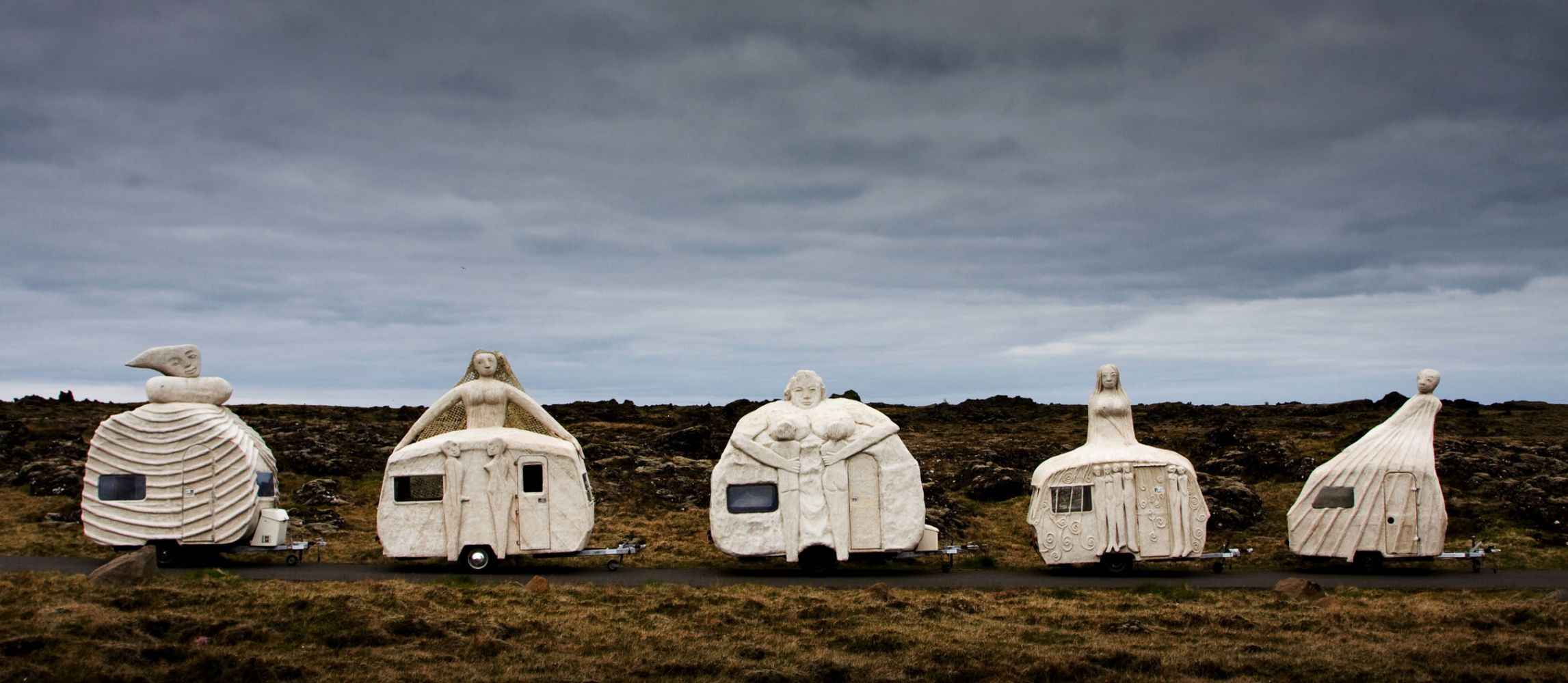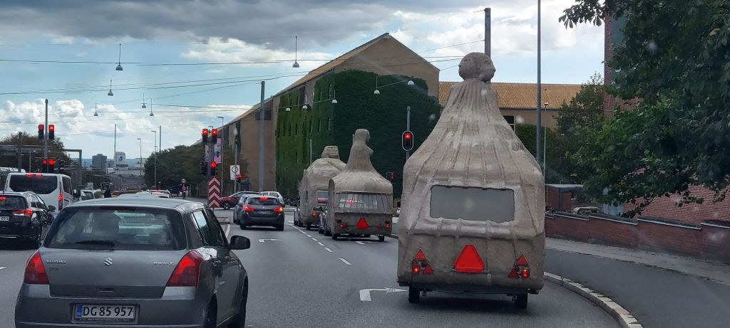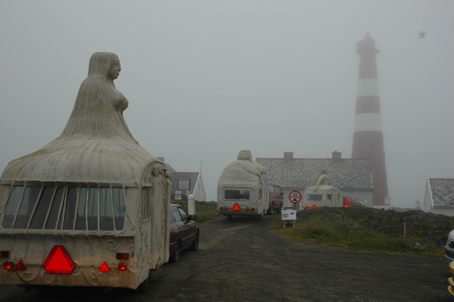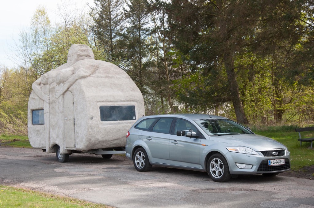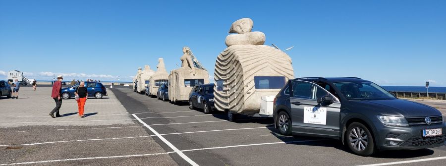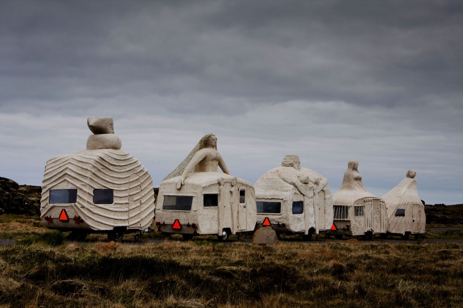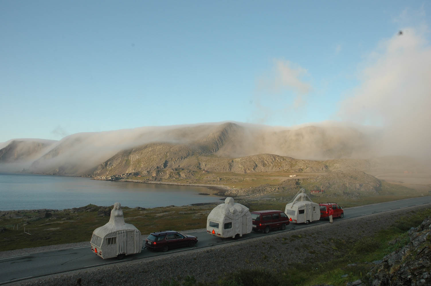 Skulpturerne er i kørbar stand, de ankommer bag hver sin bil og har været på lange campingture i Norge, Danmark og på Island.