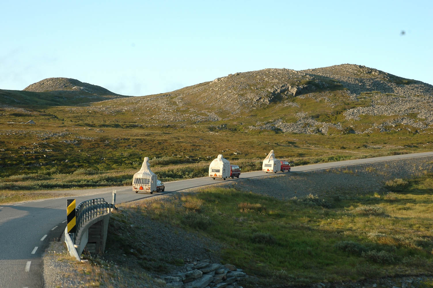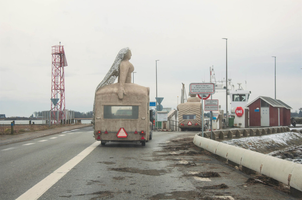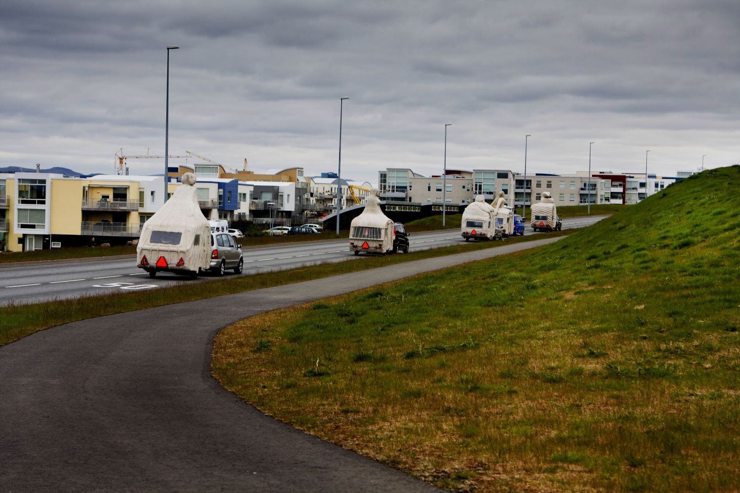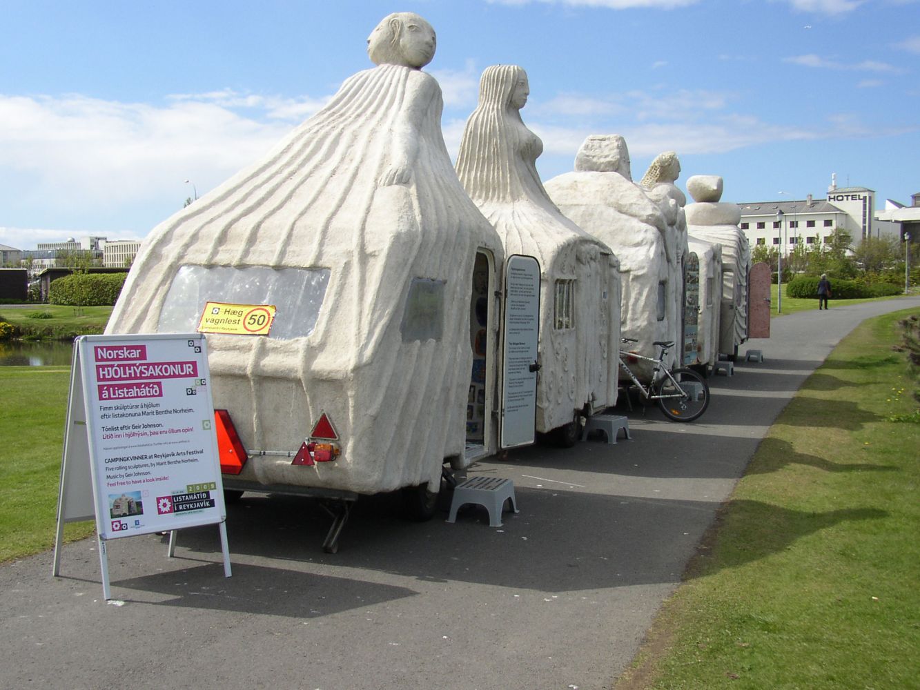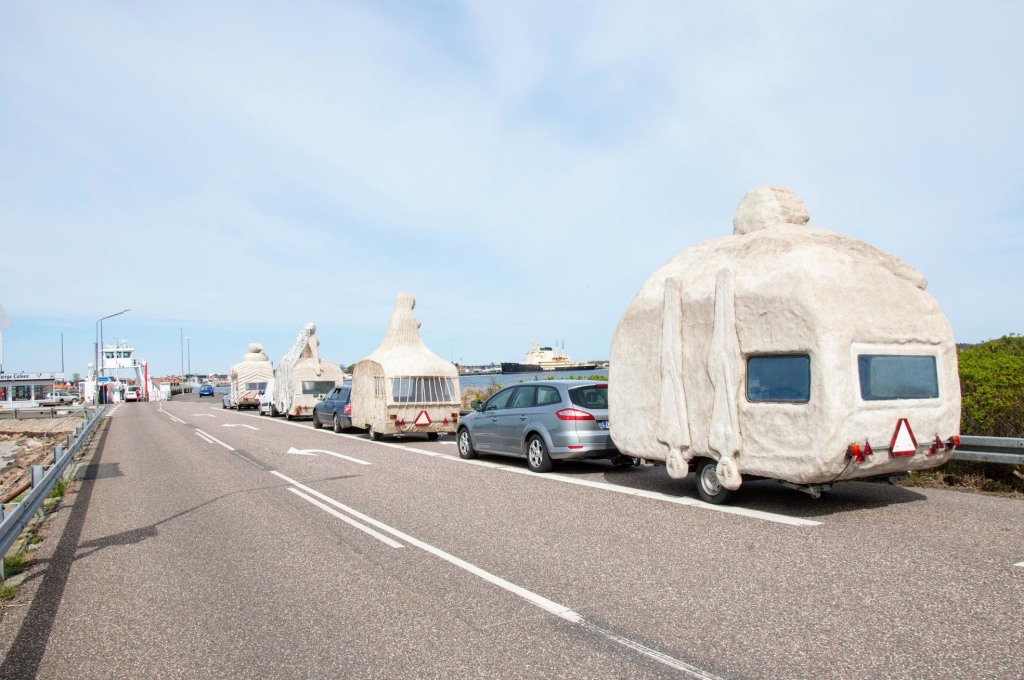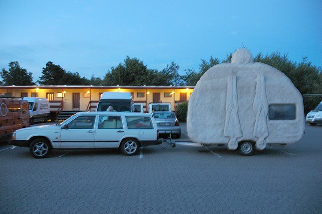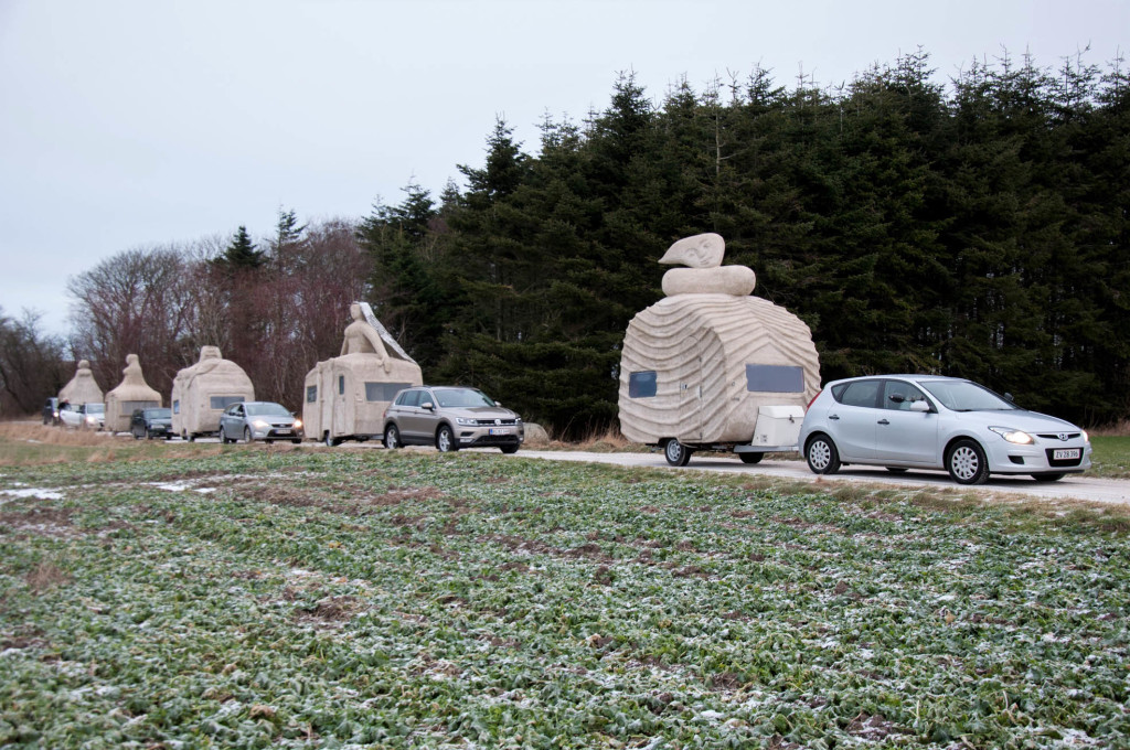 Skulpturerne er i kørbar stand, de ankommer bag hver sin bil og har været på lange campingture i Norge, Danmark og på Island.