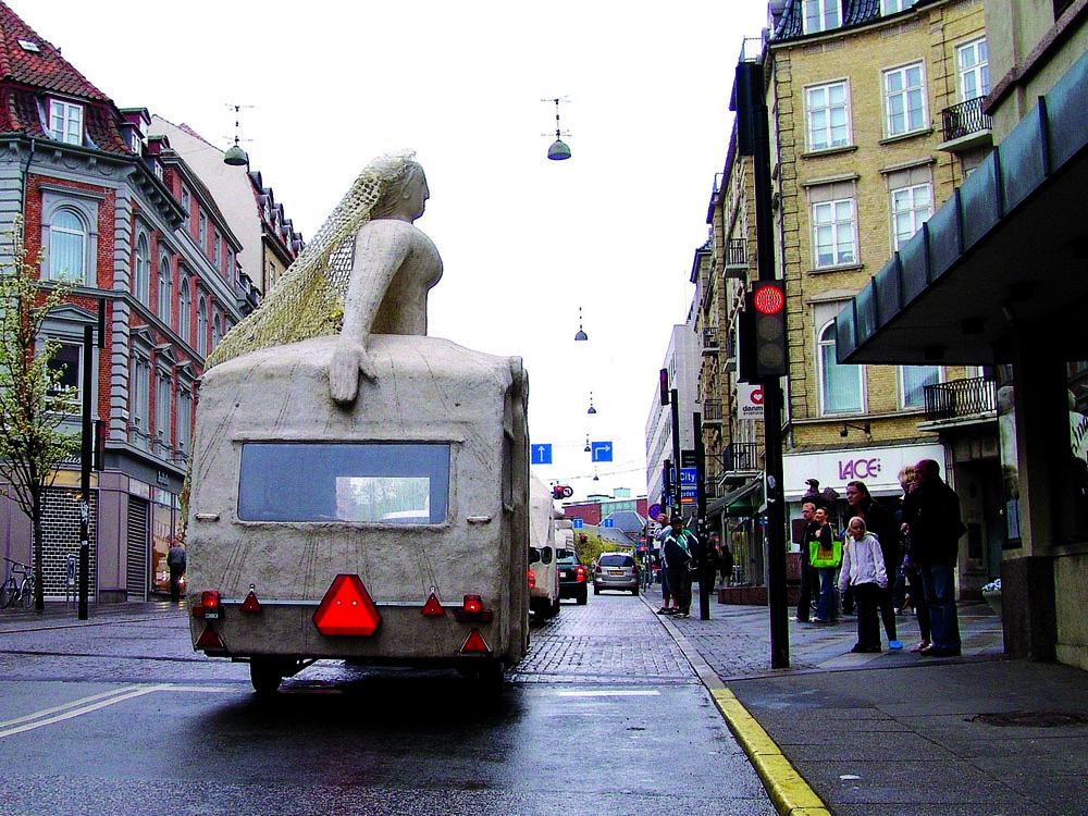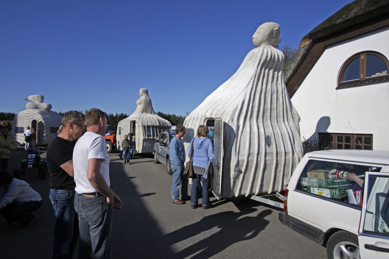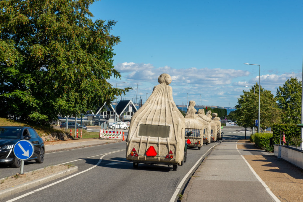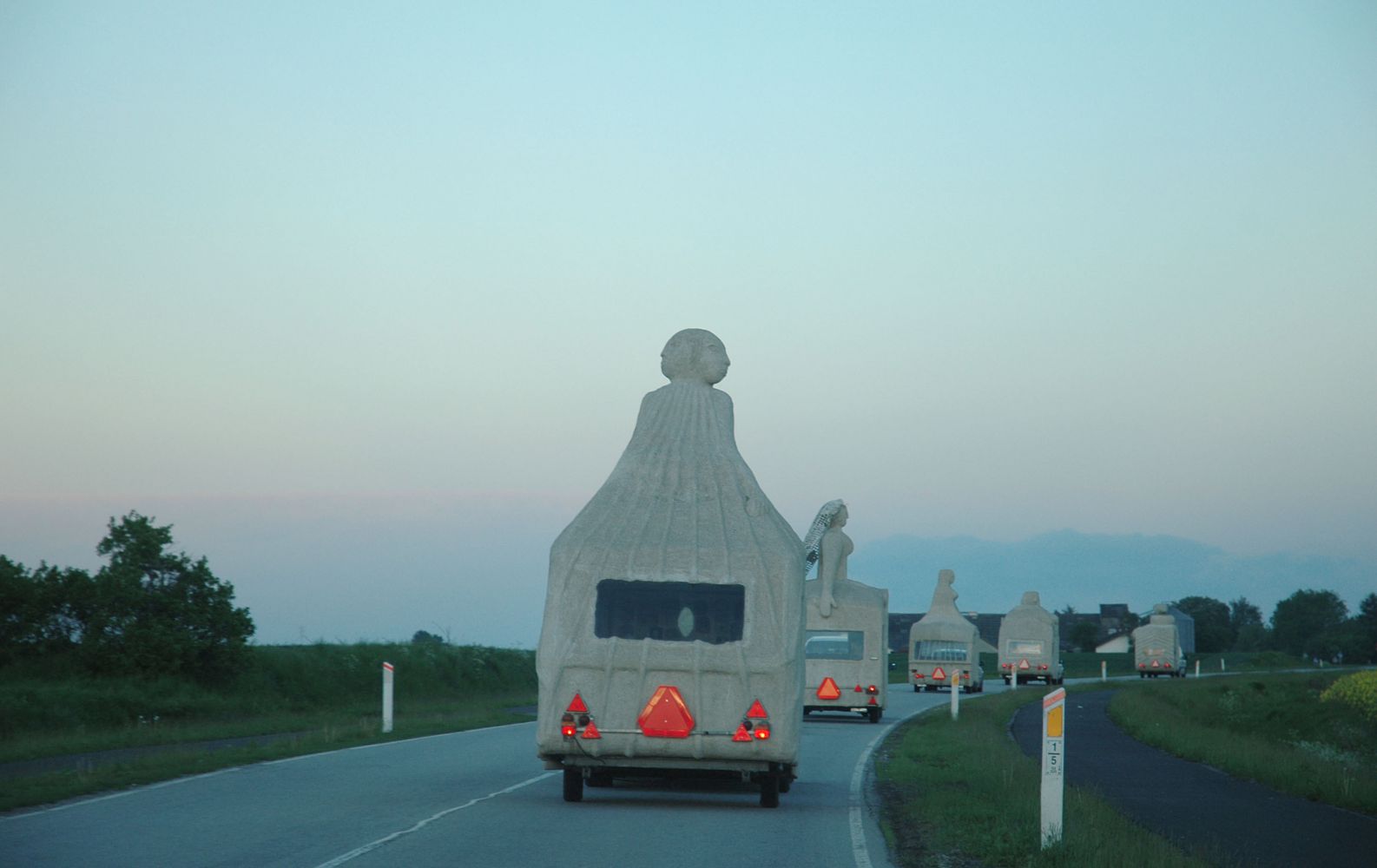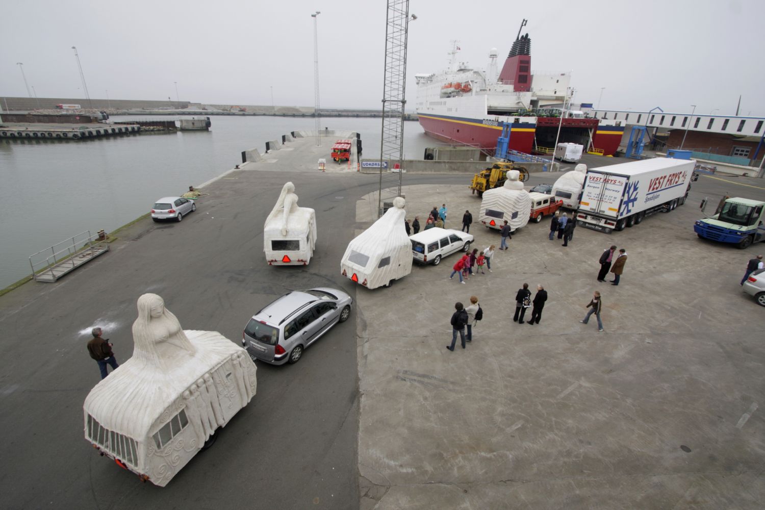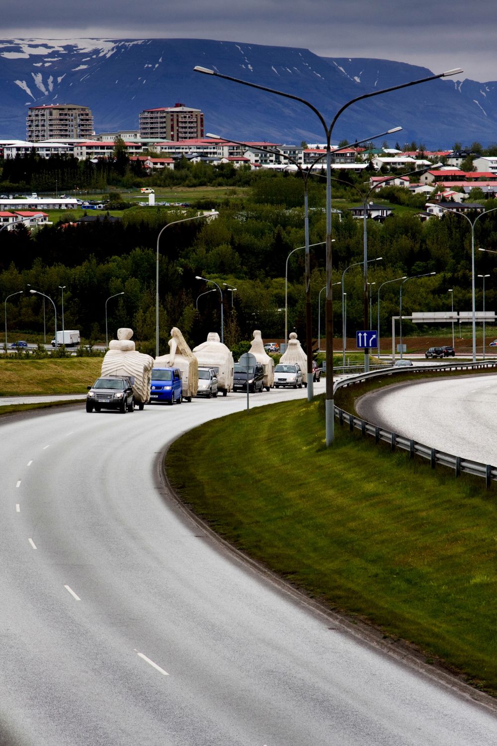 Skulpturerne er i kørbar stand, de ankommer bag hver sin bil og har været på lange campingture i Norge, Danmark og på Island.