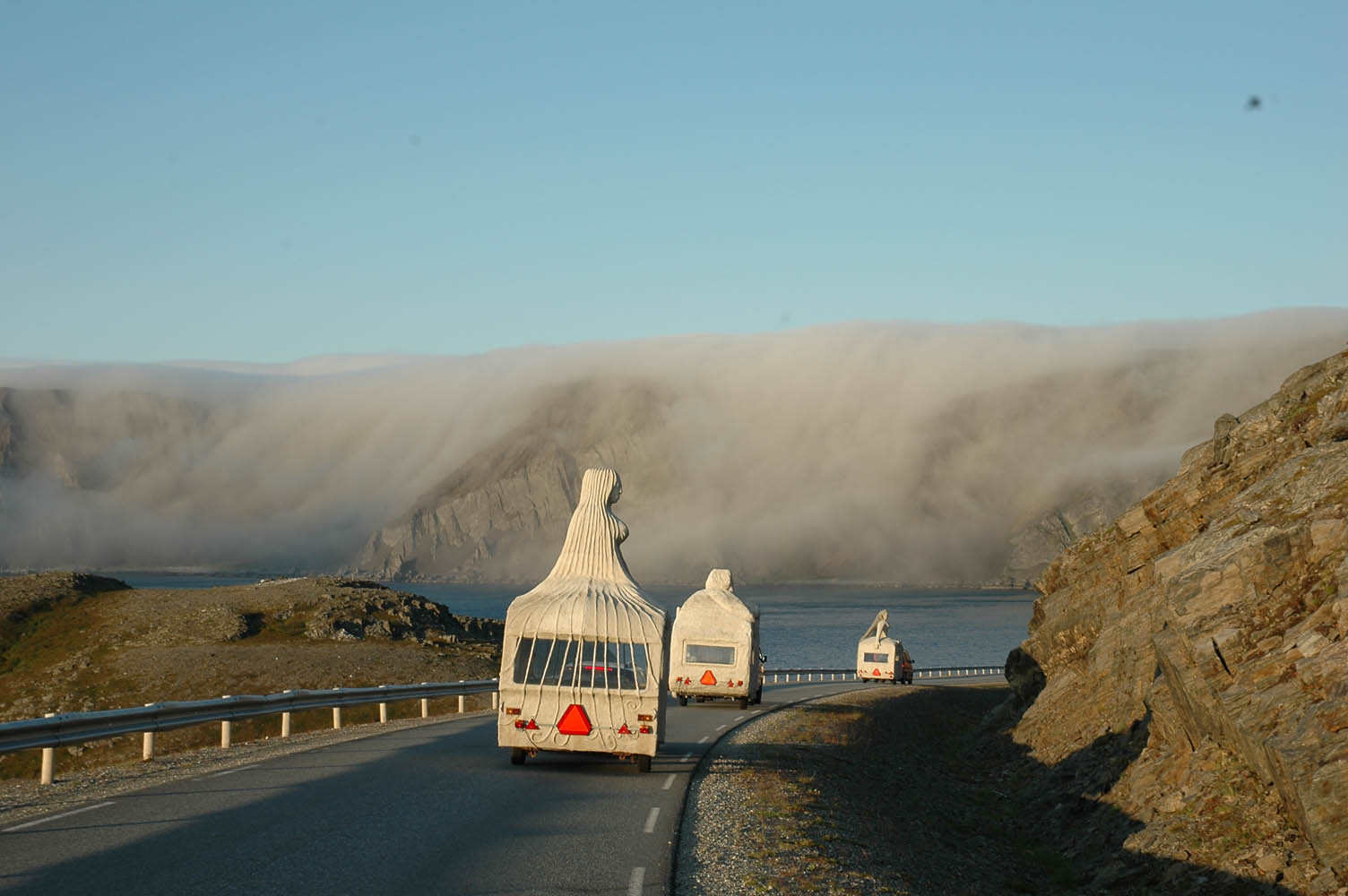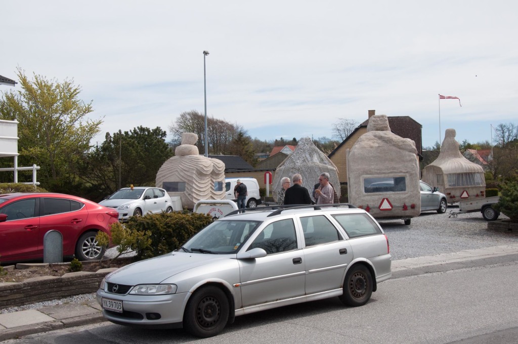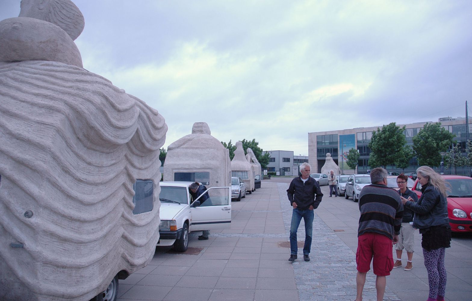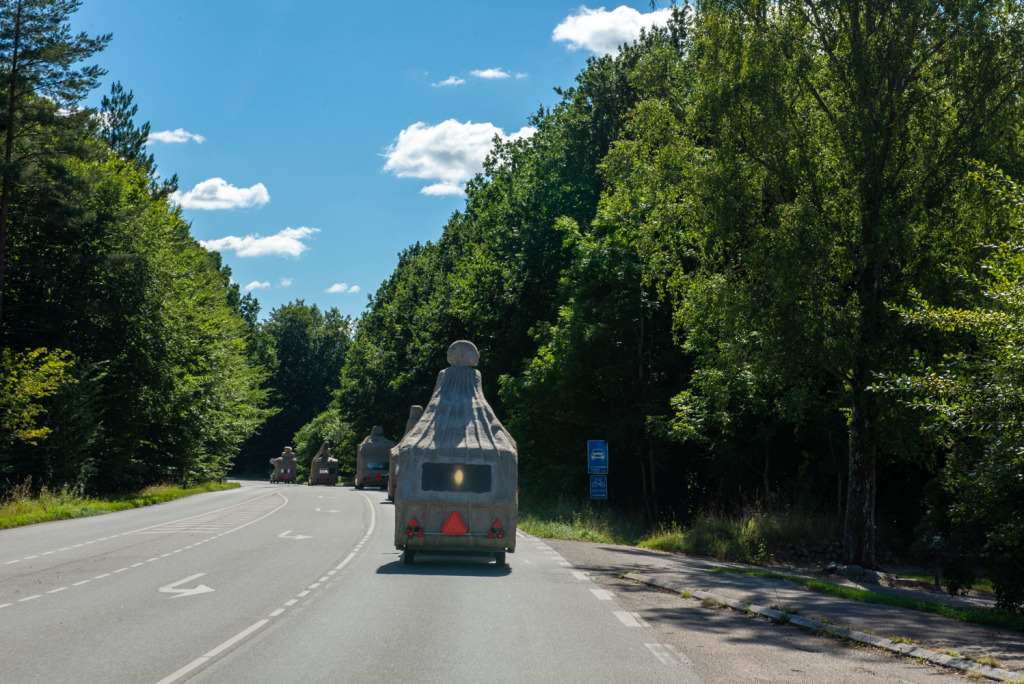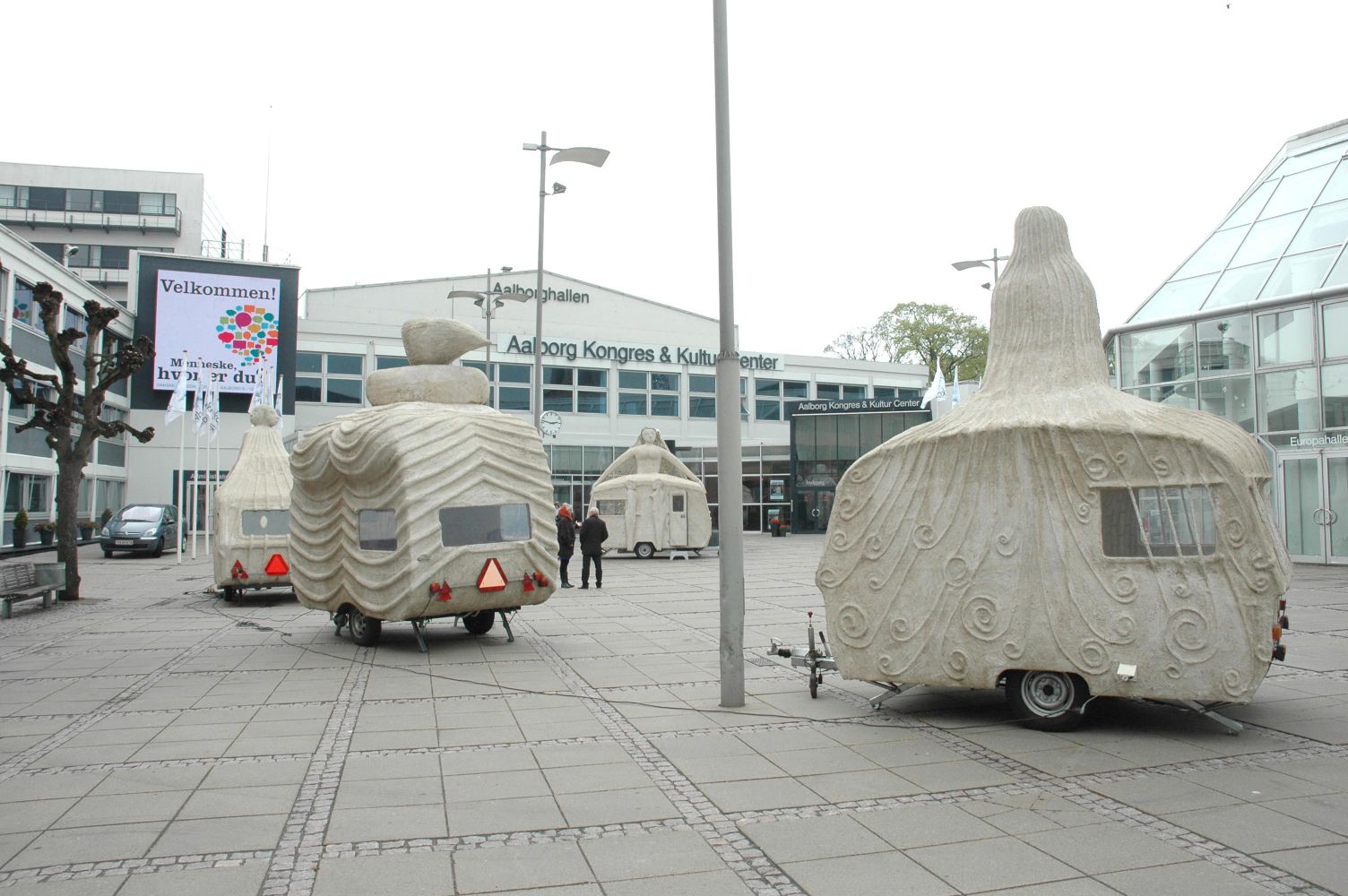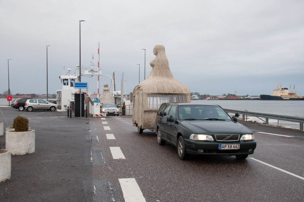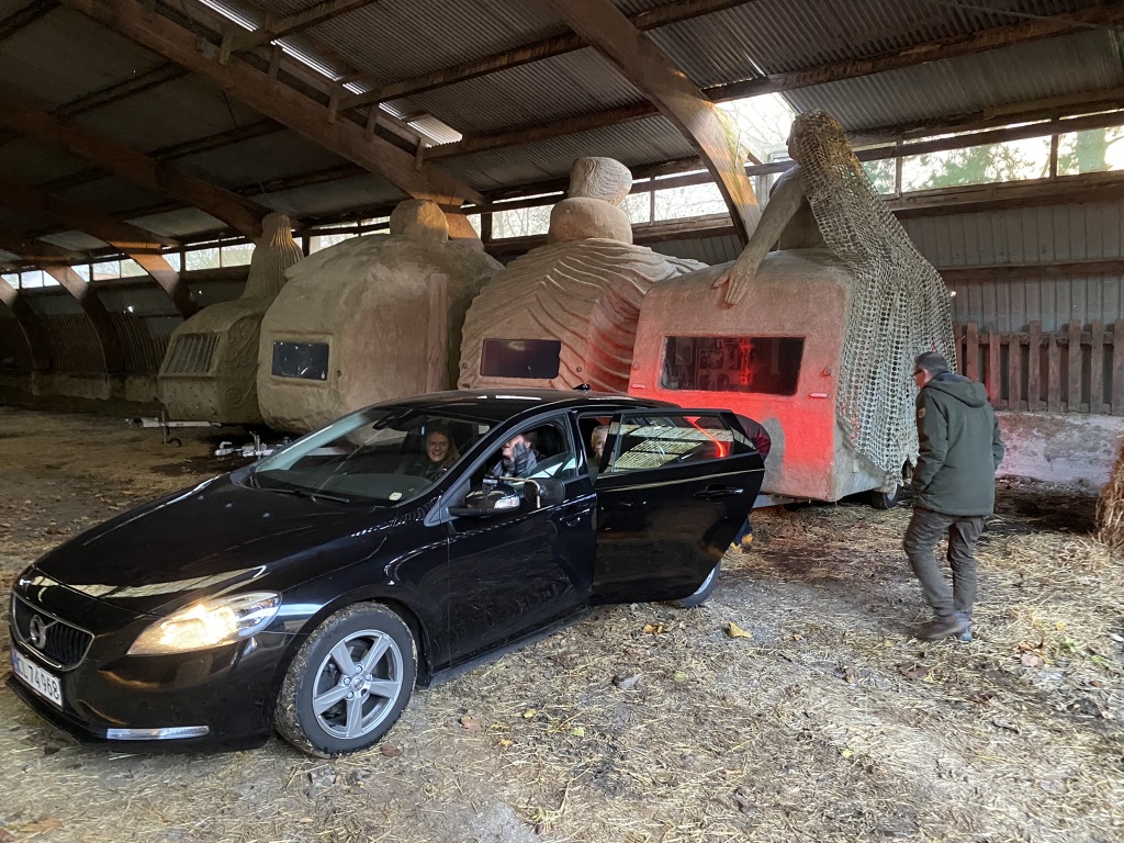 Skulpturerne er i kørbar stand, de ankommer bag hver sin bil og har været på lange campingture i Norge, Danmark og på Island.