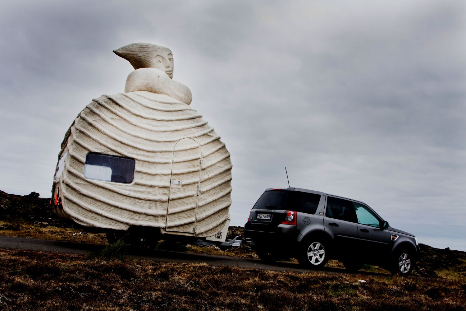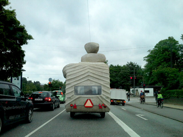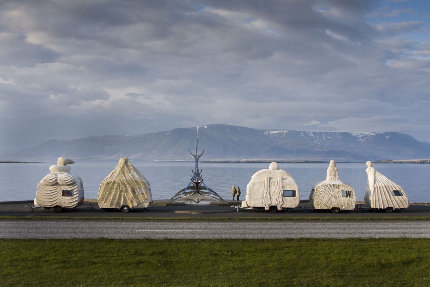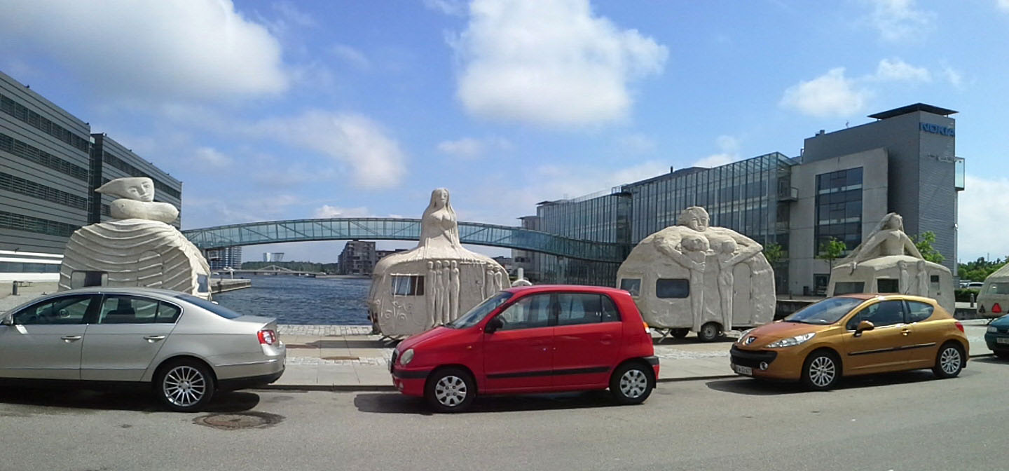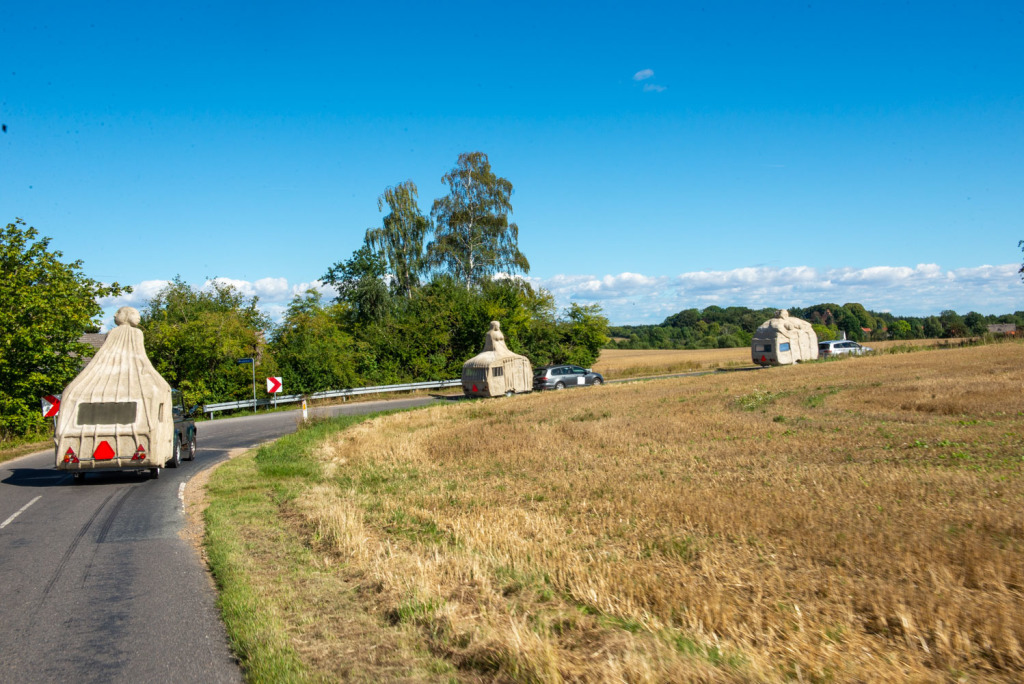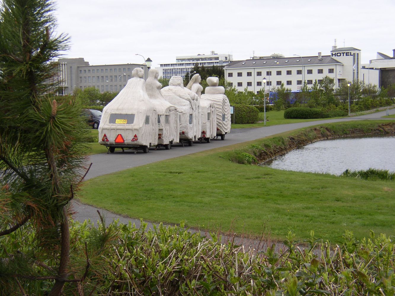 Skulpturerne er i kørbar stand, de ankommer bag hver sin bil og har været på lange campingture i Norge, Danmark og på Island.