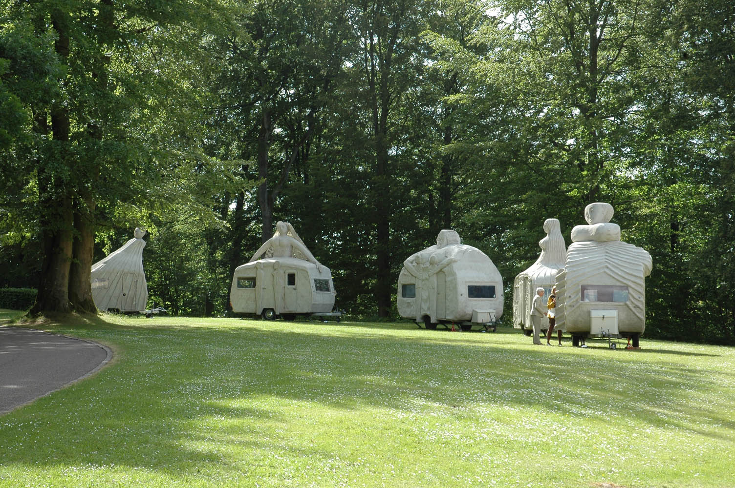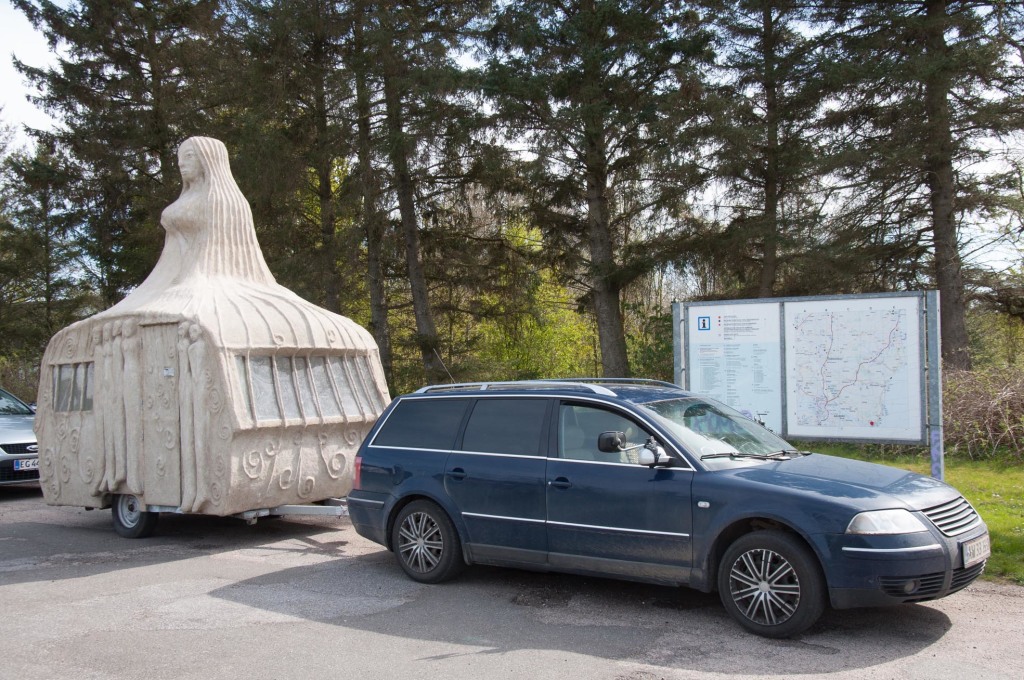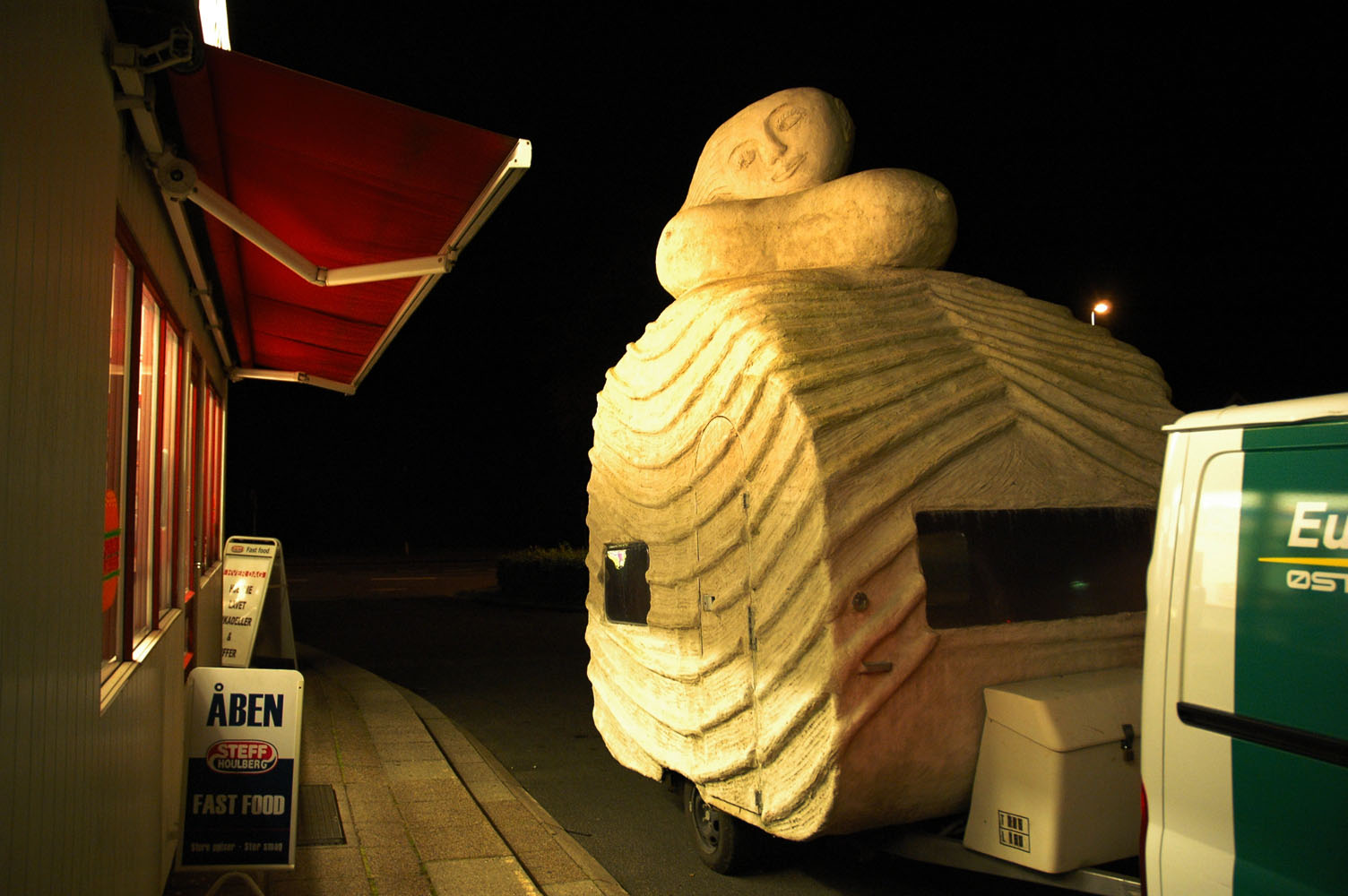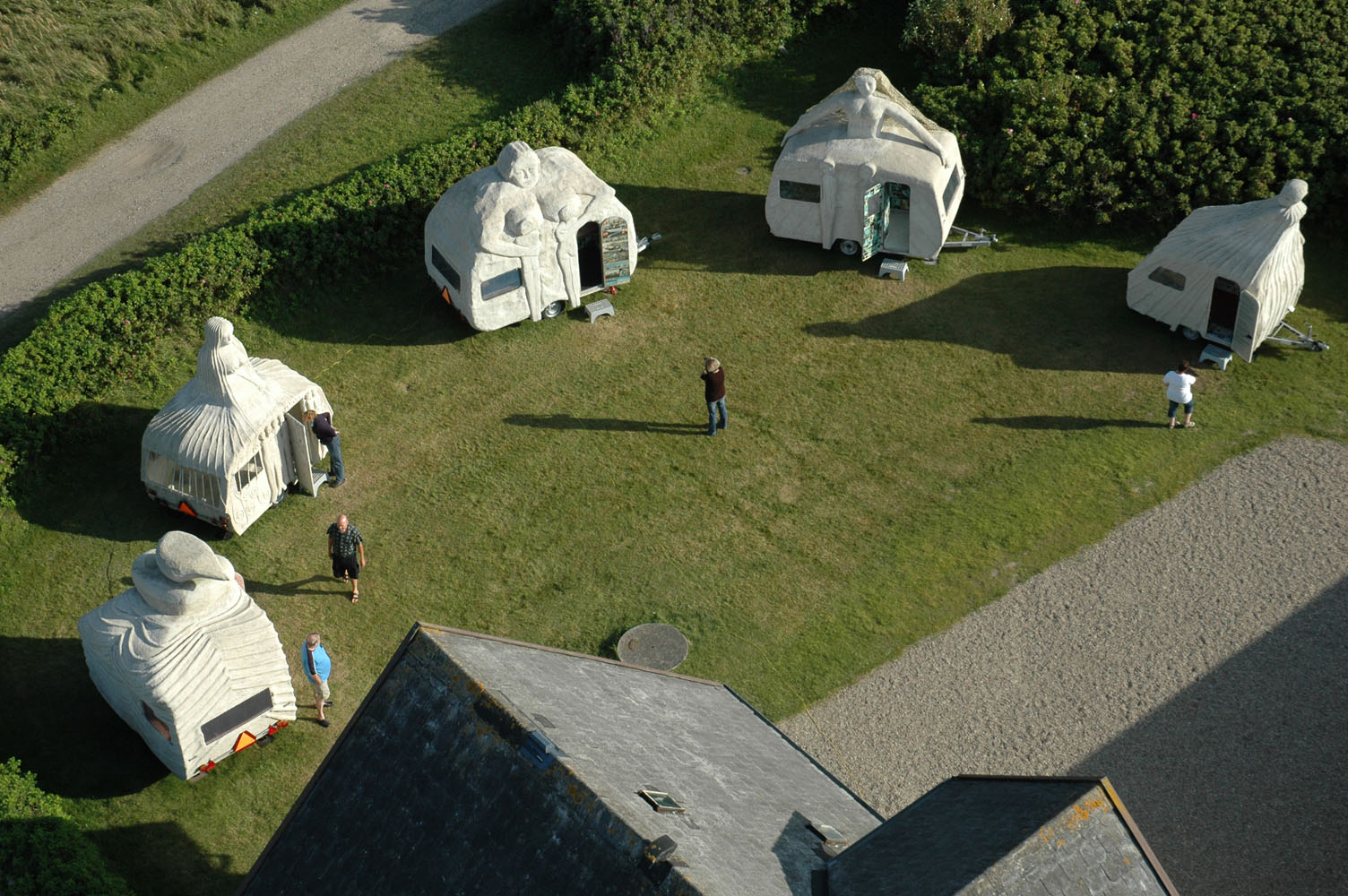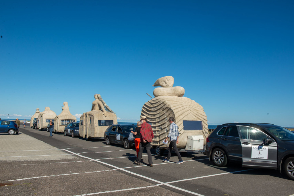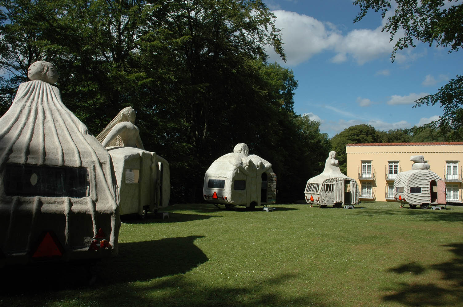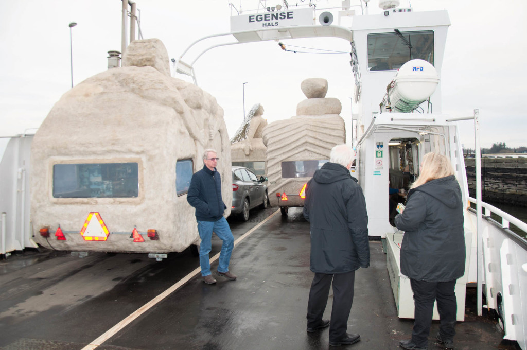 Skulpturerne er i kørbar stand, de ankommer bag hver sin bil og har været på lange campingture i Norge, Danmark og på Island.