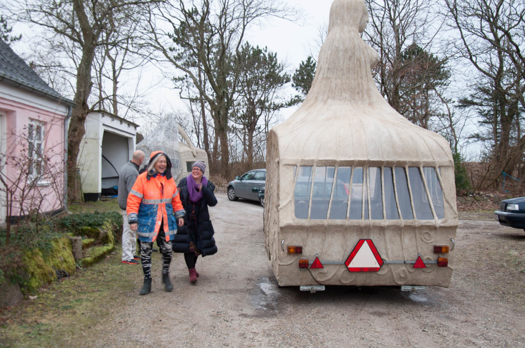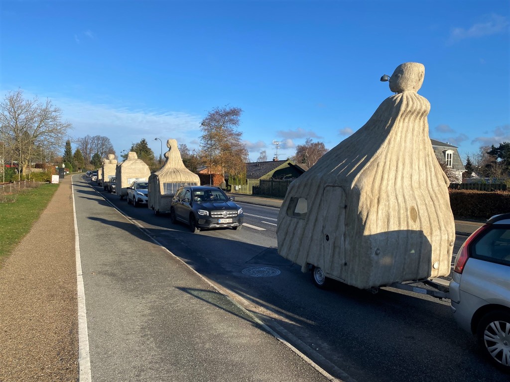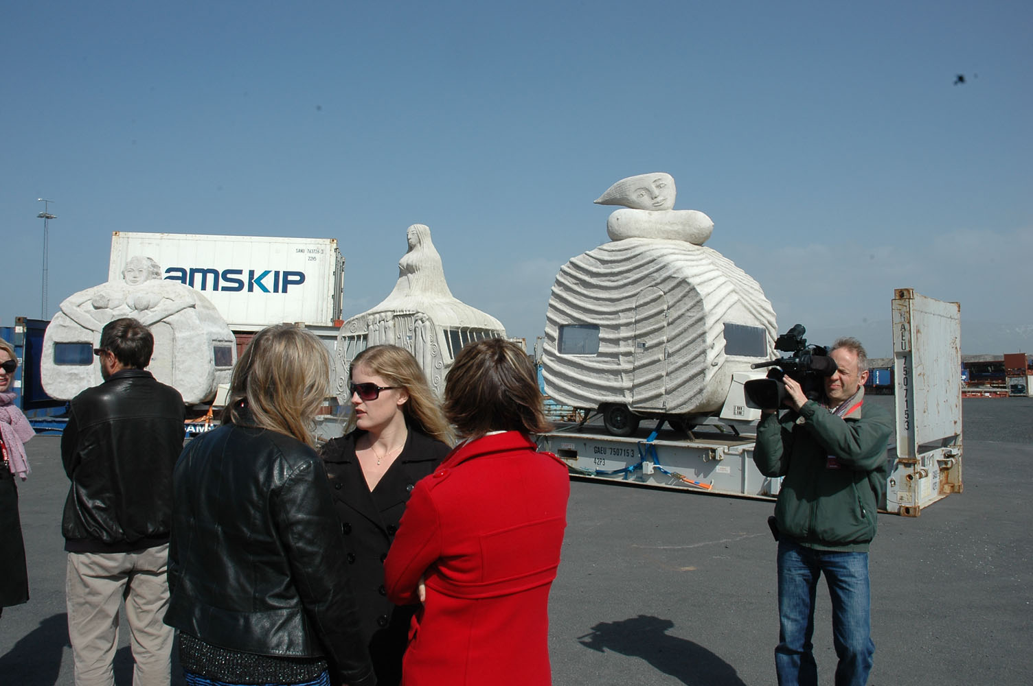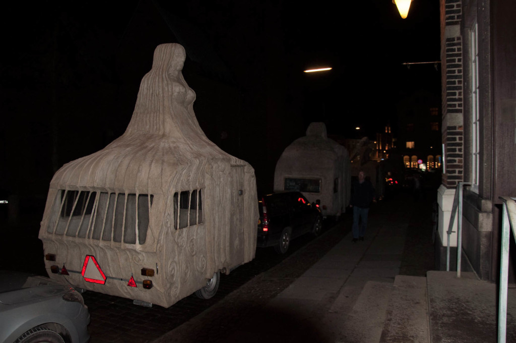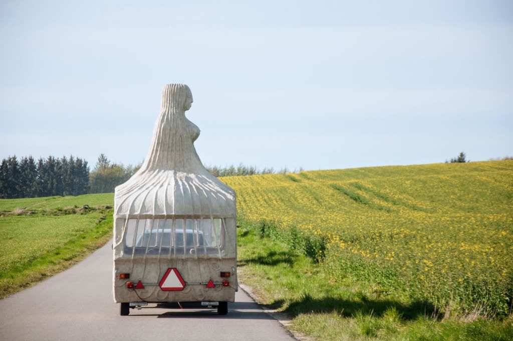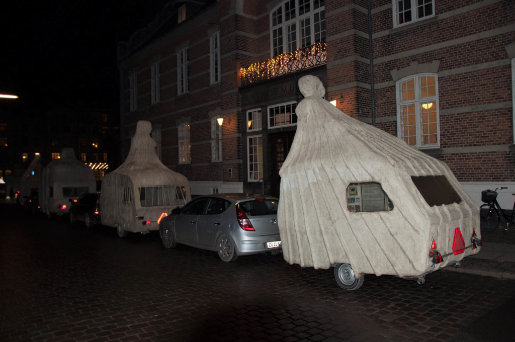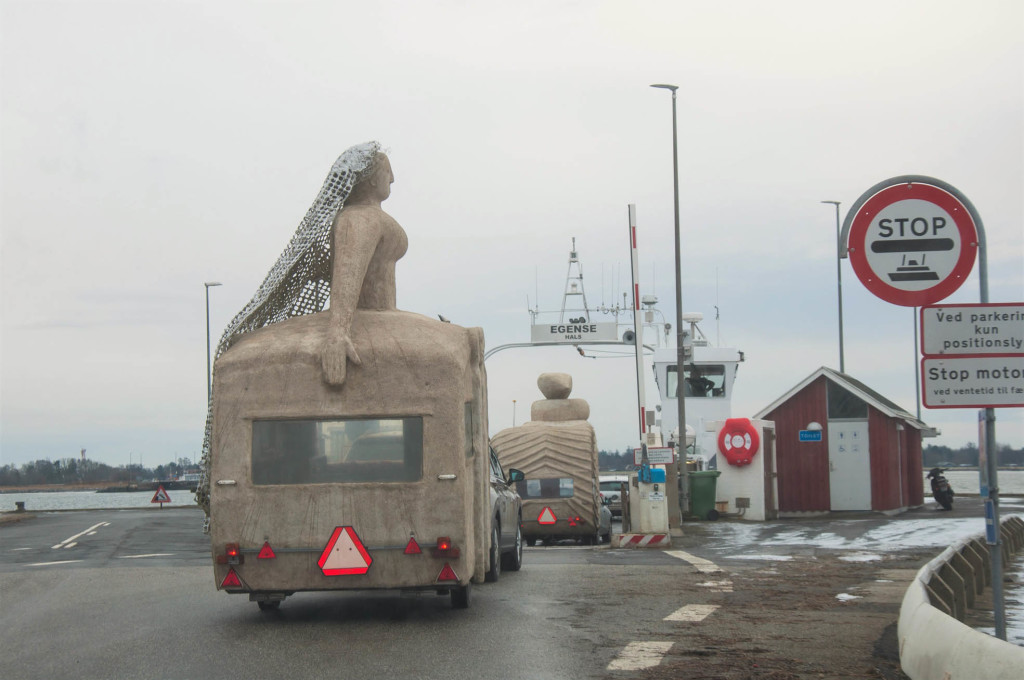Skulpturerne er i kørbar stand, de ankommer bag hver sin bil og har været på lange campingture i Norge, Danmark og på Island.