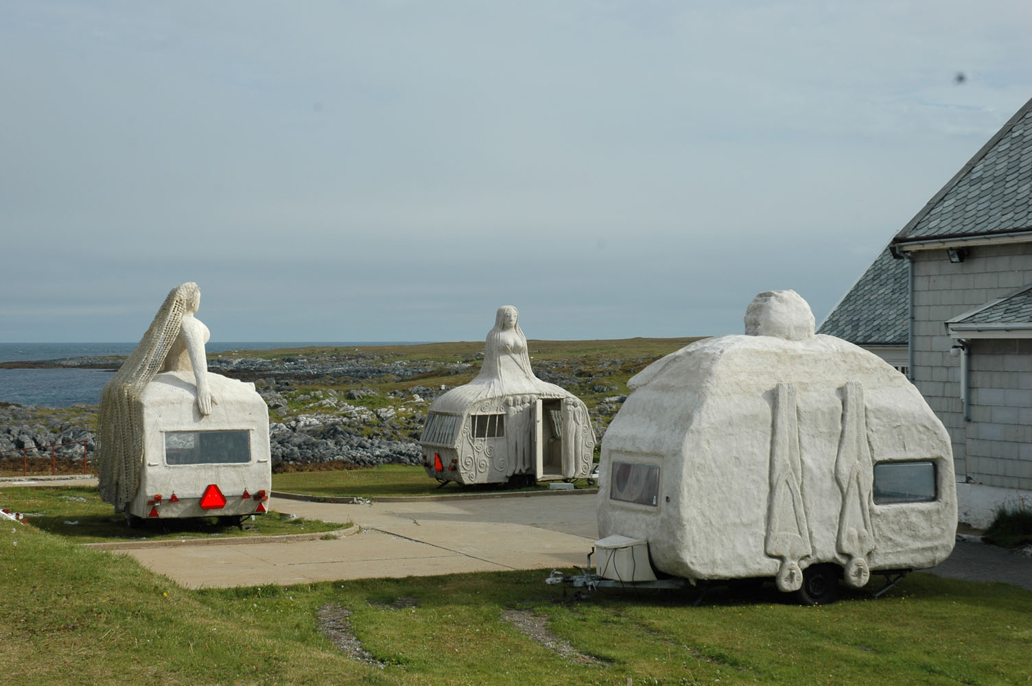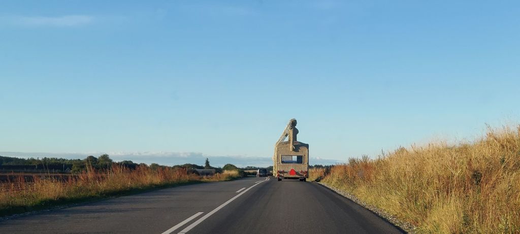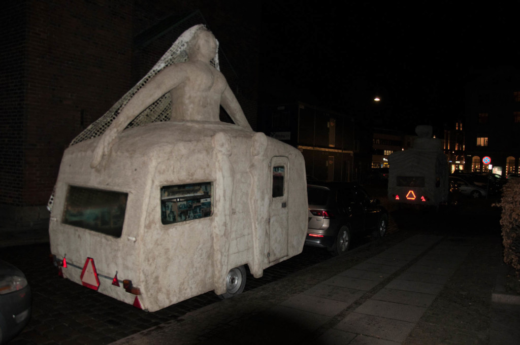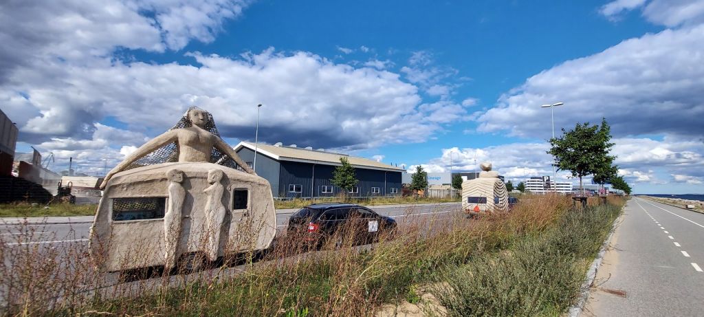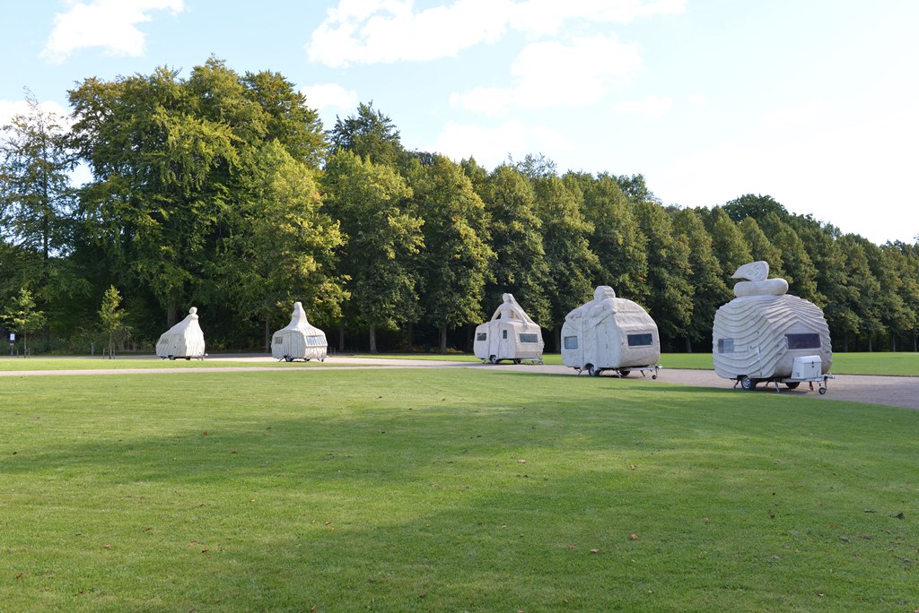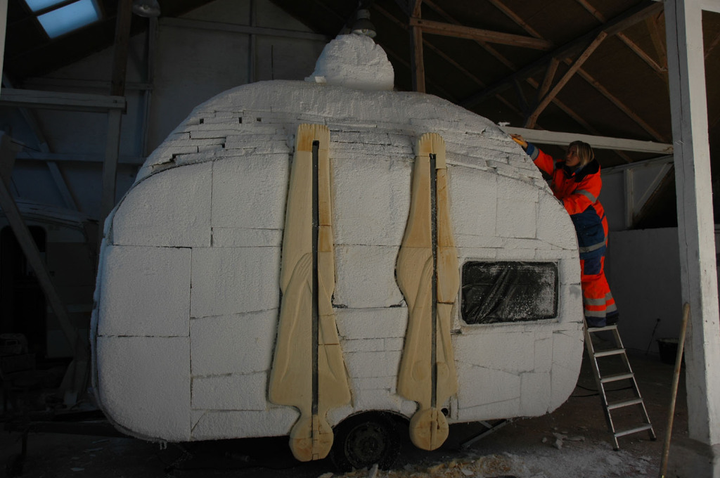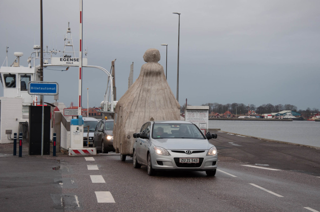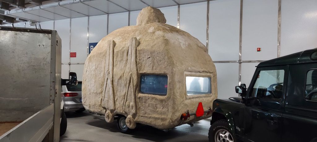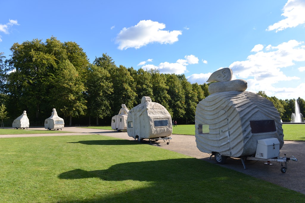 Skulpturerne er i kørbar stand, de ankommer bag hver sin bil og har været på lange campingture i Norge, Danmark og på Island.