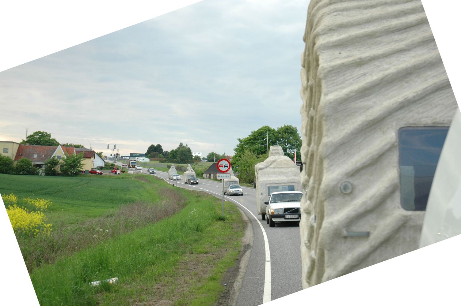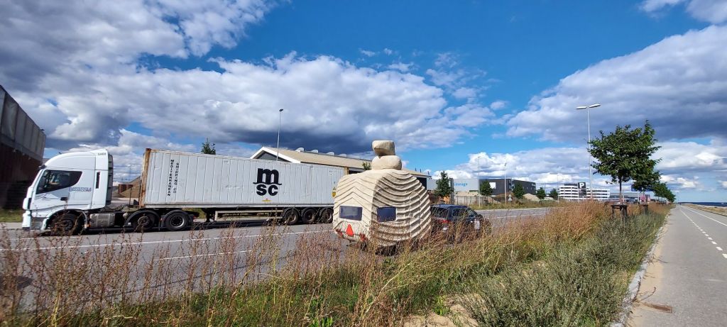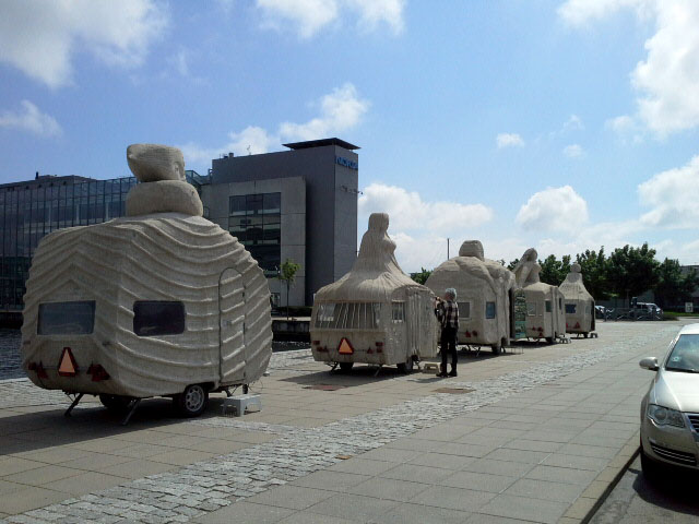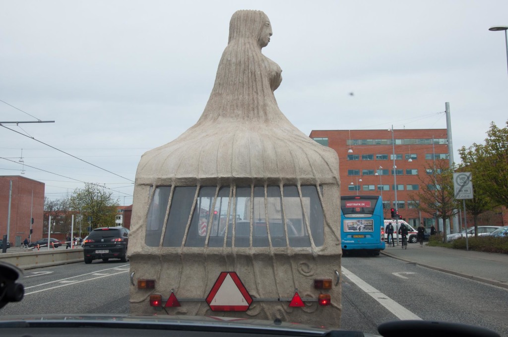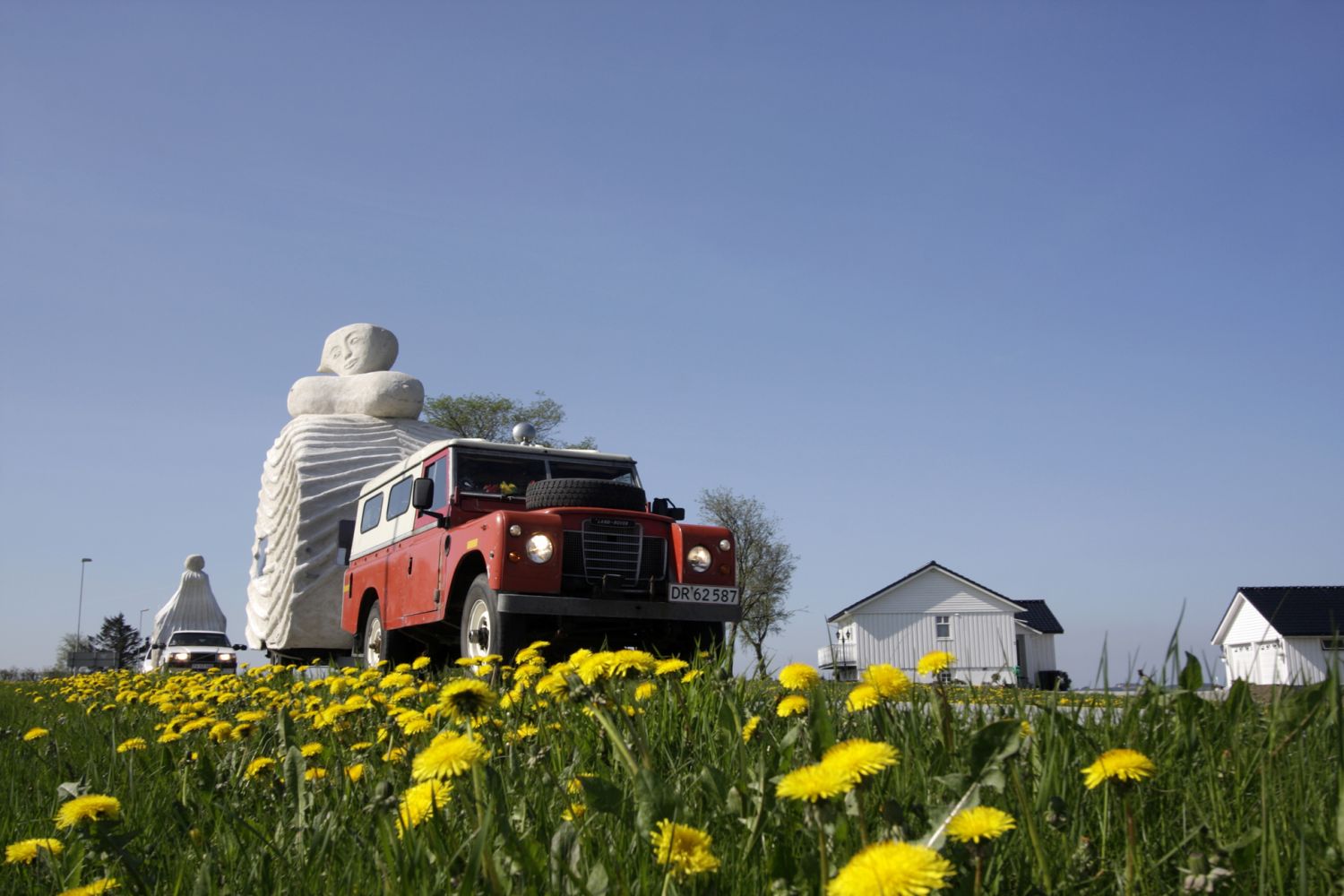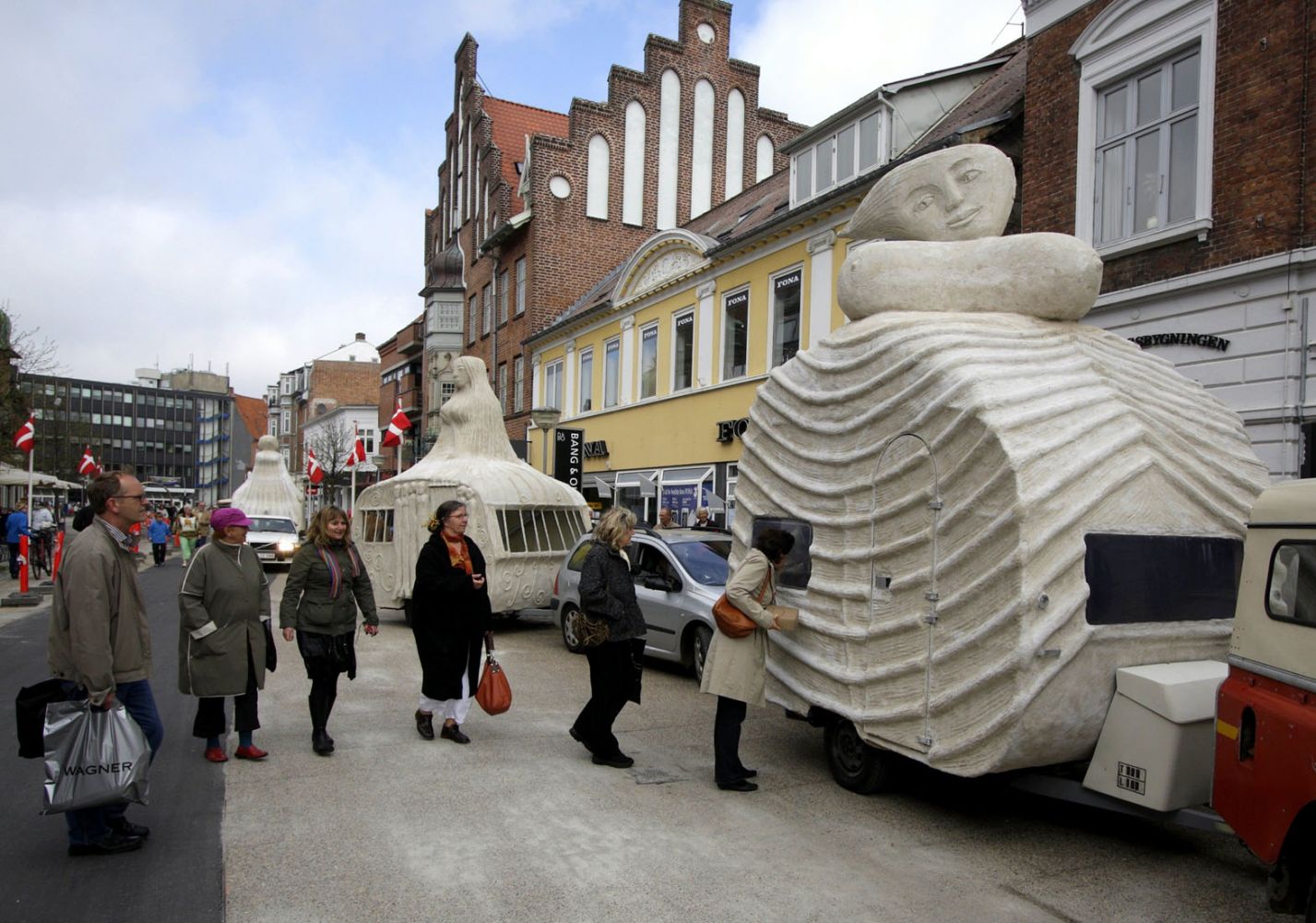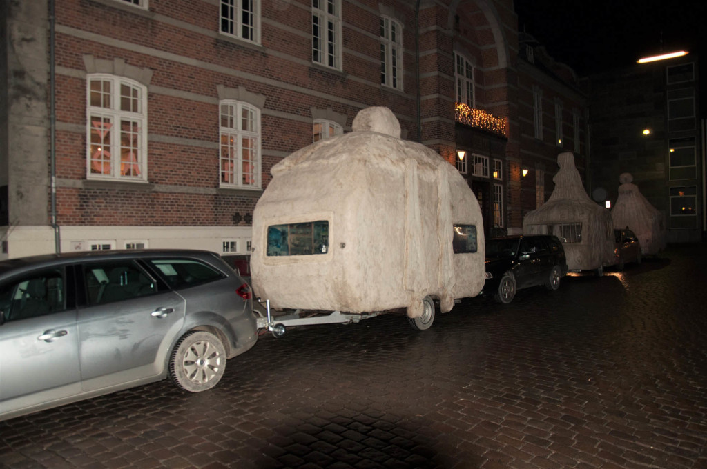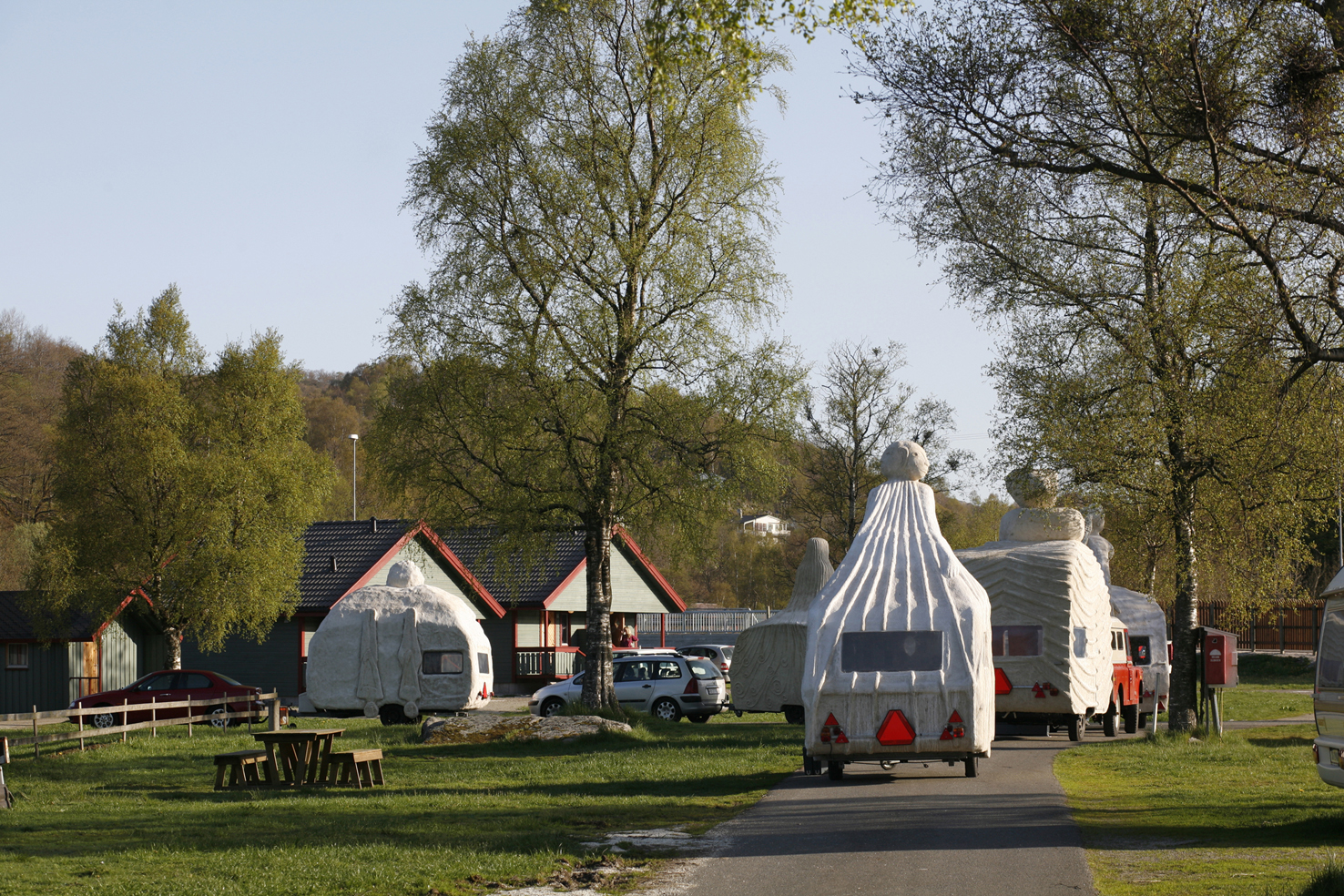 Skulpturerne er i kørbar stand, de ankommer bag hver sin bil og har været på lange campingture i Norge, Danmark og på Island.