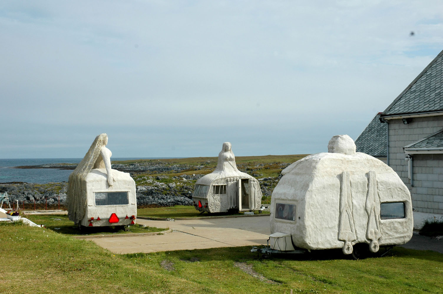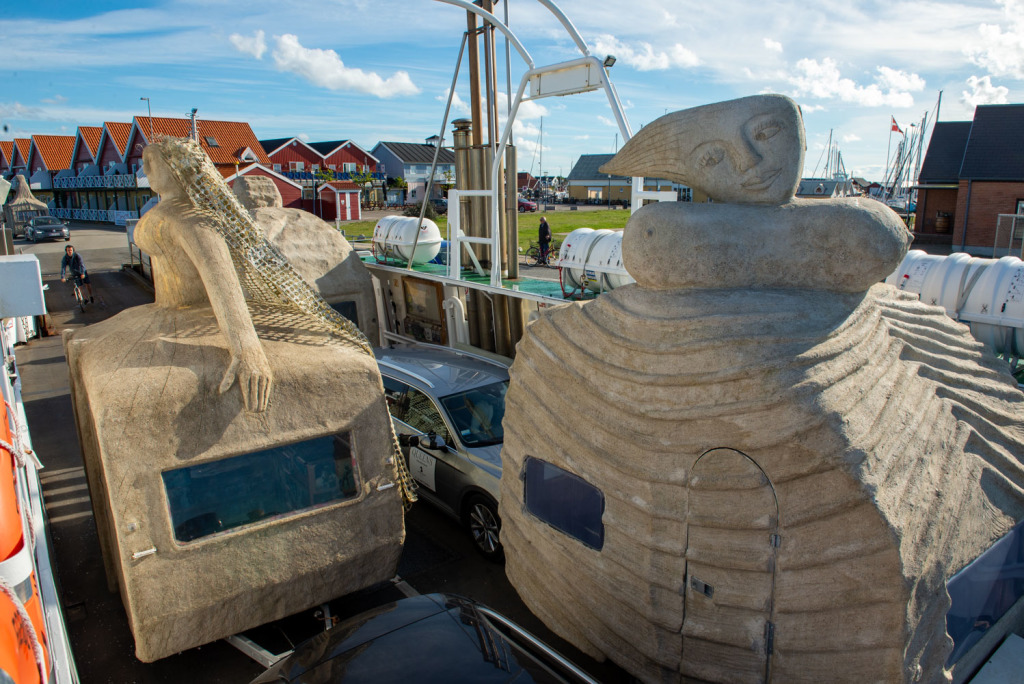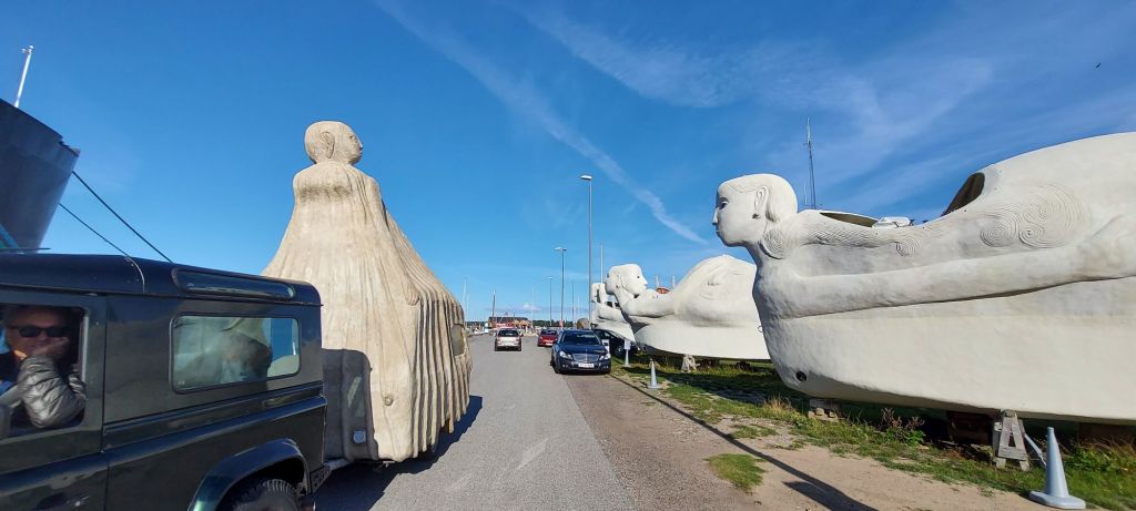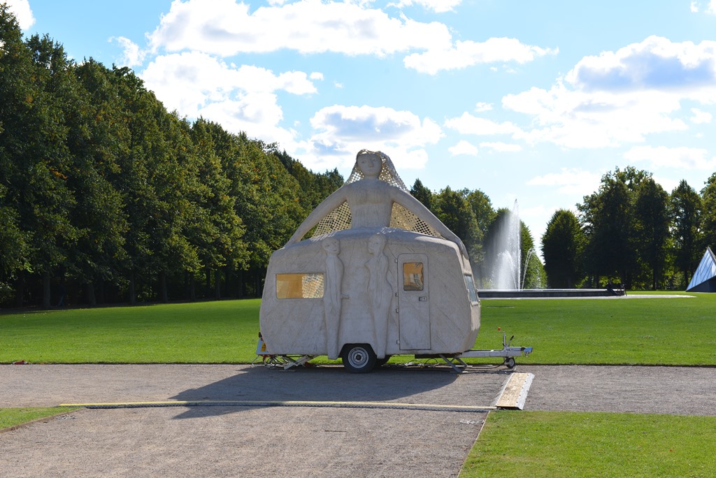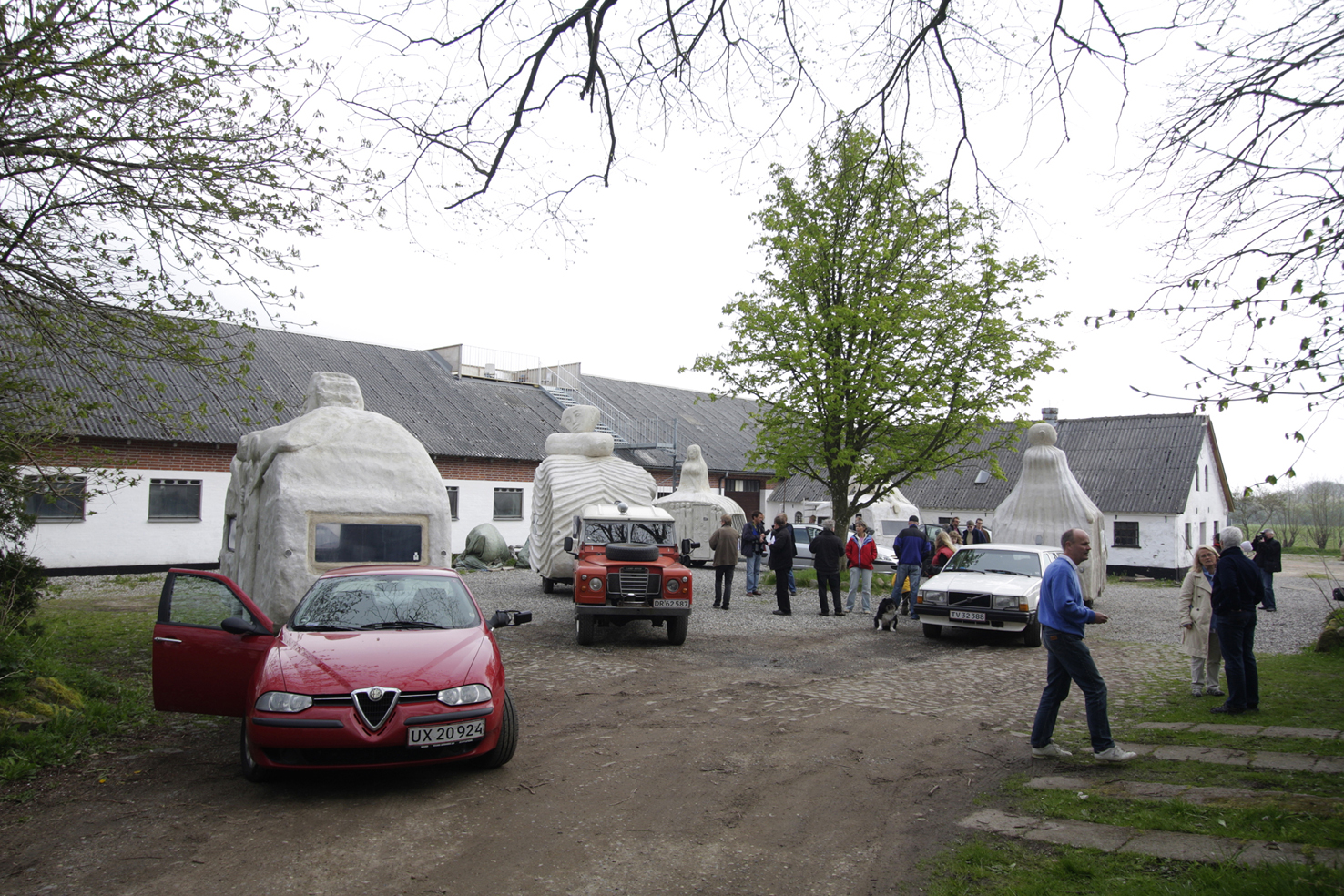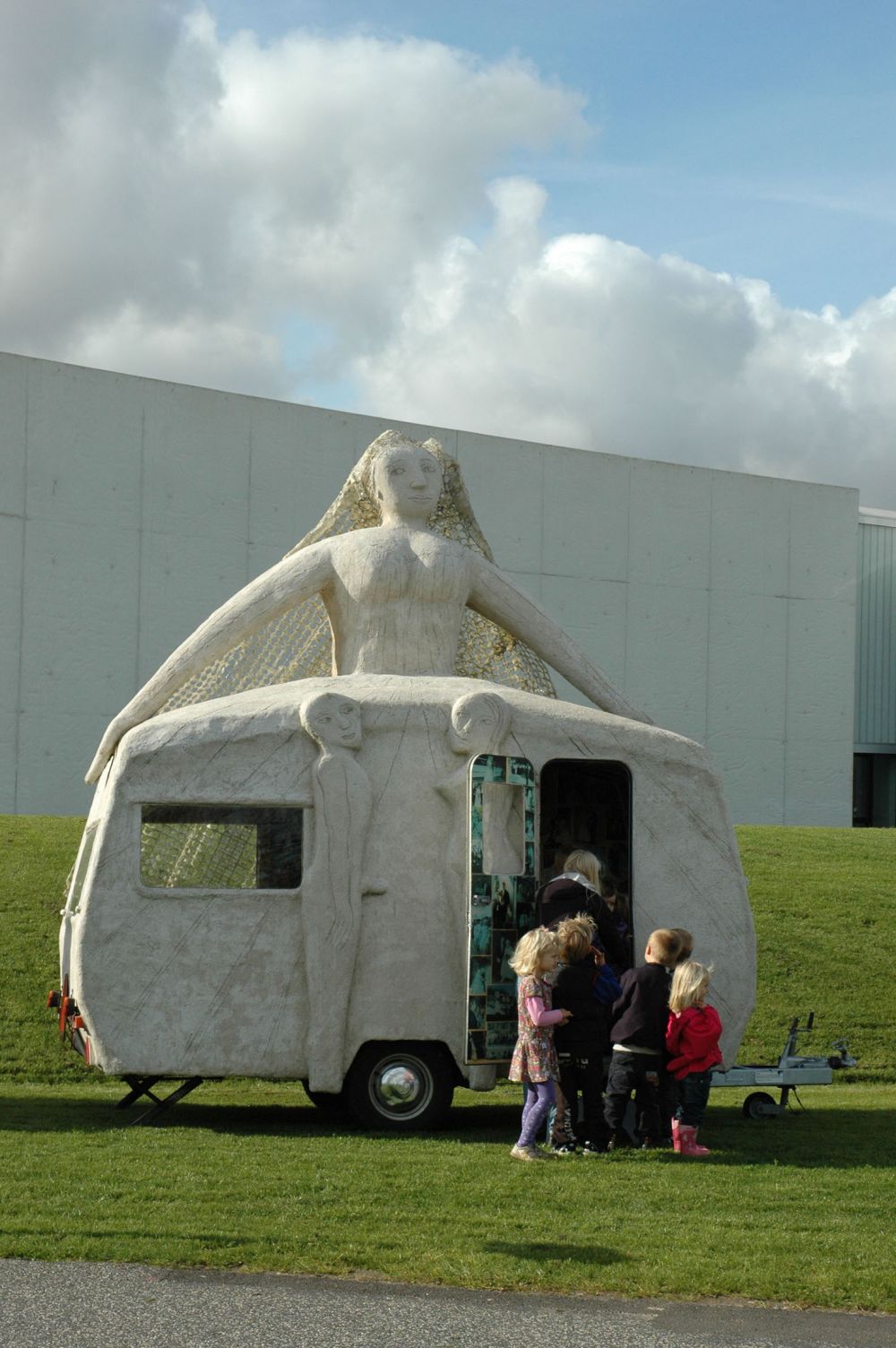 Skulpturerne er i kørbar stand, de ankommer bag hver sin bil og har været på lange campingture i Norge, Danmark og på Island.
