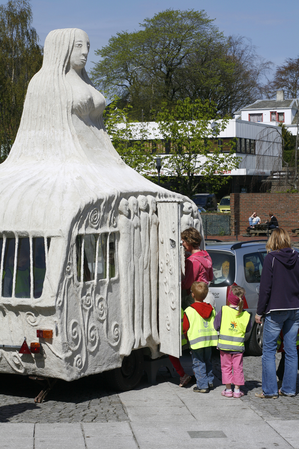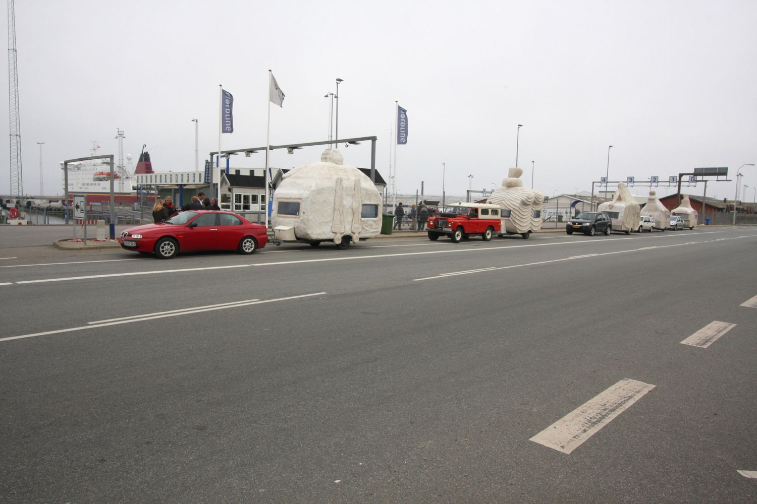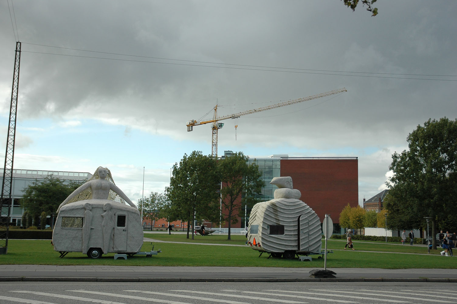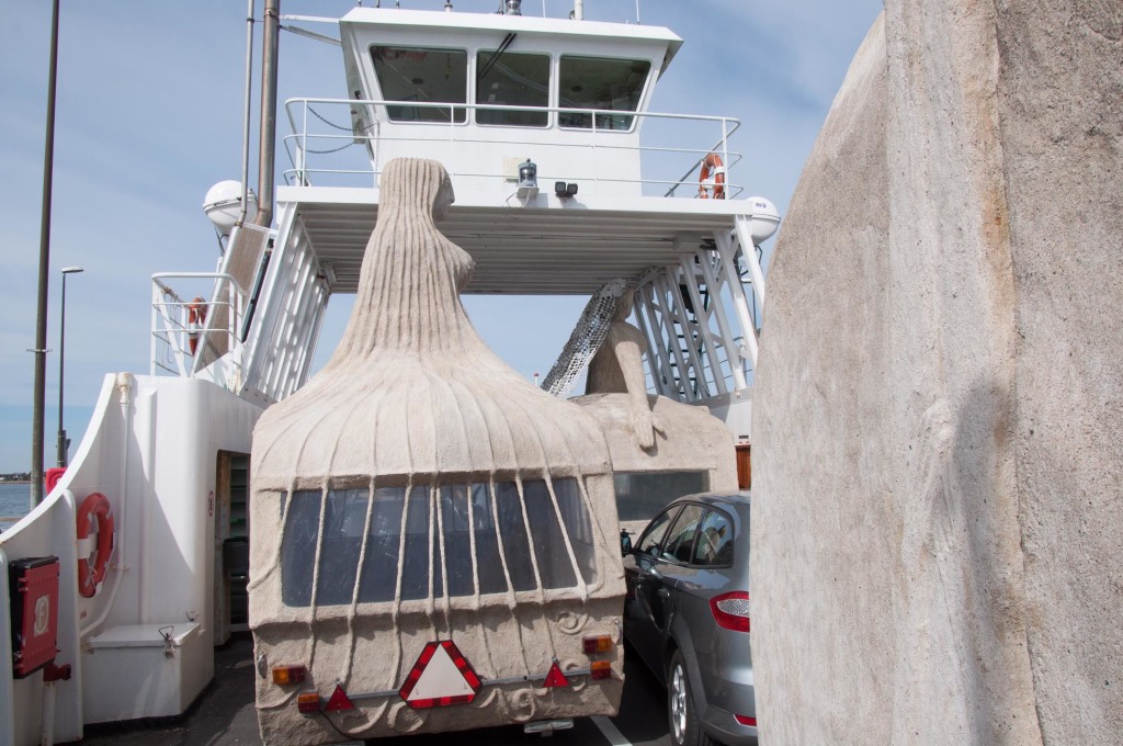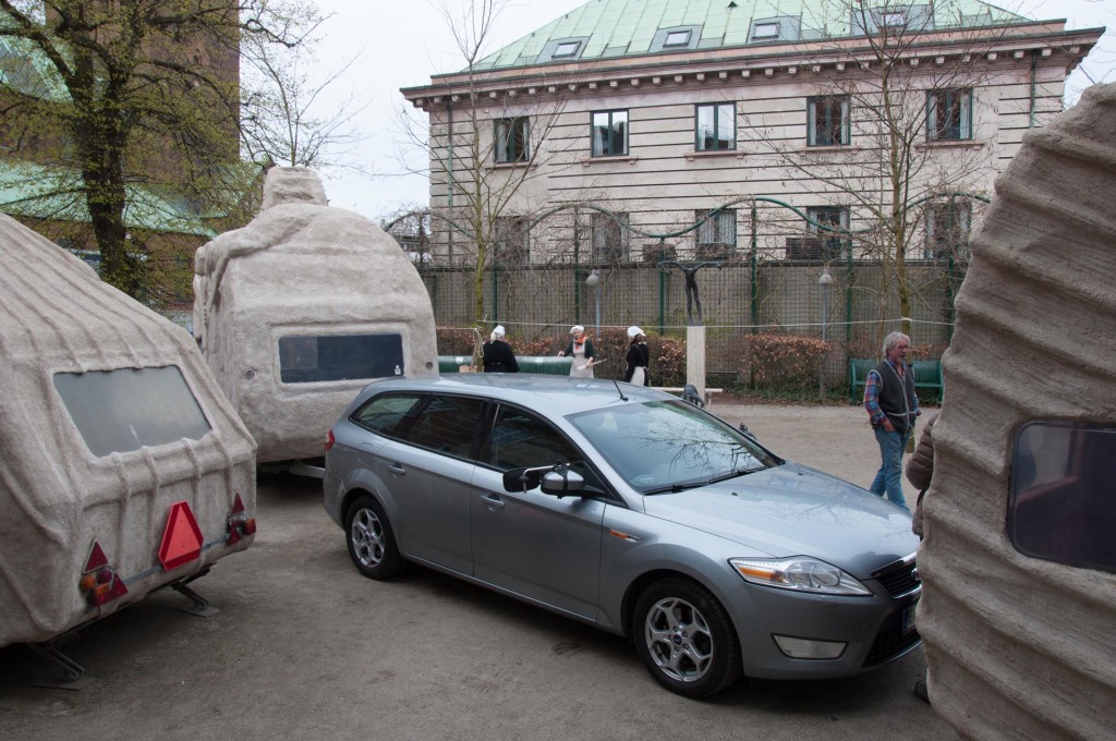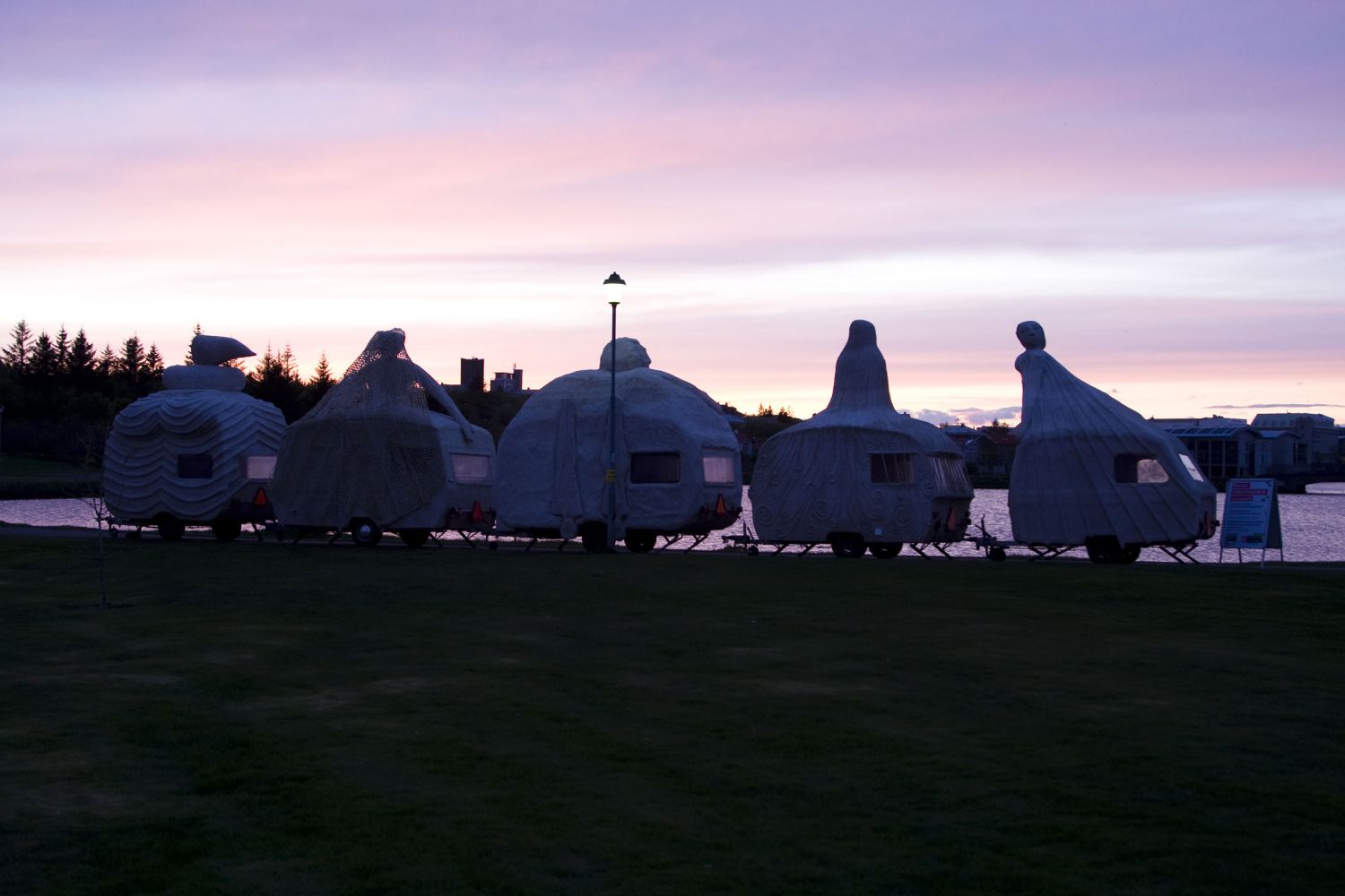 Skulpturerne er i kørbar stand, de ankommer bag hver sin bil og har været på lange campingture i Norge, Danmark og på Island.