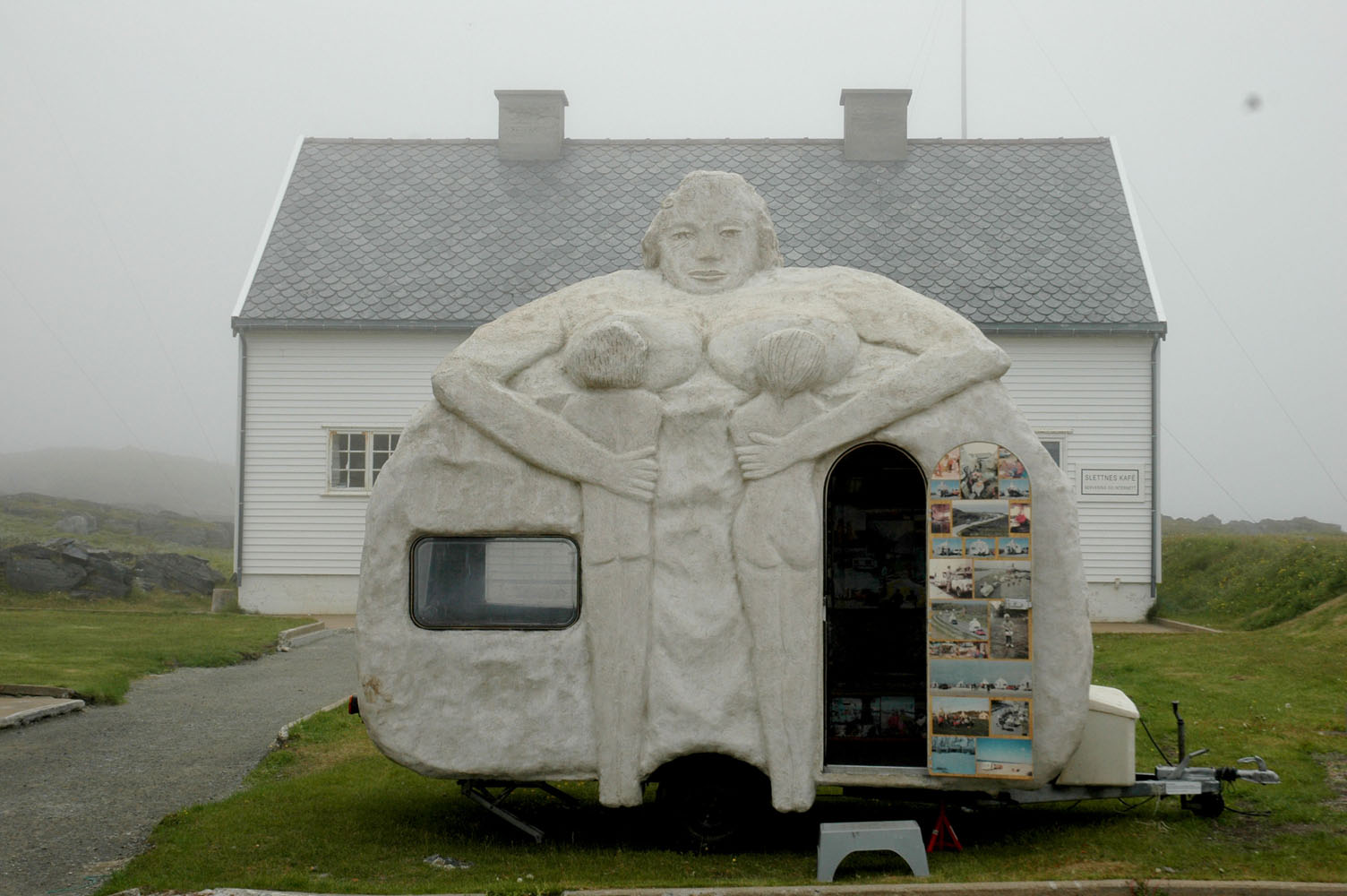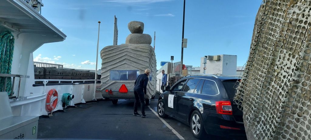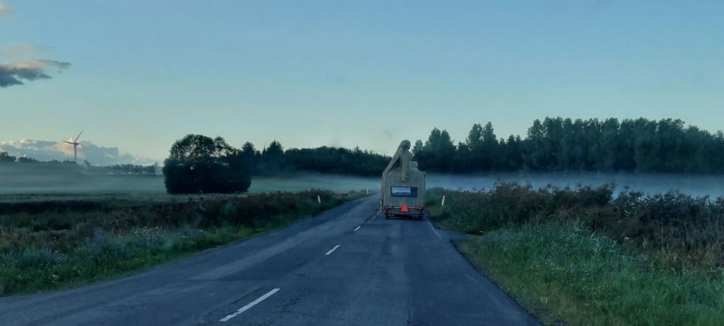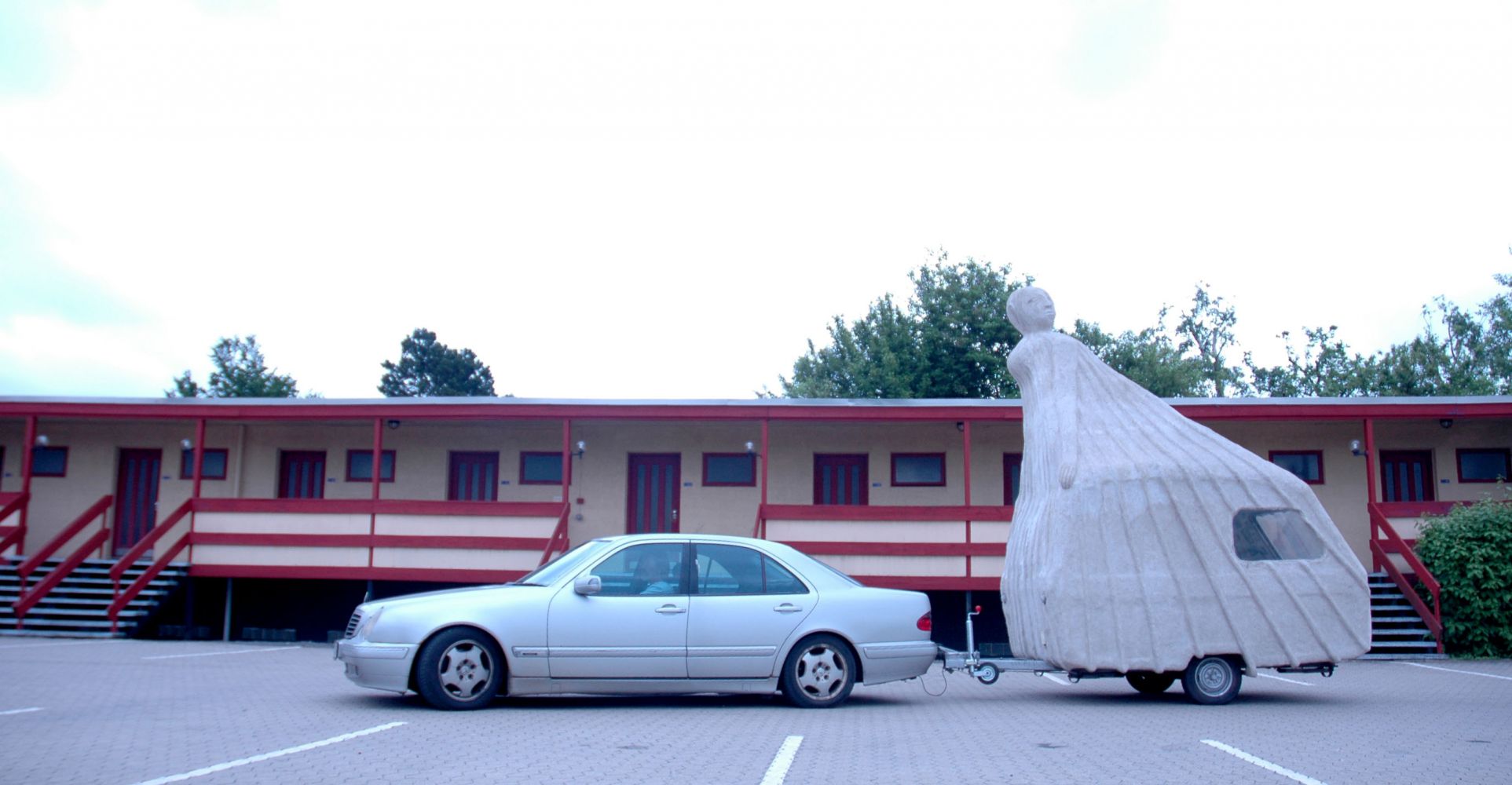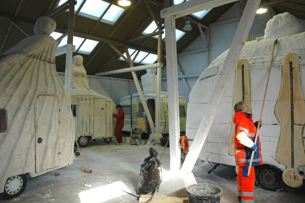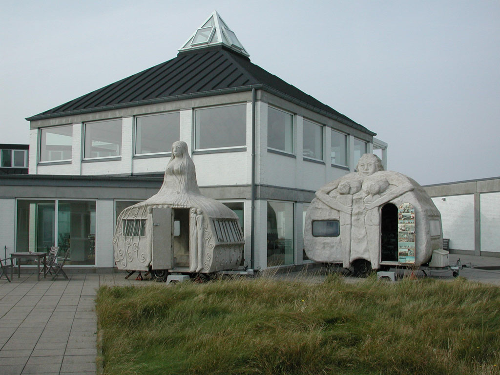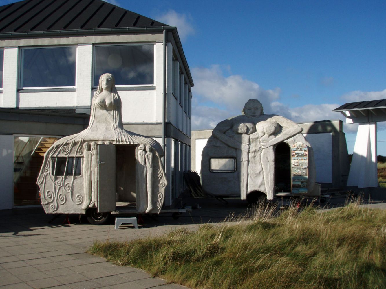 Skulpturerne er i kørbar stand, de ankommer bag hver sin bil og har været på lange campingture i Norge, Danmark og på Island.