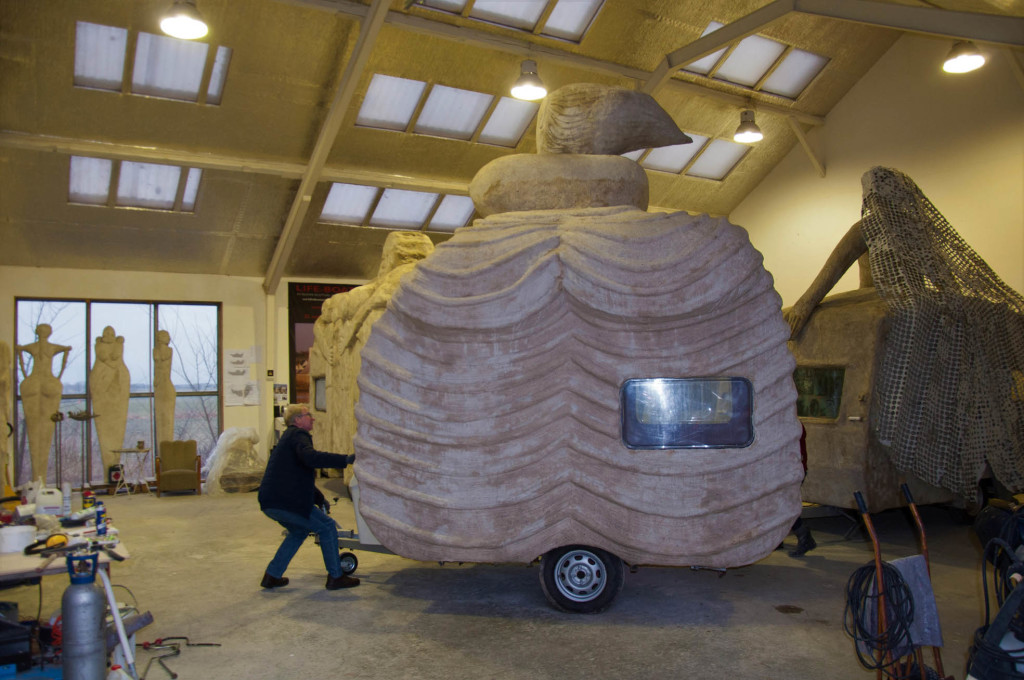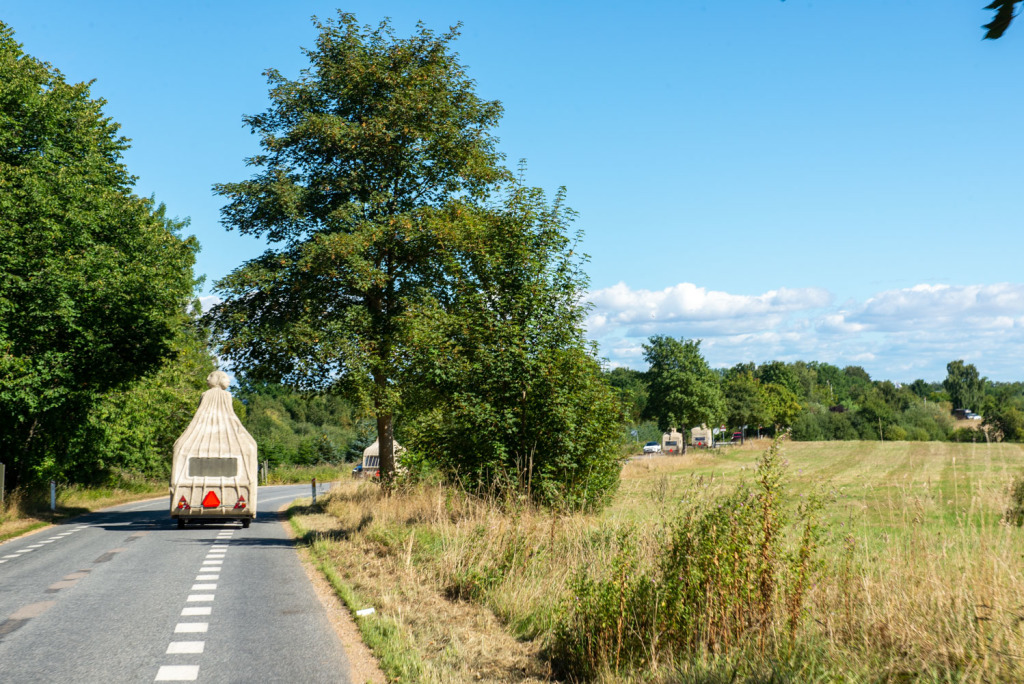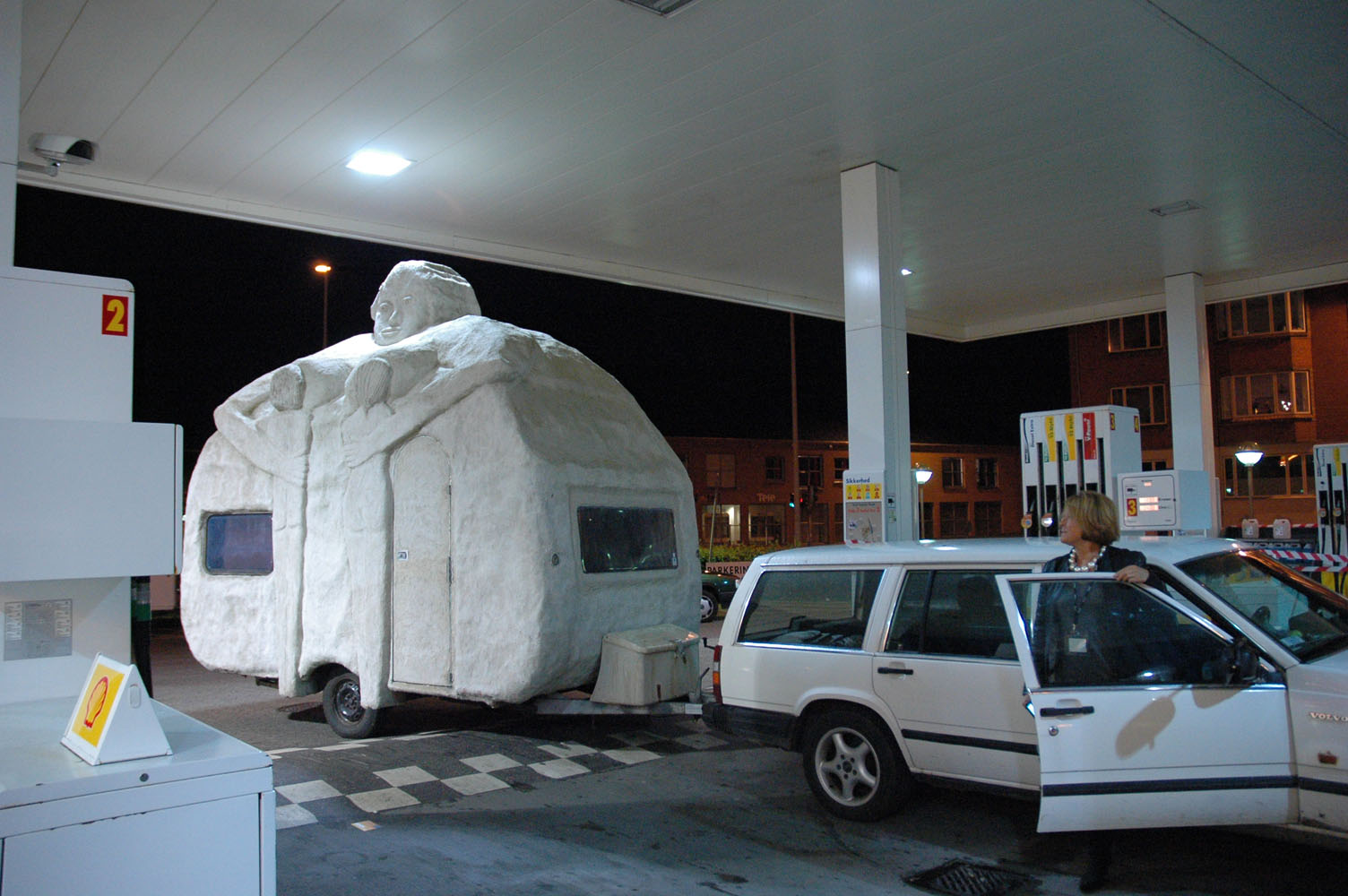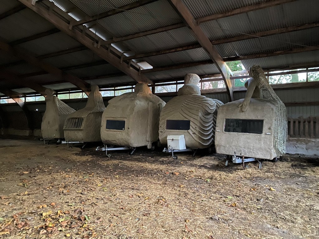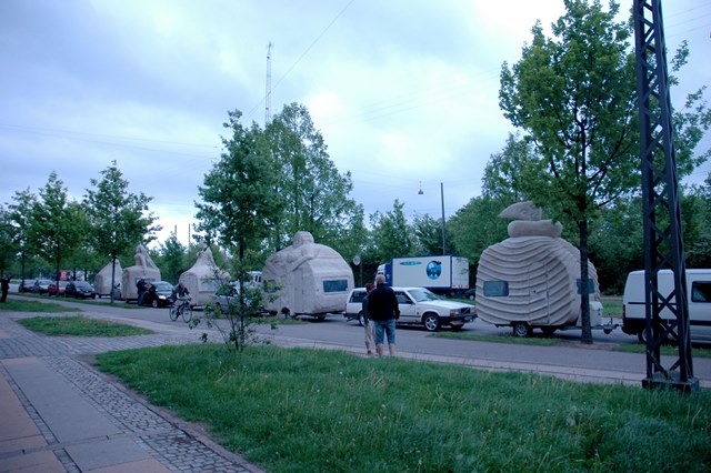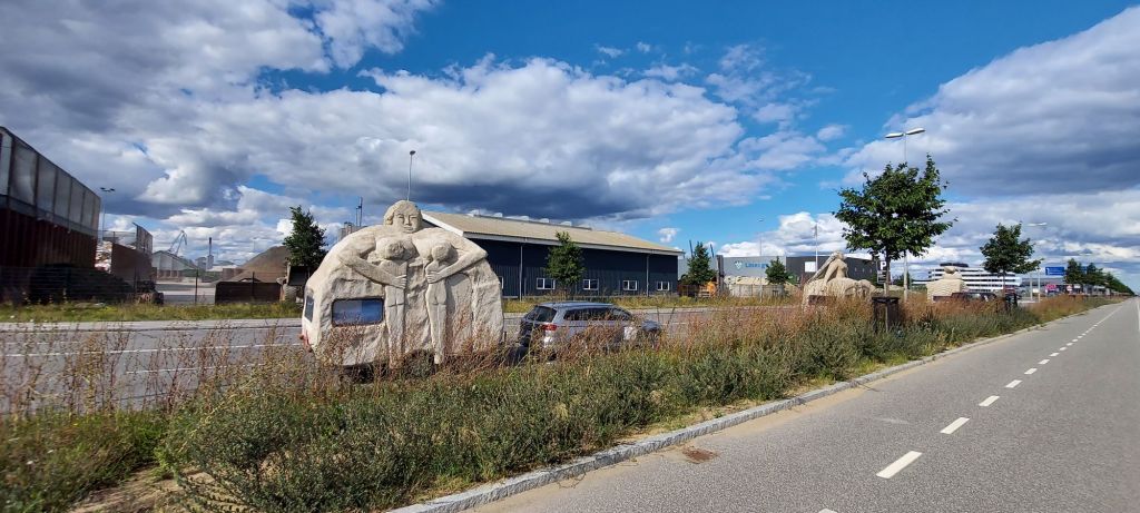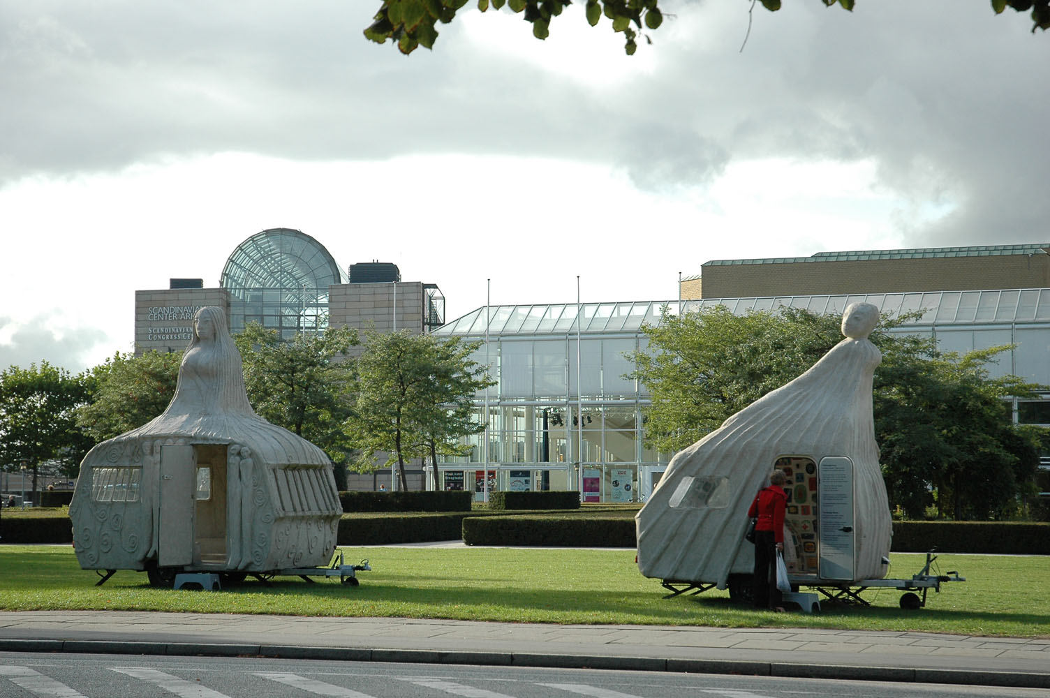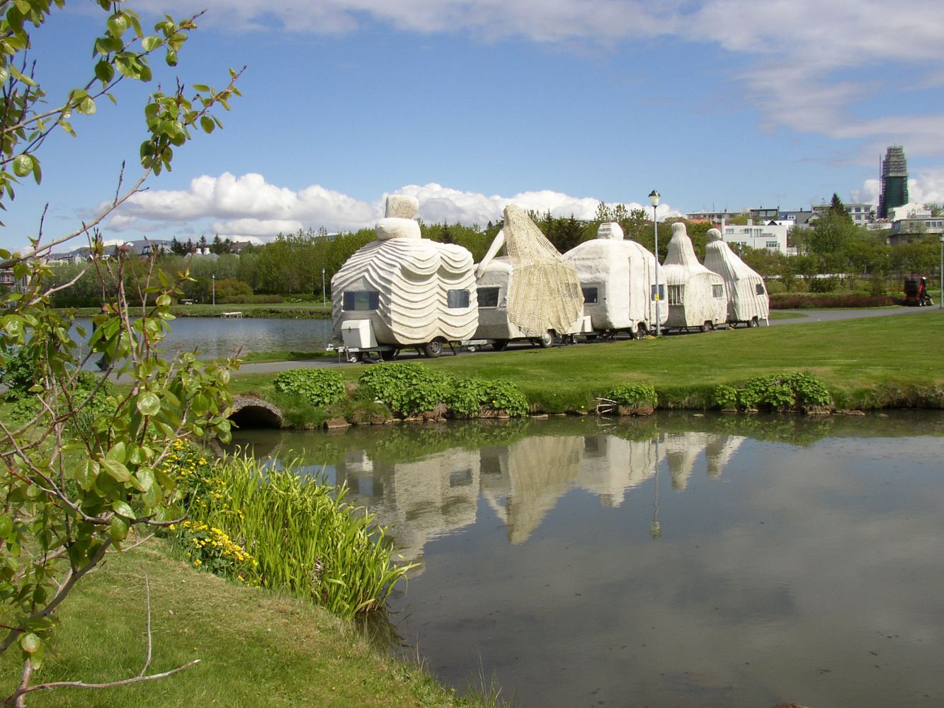 Skulpturerne er i kørbar stand, de ankommer bag hver sin bil og har været på lange campingture i Norge, Danmark og på Island.
