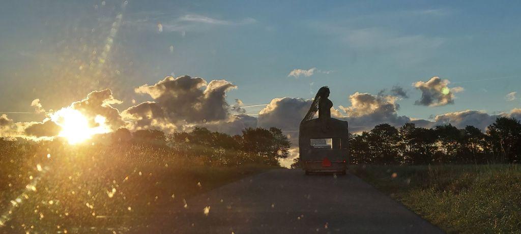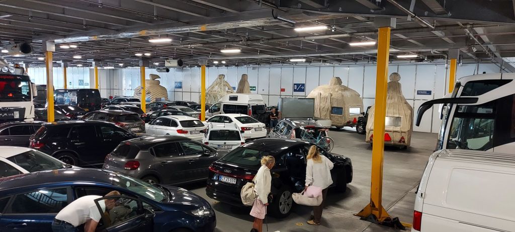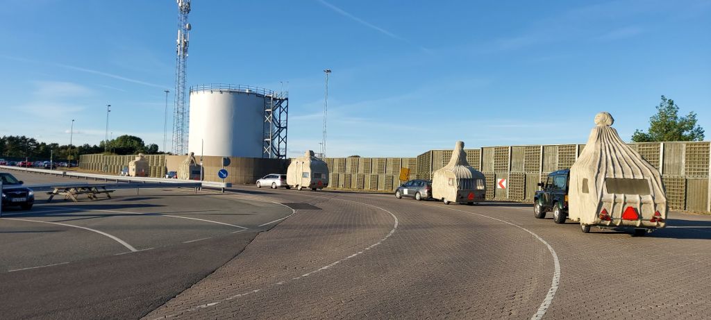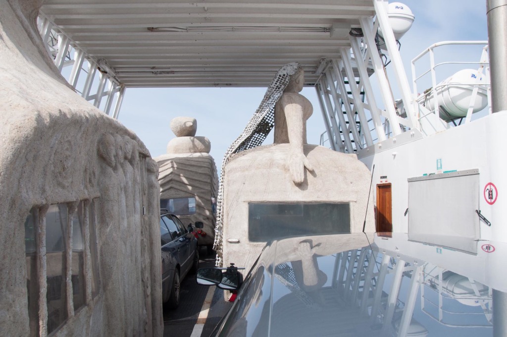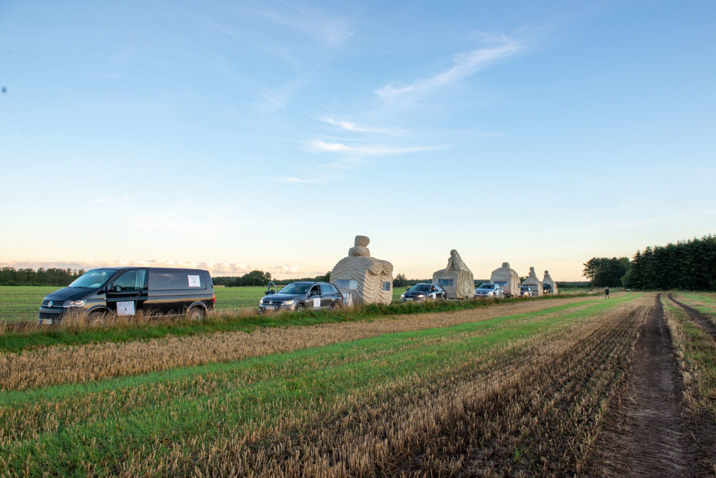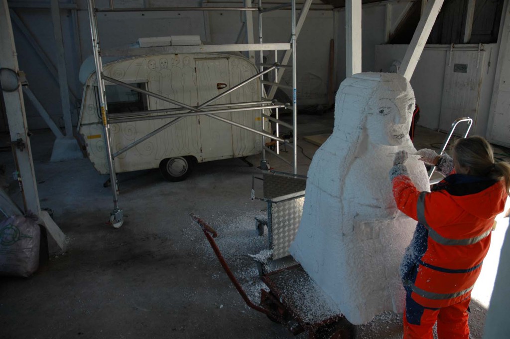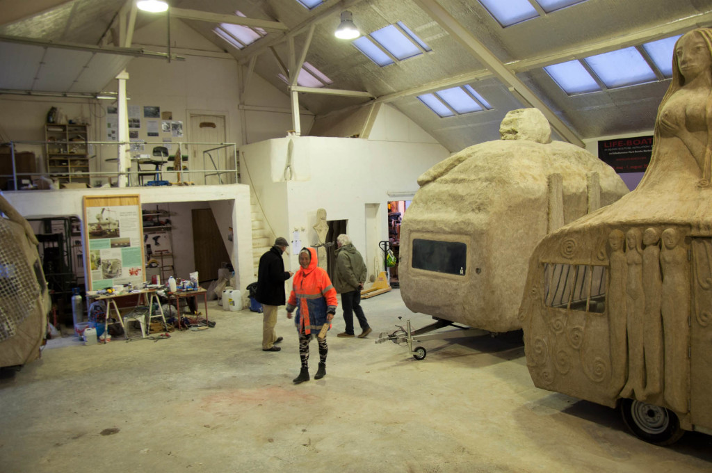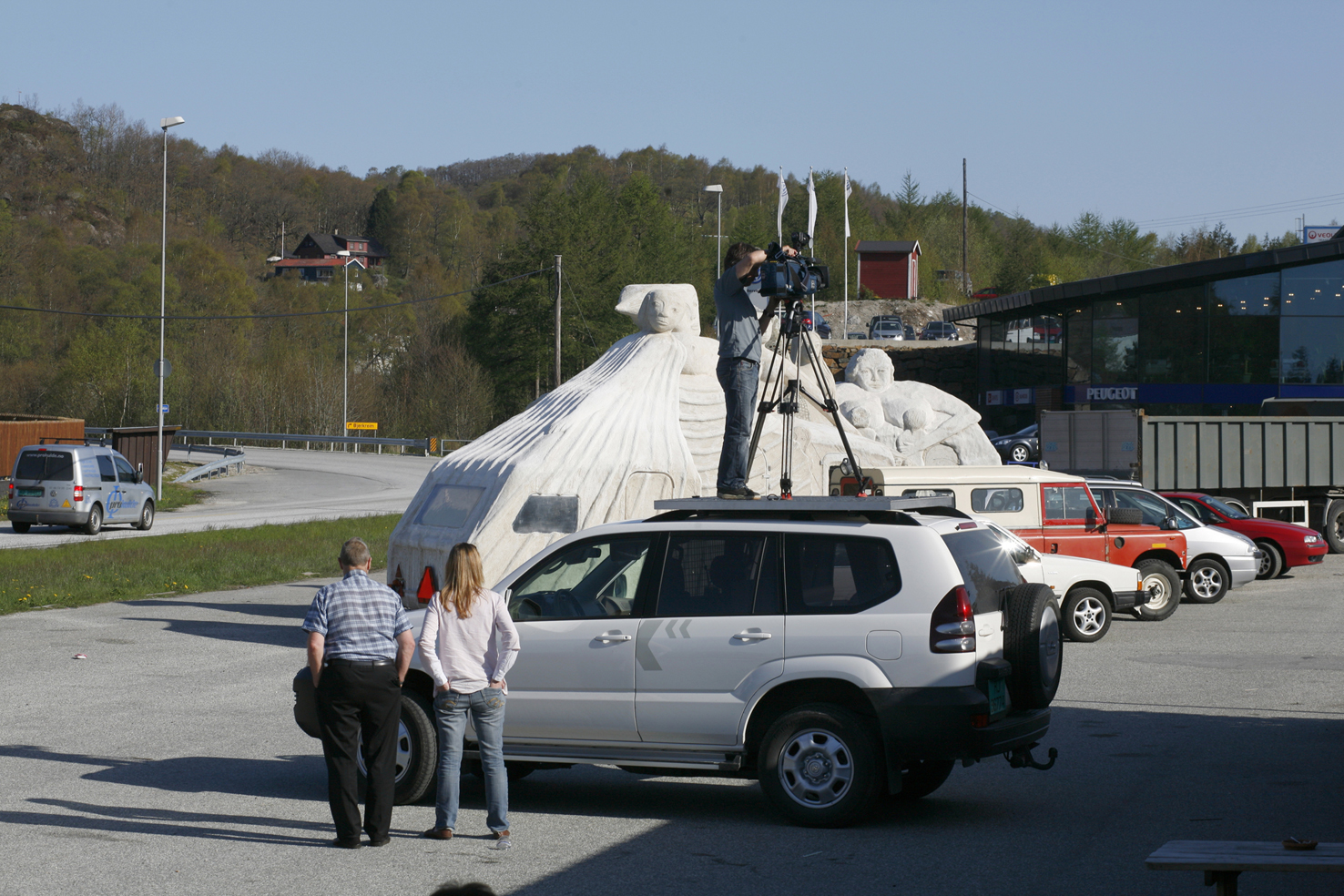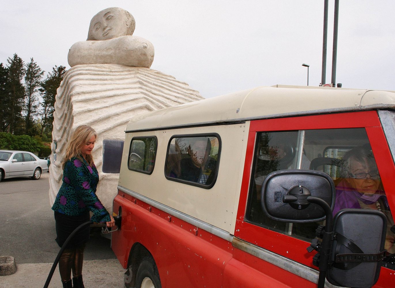 Skulpturerne er i kørbar stand, de ankommer bag hver sin bil og har været på lange campingture i Norge, Danmark og på Island.