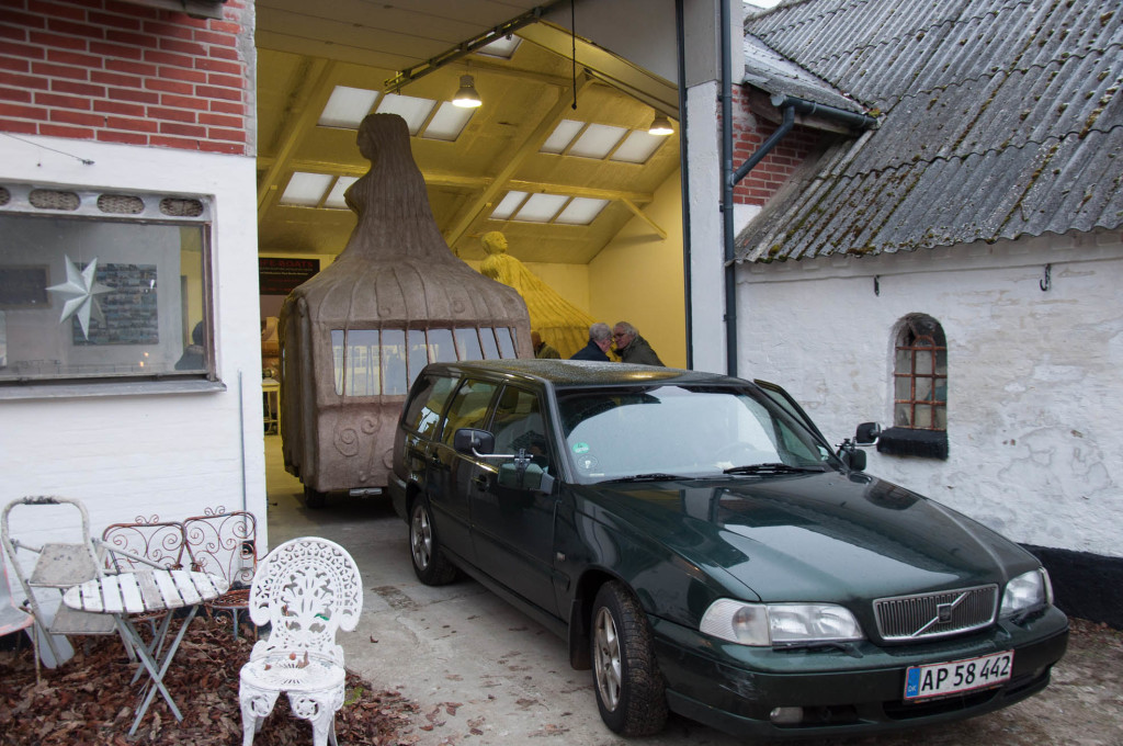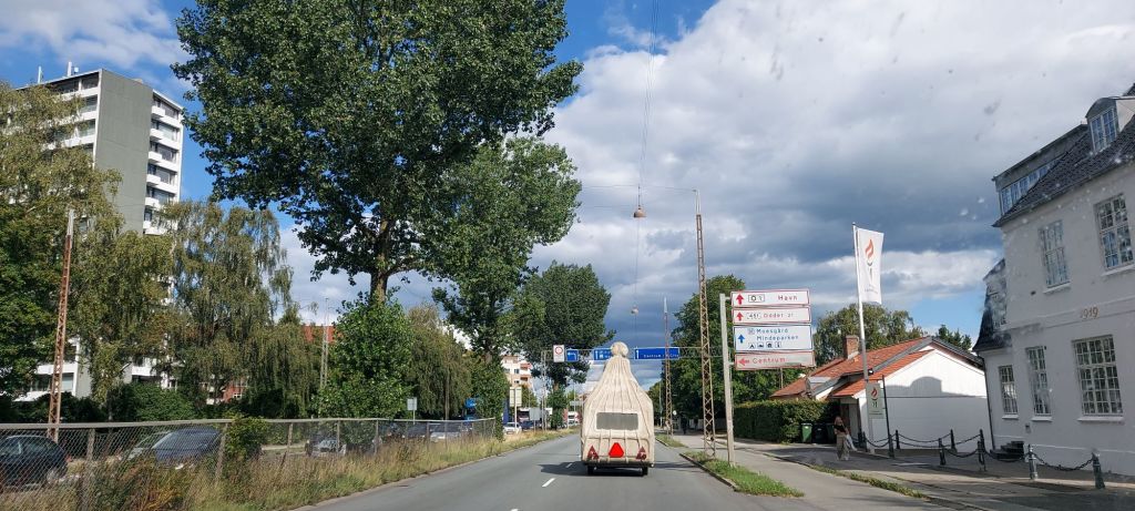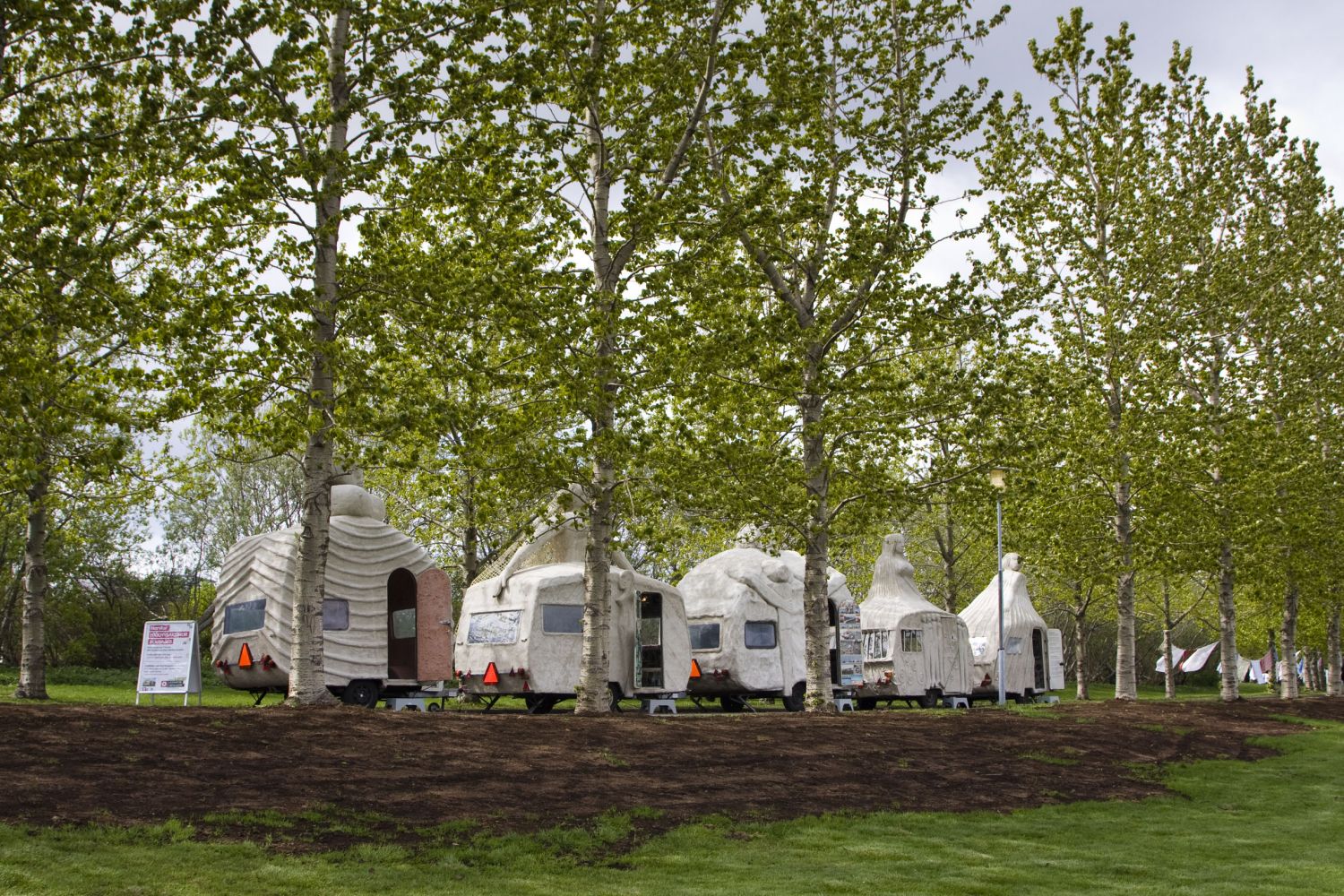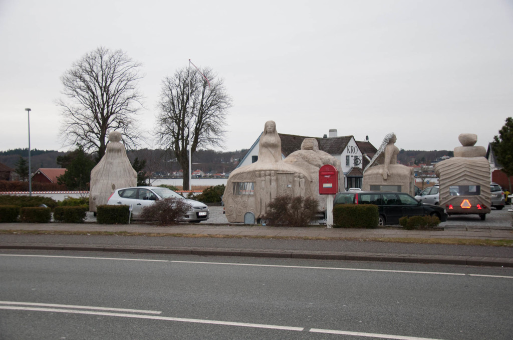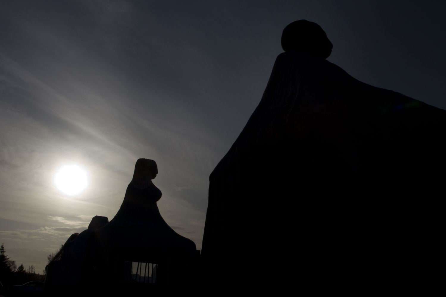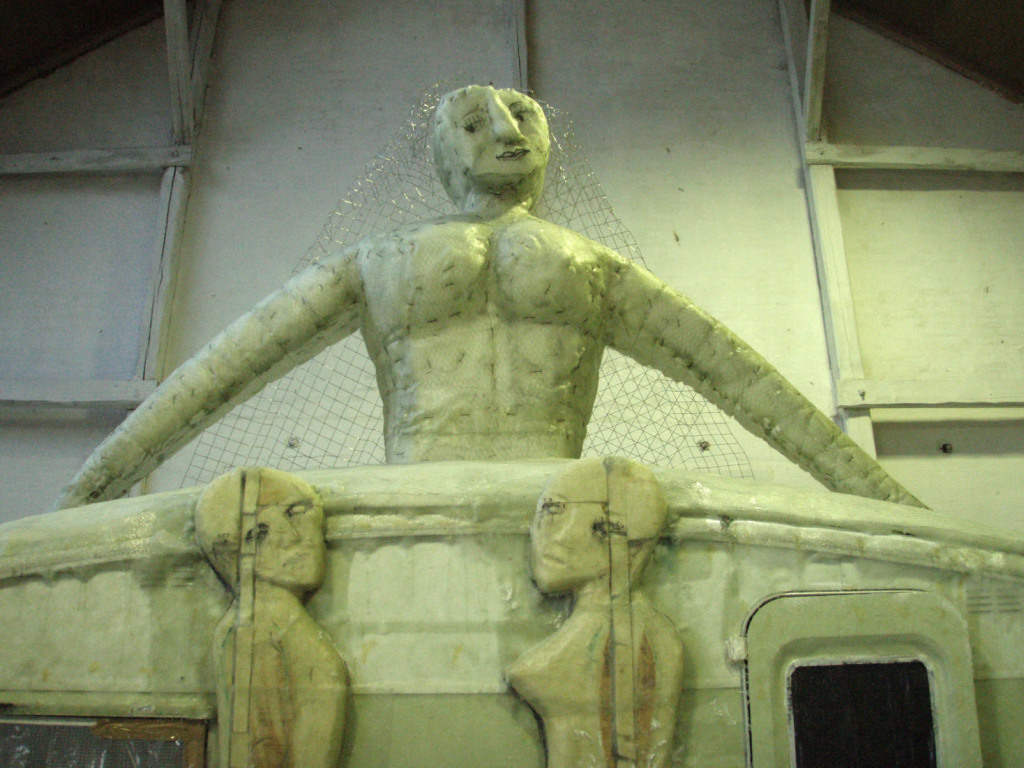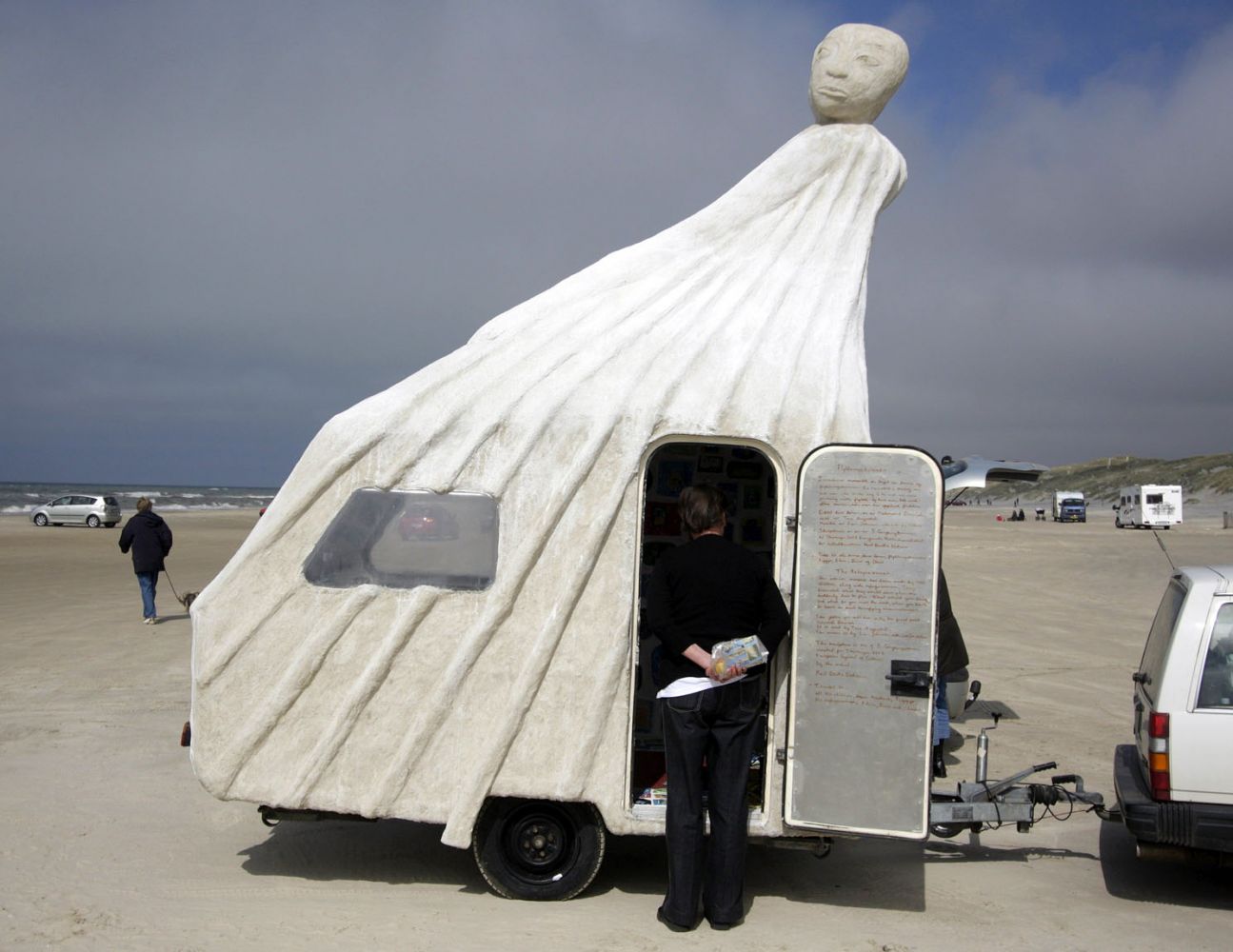 Skulpturerne er i kørbar stand, de ankommer bag hver sin bil og har været på lange campingture i Norge, Danmark og på Island.