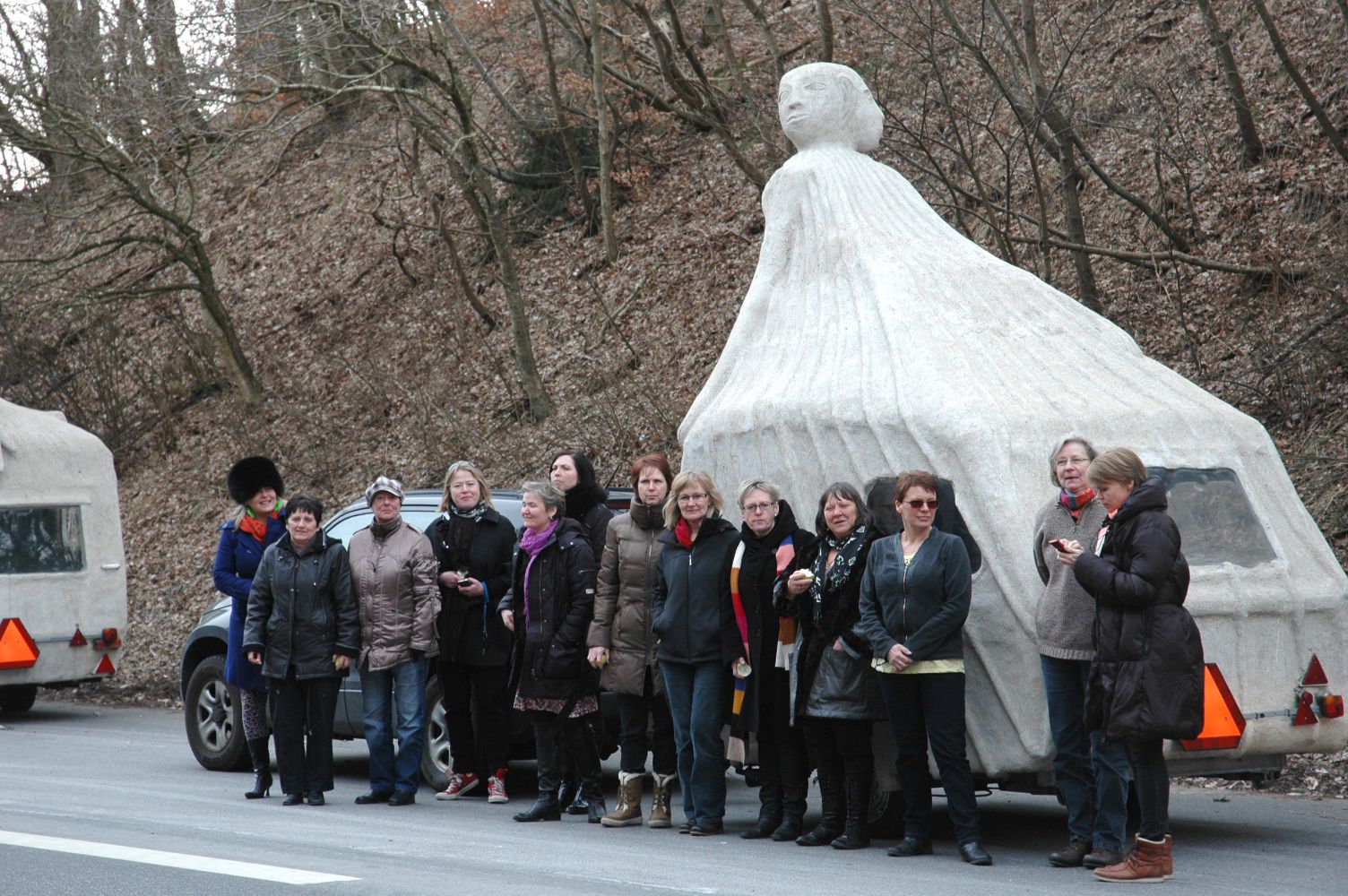 Campingkvinder på på vej fra Mygdal til Kvindemuseet i Aarhus hvor de skal stå foran domkirken fra den 21/1 - 23/4 2017, samtidig med Marit Benthe Norheim har udstillingen "Mit skib er ladet med minder" på Kvindemuseet