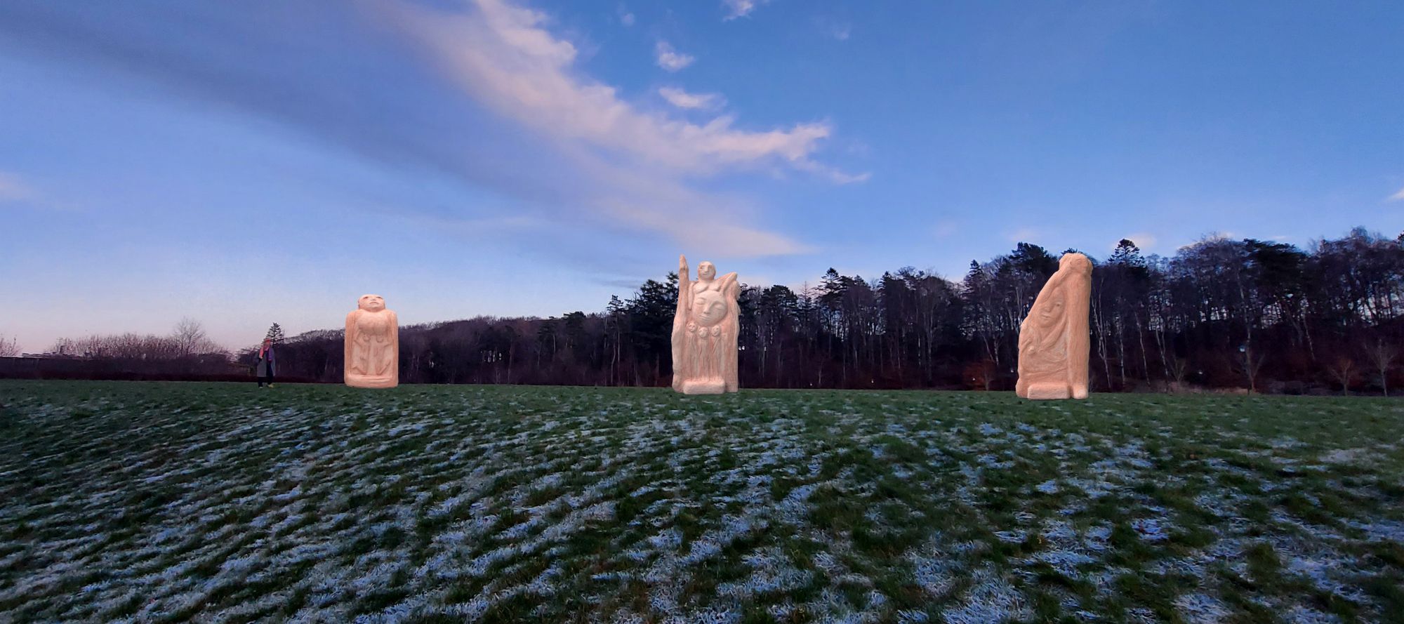Er første skulpturen man kommer til på stien. Den har en bygningsmessig klar front ved inngangstunnelen, bestående av 4 figurer, som er litt ubestemmelige iforhold til hvem de er og hva de vil. Hører de sammen, eller er