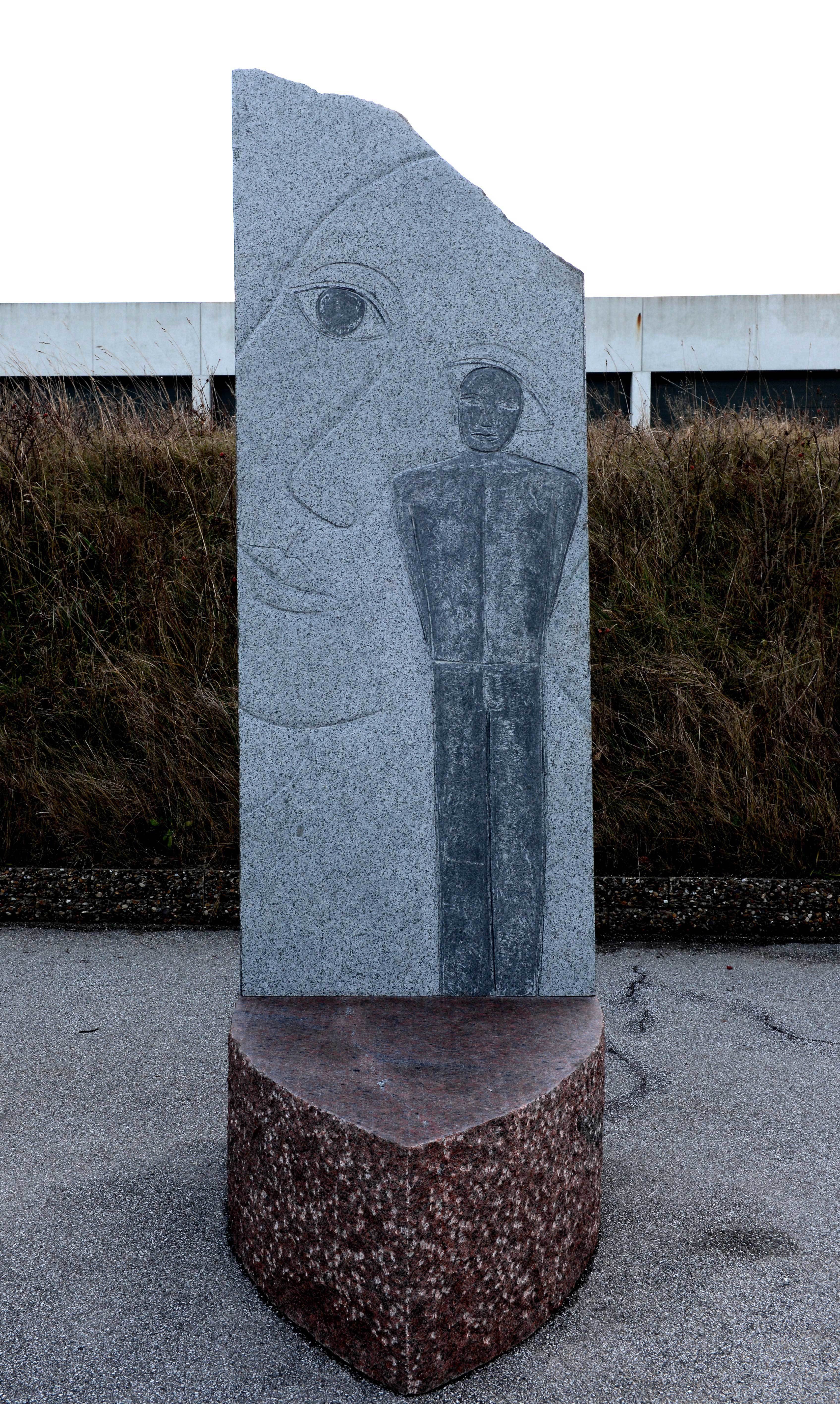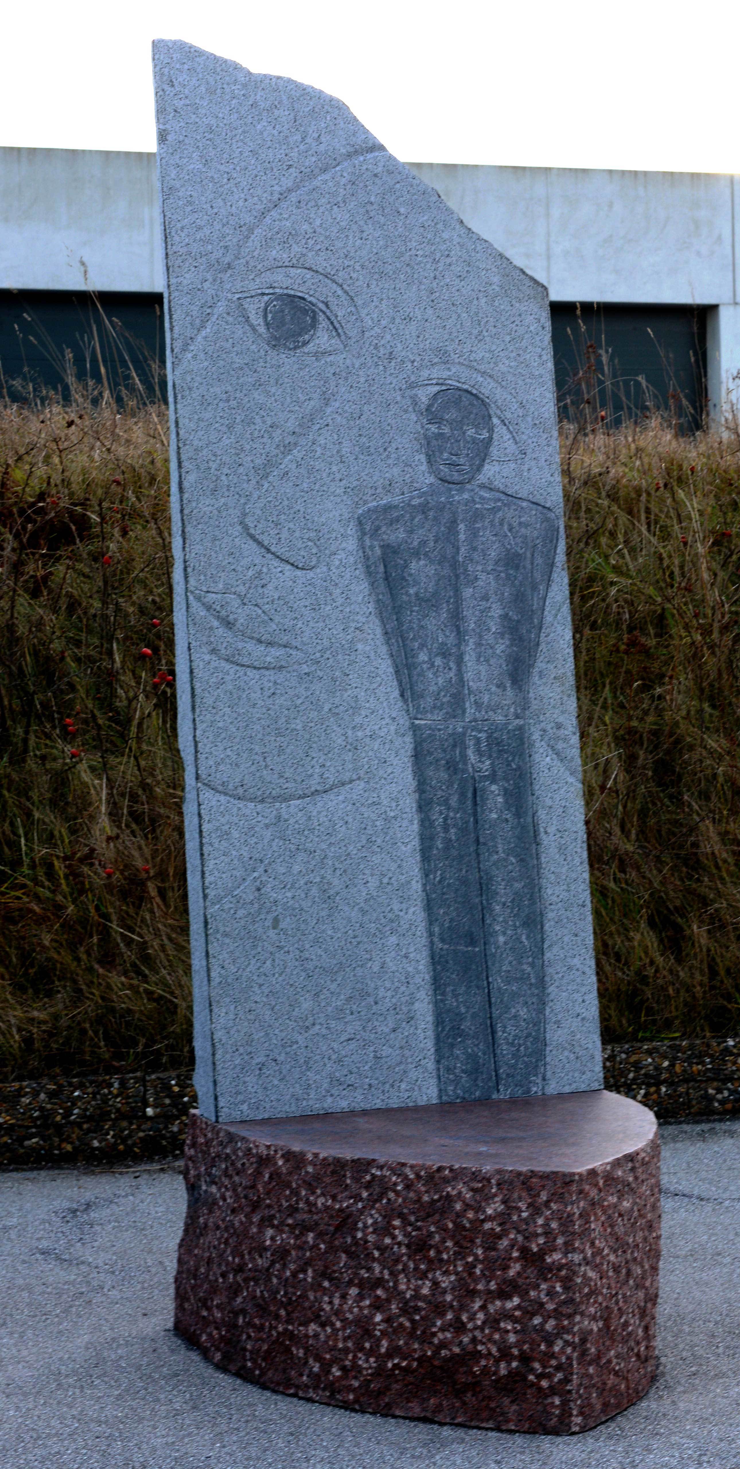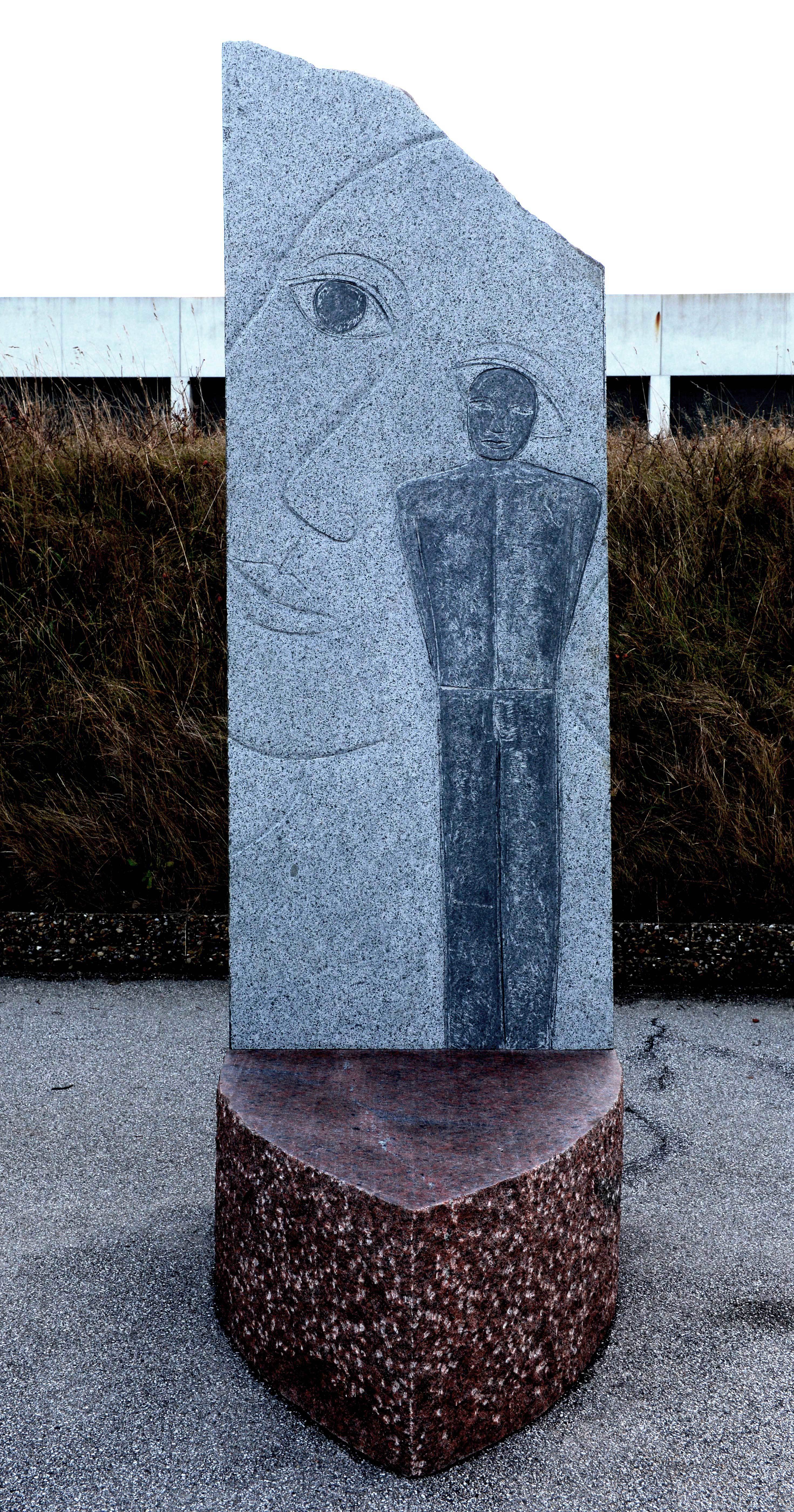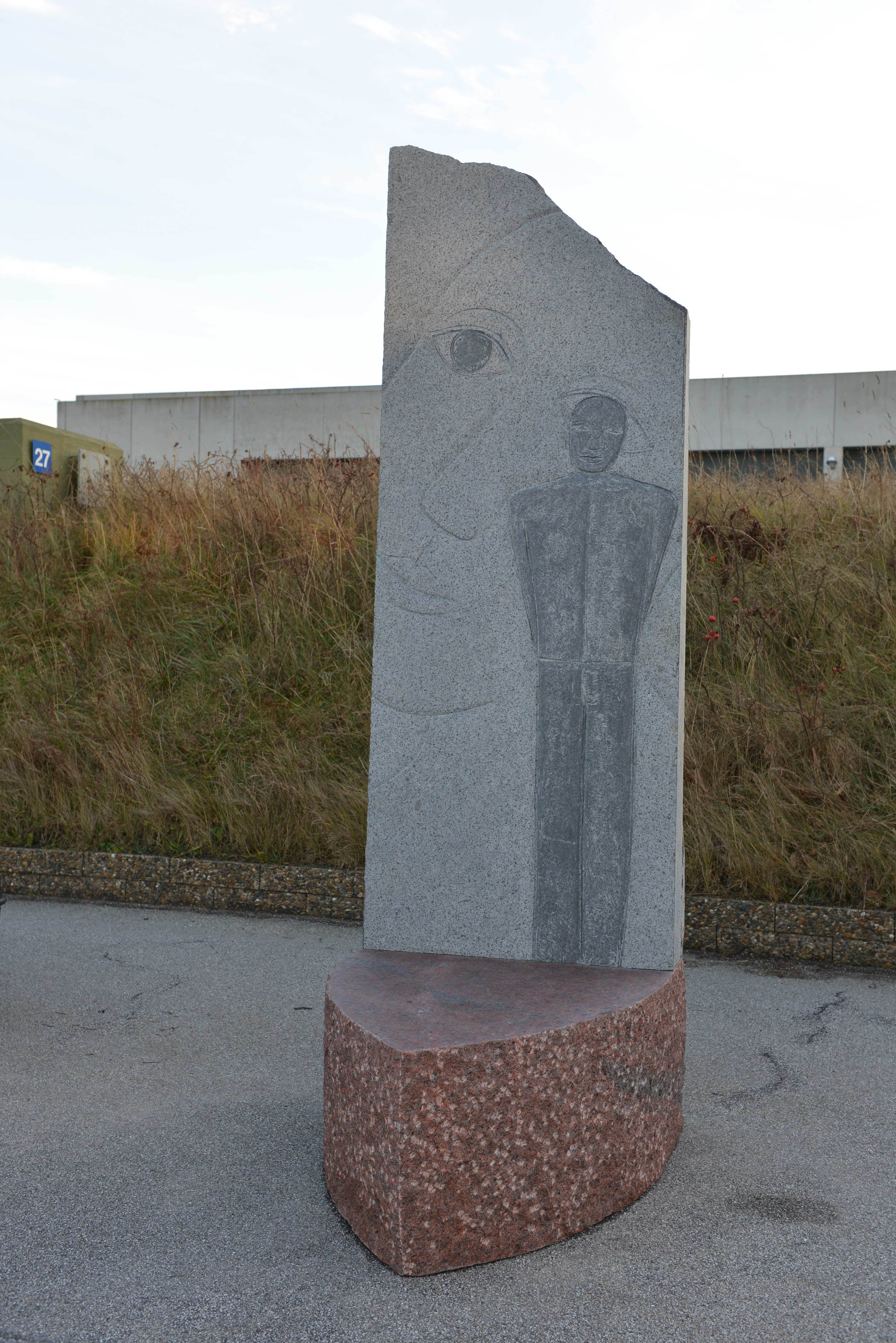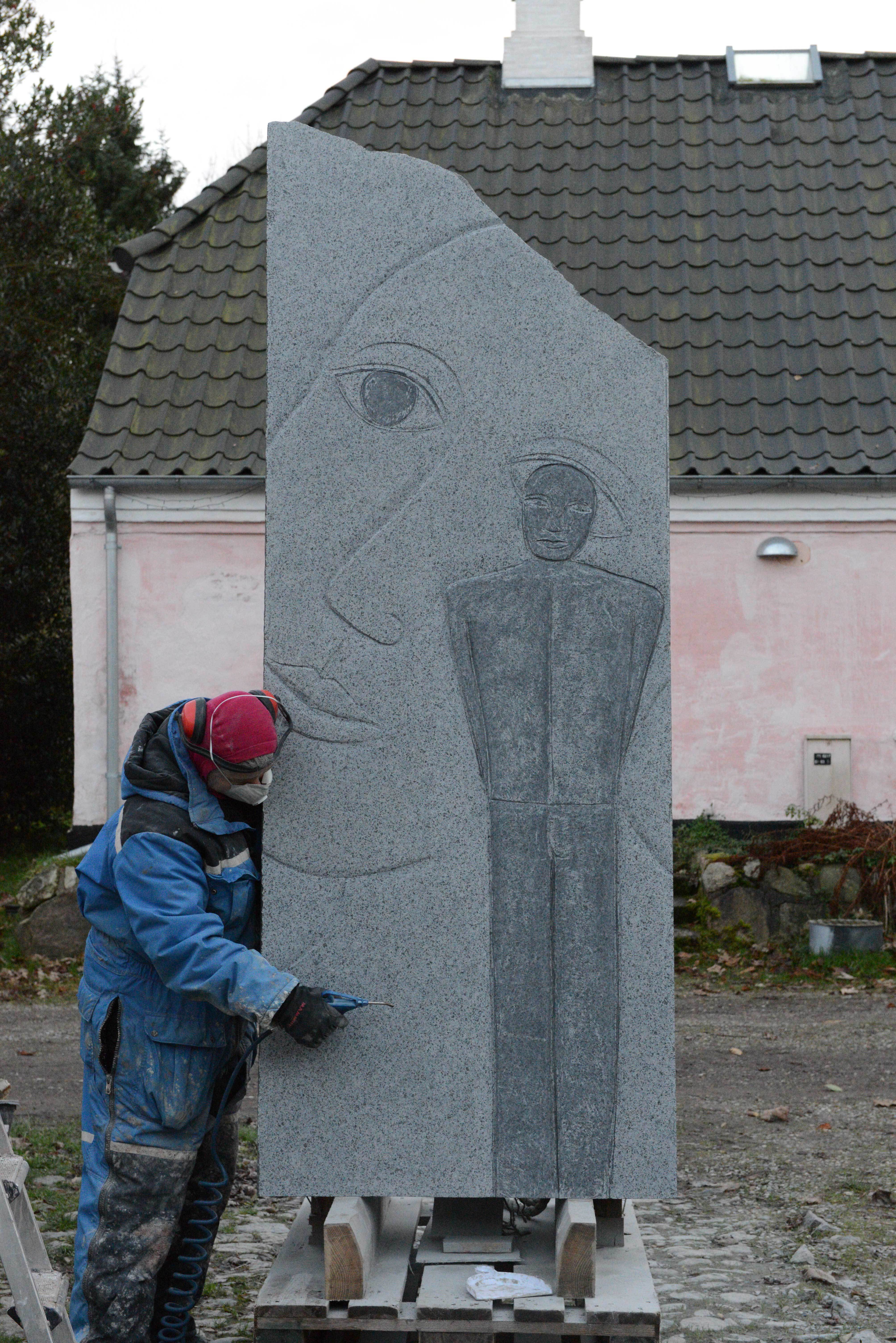 Jeg har tatt utgangspunkt i en granittplate - blå rønne, fra Bornholm, som kan gi fornemmelsen av et seil. På ”seilet”, har jeg slipt et relieff, av en ung mann/soldat, hvor hodet, som I ser utgjør øye eplet til det store ansikt i bakgrunnen. Ansiktet kan assosiere på forskjellige måter – men det er jo soldatens oppgave å beskytte mennesker. Uansett hvilken oppgave han er på. Derfor er ansiktet kanskje et bilde på misjonen, - eller på den han er nær, som savner og tenker på ham, liksom dette menneske også er hans savn.