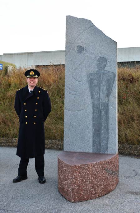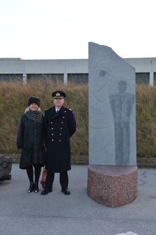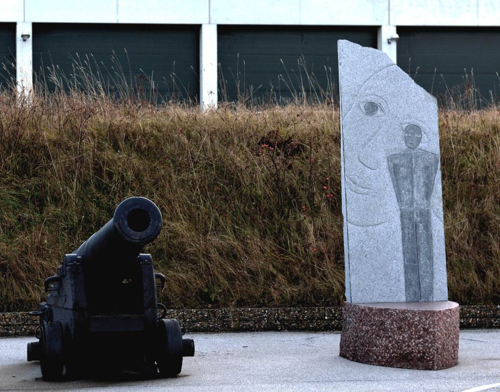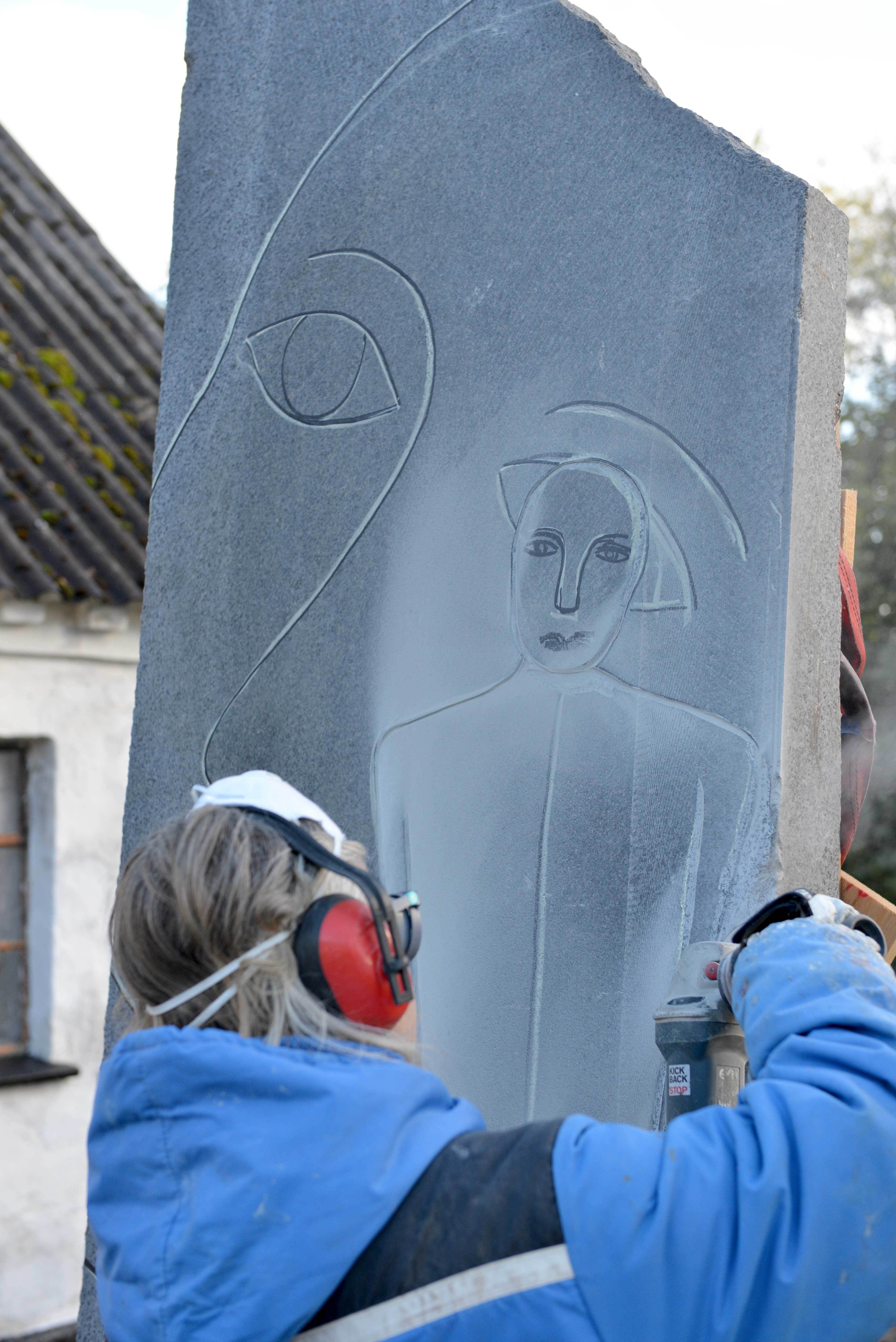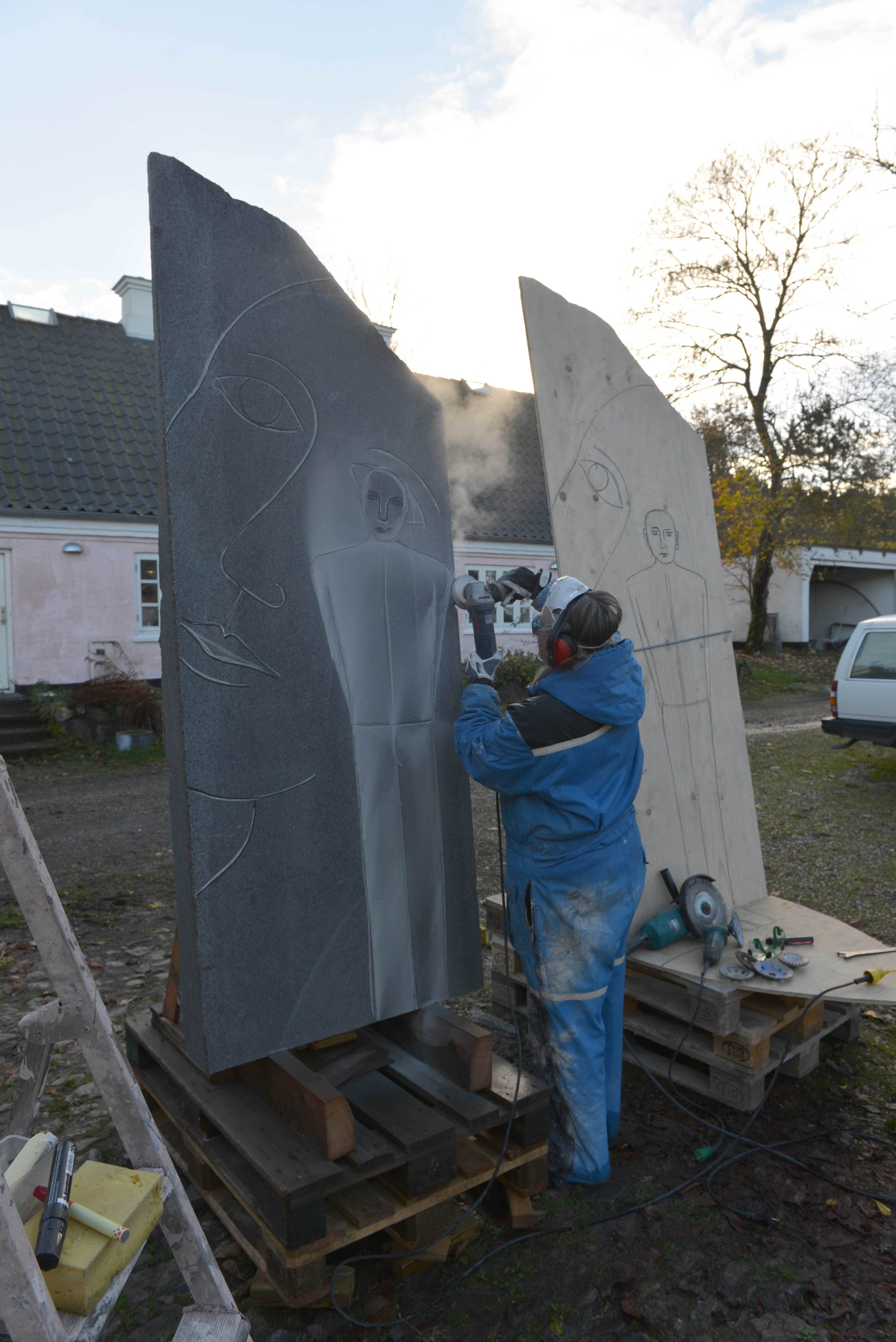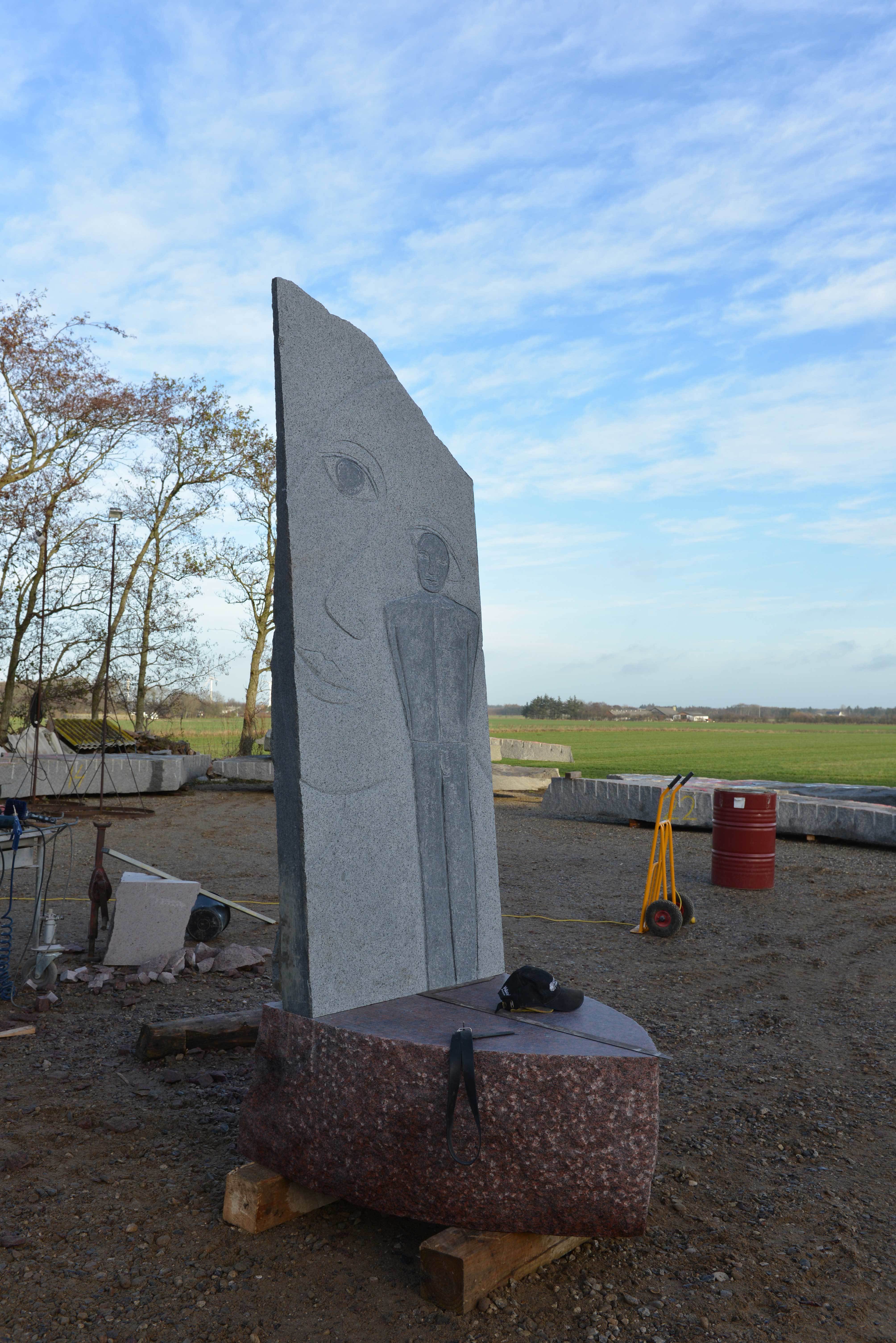 Jeg har tatt utgangspunkt i en granittplate - blå rønne, fra Bornholm, som kan gi fornemmelsen av et seil. På ”seilet”, har jeg slipt et relieff, av en ung mann/soldat, hvor hodet, som I ser utgjør øye eplet til det store ansikt i bakgrunnen. Ansiktet kan assosiere på forskjellige måter – men det er jo soldatens oppgave å beskytte mennesker. Uansett hvilken oppgave han er på. Derfor er ansiktet kanskje et bilde på misjonen, - eller på den han er nær, som savner og tenker på ham, liksom dette menneske også er hans savn.