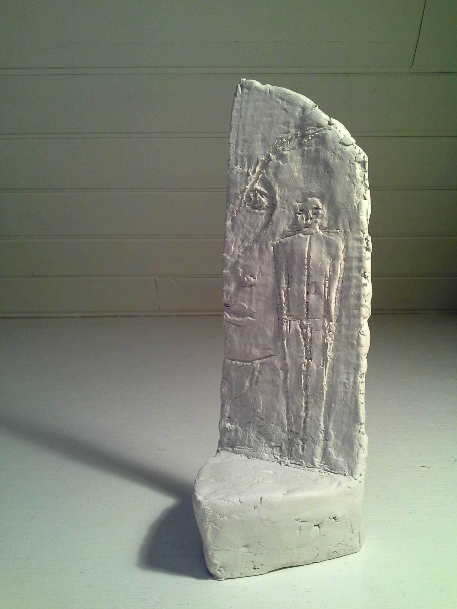 Jeg har tatt utgangspunkt i en granittplate - blå rønne, fra Bornholm, som kan gi fornemmelsen av et seil. På ”seilet”, har jeg slipt et relieff, av en ung mann/soldat, hvor hodet utgjør øyeeplet til det store ansikt i bakgrunnen. Ansiktet kan assosiere på forskjellige måter – men det er jo soldatens oppgave å beskytte mennesker. Uansett hvilken oppgave han er på. Derfor er ansiktet kanskje et bilde på misjonen, - eller på den han er nær, som savner og tenker på ham, liksom dette menneske også kan være hans savn. Længselen er manges følgesvenn.