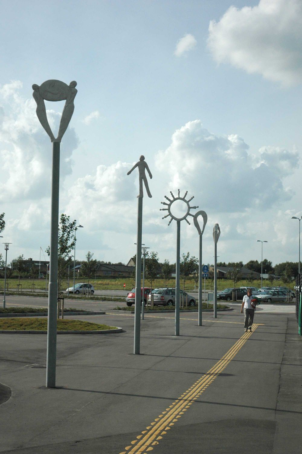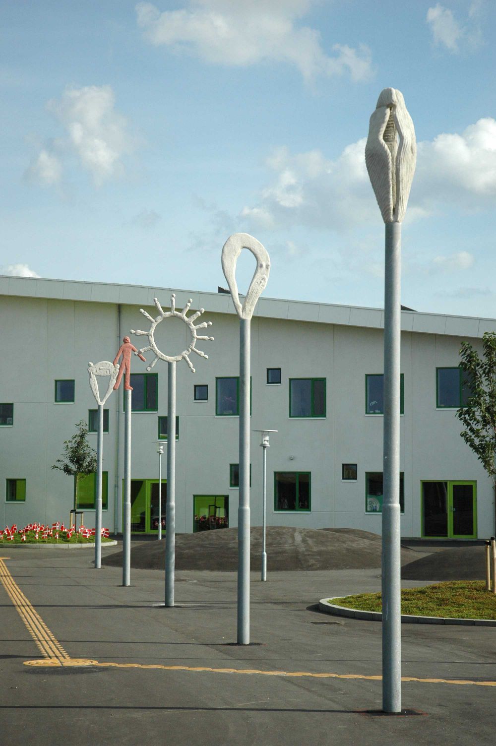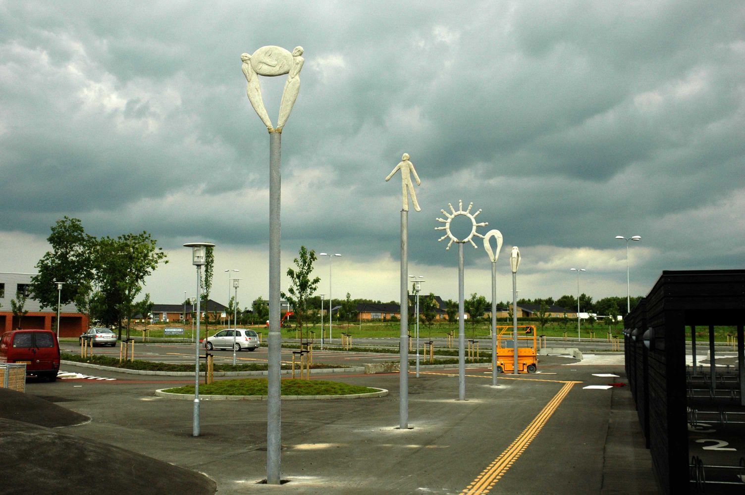 Skulpturene kan opfattes på lang avstand og er representative for hver ”stjerne – arms” funksjoner, etter samtaler med skolen. Figurene på toppen av søylene er proporsjonert så de skal være noe man skal komme nært på for å se detaljene. – De er opphøyde uten å være helter – men med et innhold som forhåpentlig gir stoff til å tenke selv.