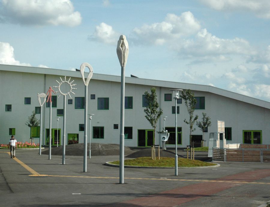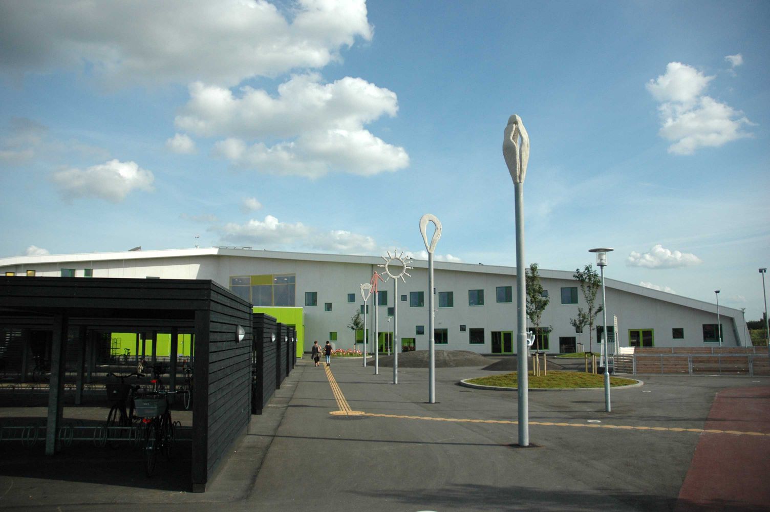 utenfor hovedinngangen til Tjørring nye skole og daginstitusjon, DK.