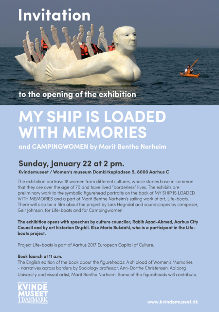 The exhibition portrays 18 women whose stories have in common is that they are over 70 years and have lived 'borderless'. Preparatory to the symbolic galionsfigurportrætter on the back of My ship is loaded with memories is part of Marit Benthe Norheim sailing work of art Life-boats. There will also be film about the project by Lars Hegndal and soundscapes by composer Geir Johnson for Life-boats.The exhibition opens with speeches by Dr. Phil. art historian and 'instrumental' Else Marie Bukdahl and Alderman Rabih Azad-Ahmad, Aarhus City Council.Project Life-boats is part of Aarhus 2017 European Capital of Culture.