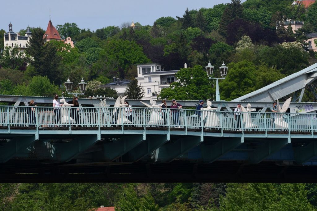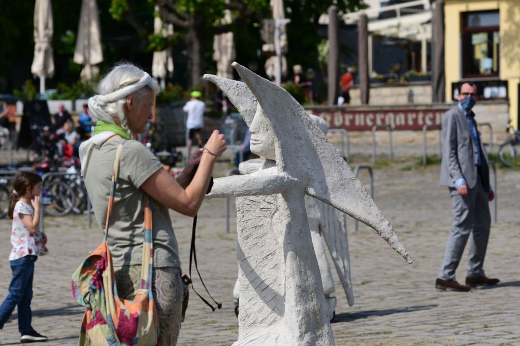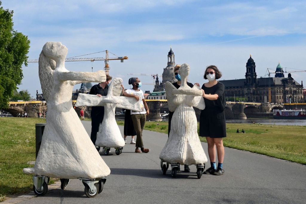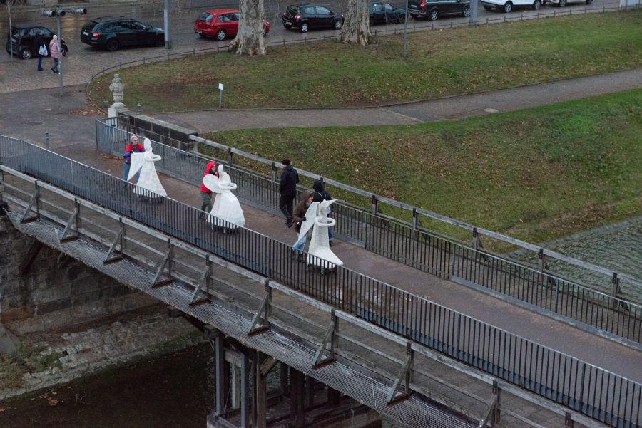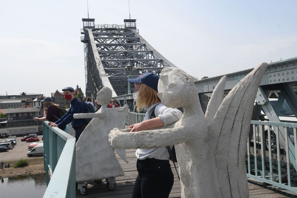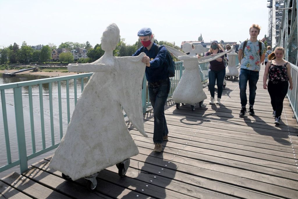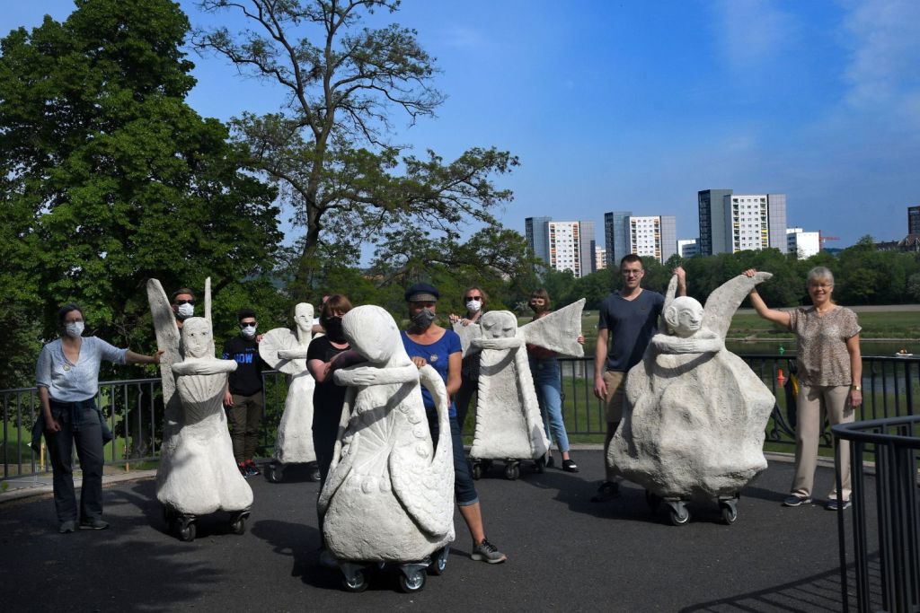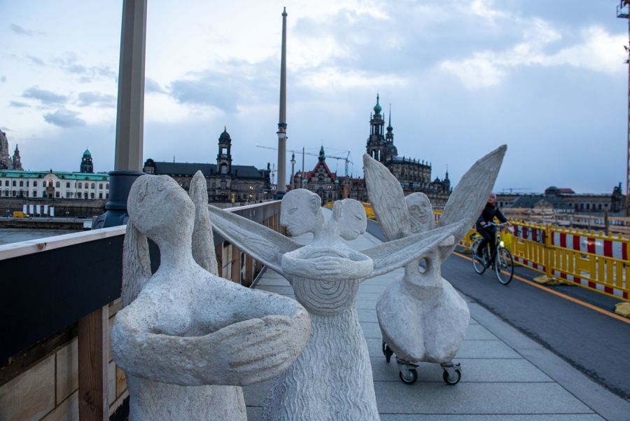The performance with 17 rolling angel sculptures made of white concrete by the Norwegian-Danish artist Marit Benthe Norheim with music by composer Geir Johnson will be presented under the title ROLLING ANGELS. Mit sicherem Abstand simultaneously on both banks of the Elbe at the three historical bridges, Augustusbrücke, Albertbrücke and Blaues Wunder. All bridges in Dresden, except for Blaues Wunder, were destroyed by German troops shortly before the end of the war and rebuilt after the war. Today, the bridges can also be regarded as symbols of the connectedness of the urban community.
