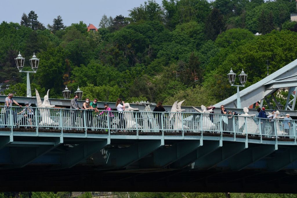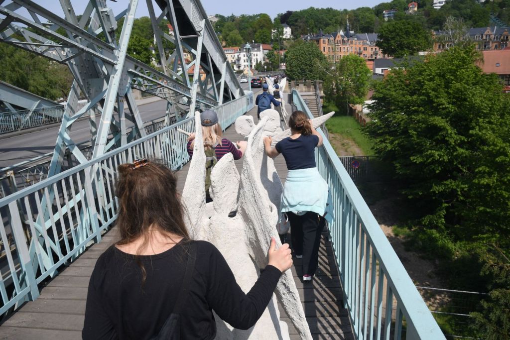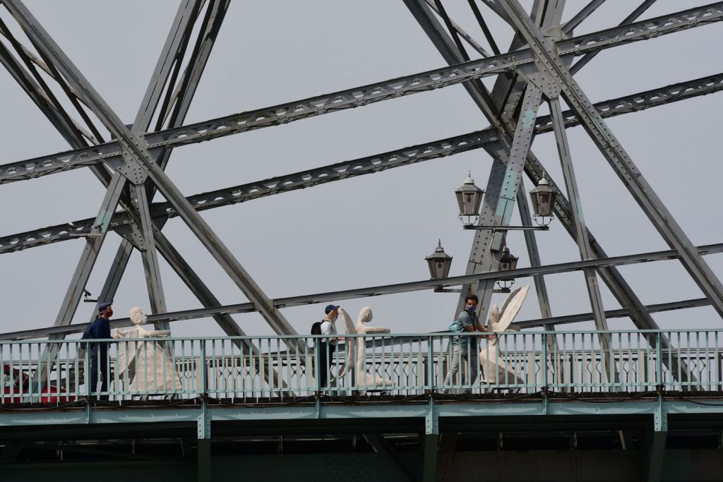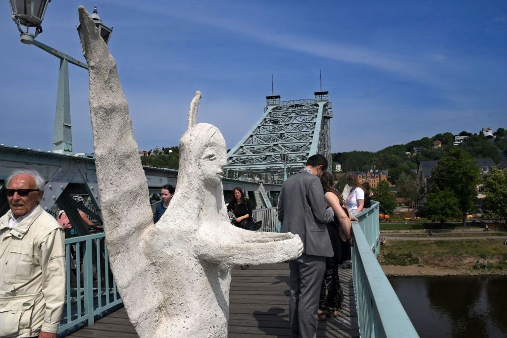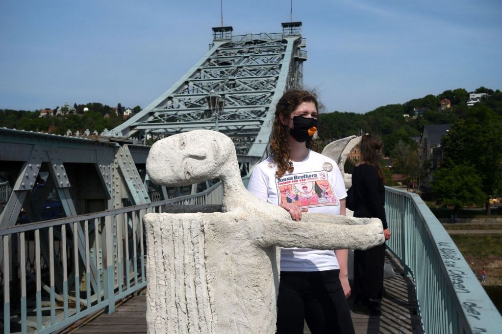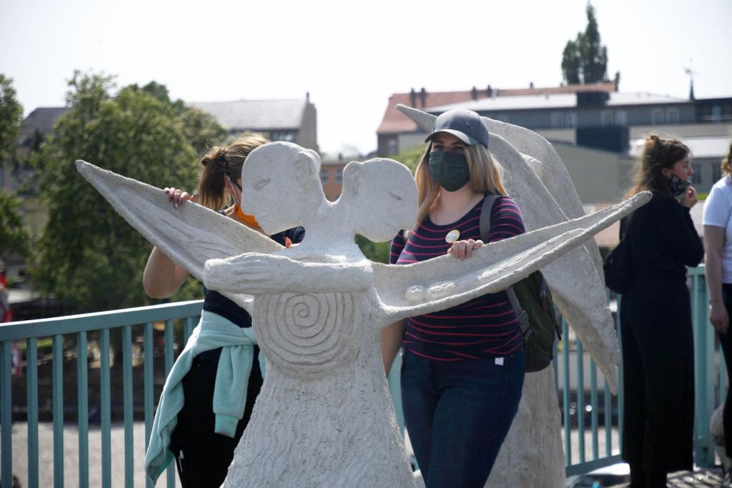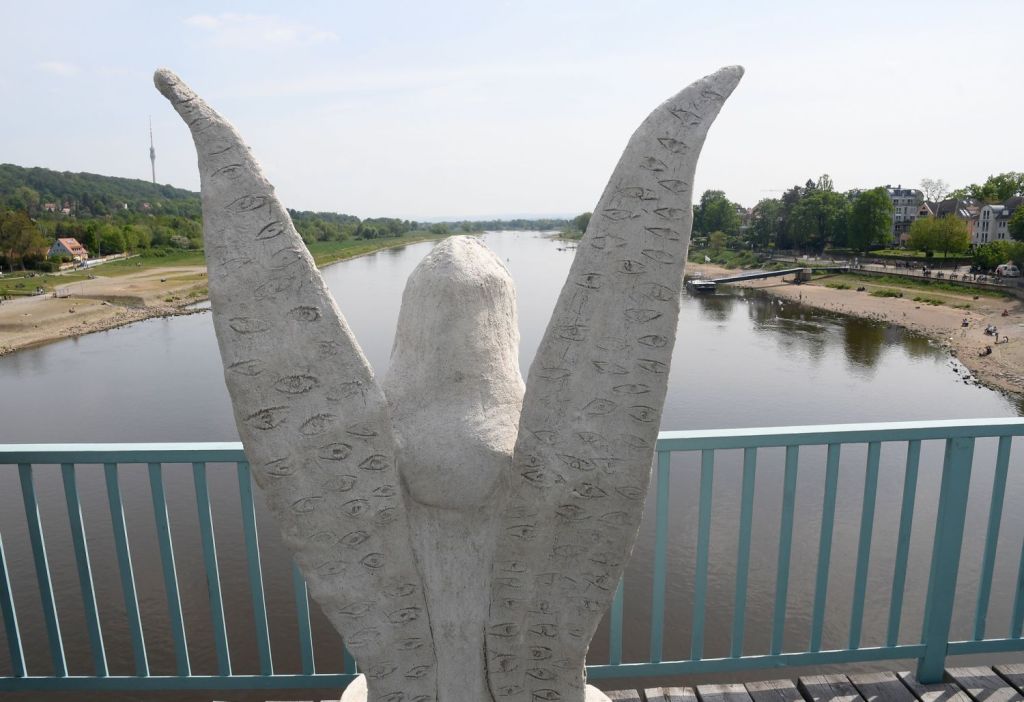 The performance with 17 rolling angel sculptures made of white concrete by the Norwegian-Danish artist Marit Benthe Norheim with music by composer Geir Johnson will be presented under the title ROLLING ANGELS. Mit sicherem Abstand simultaneously on both banks of the Elbe at the three historical bridges, Augustusbrücke, Albertbrücke and Blaues Wunder. All bridges in Dresden, except for Blaues Wunder, were destroyed by German troops shortly before the end of the war and rebuilt after the war. Today, the bridges can also be regarded as symbols of the connectedness of the urban community.