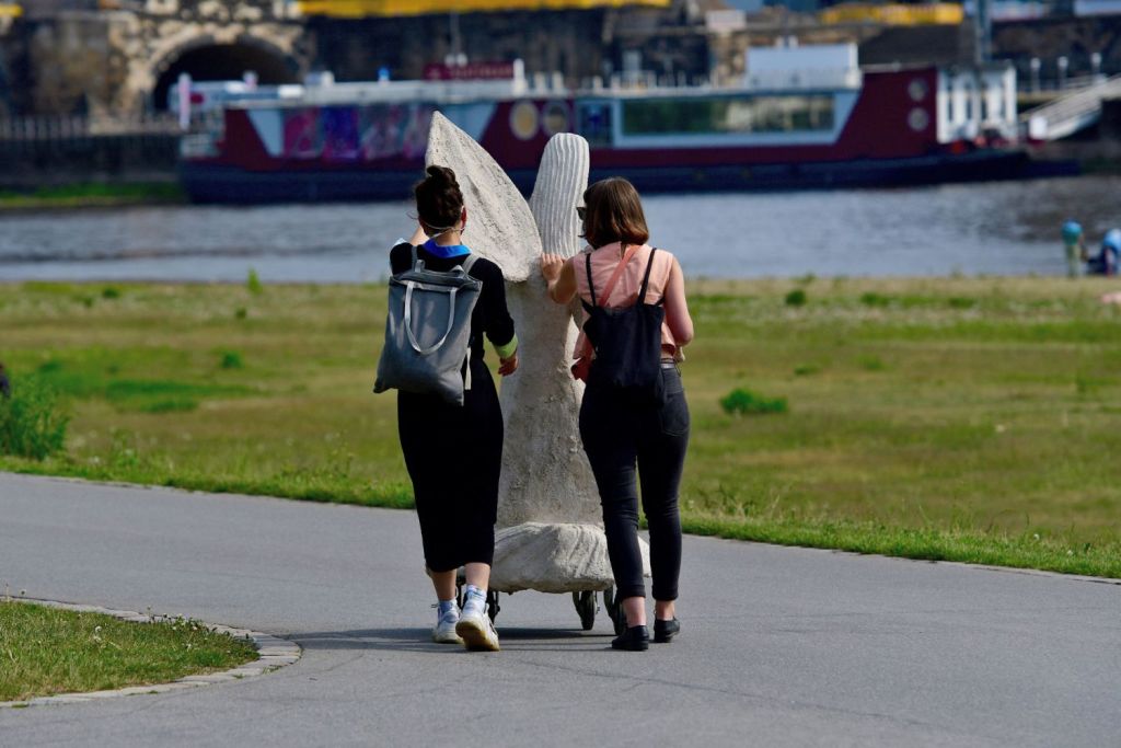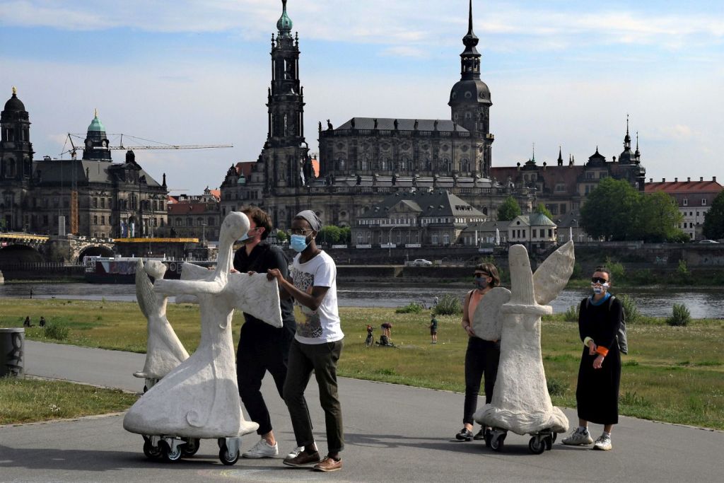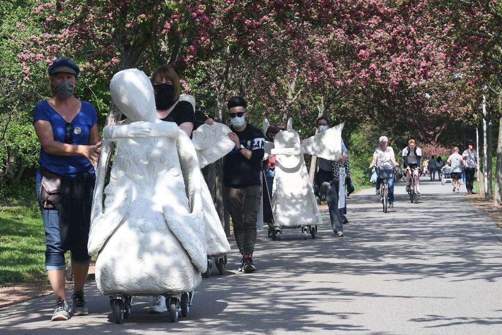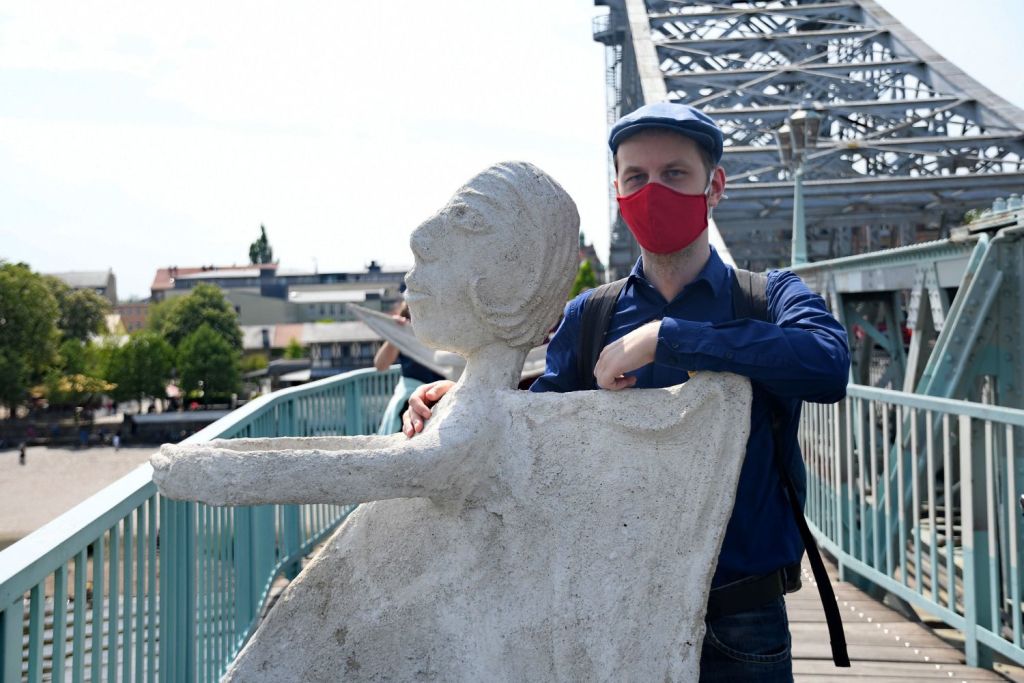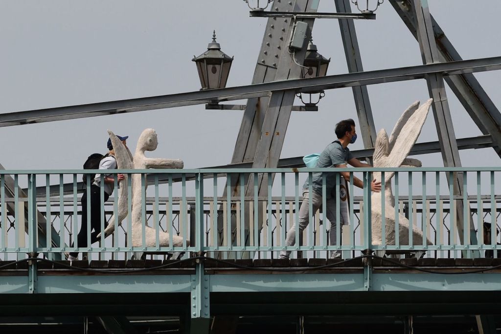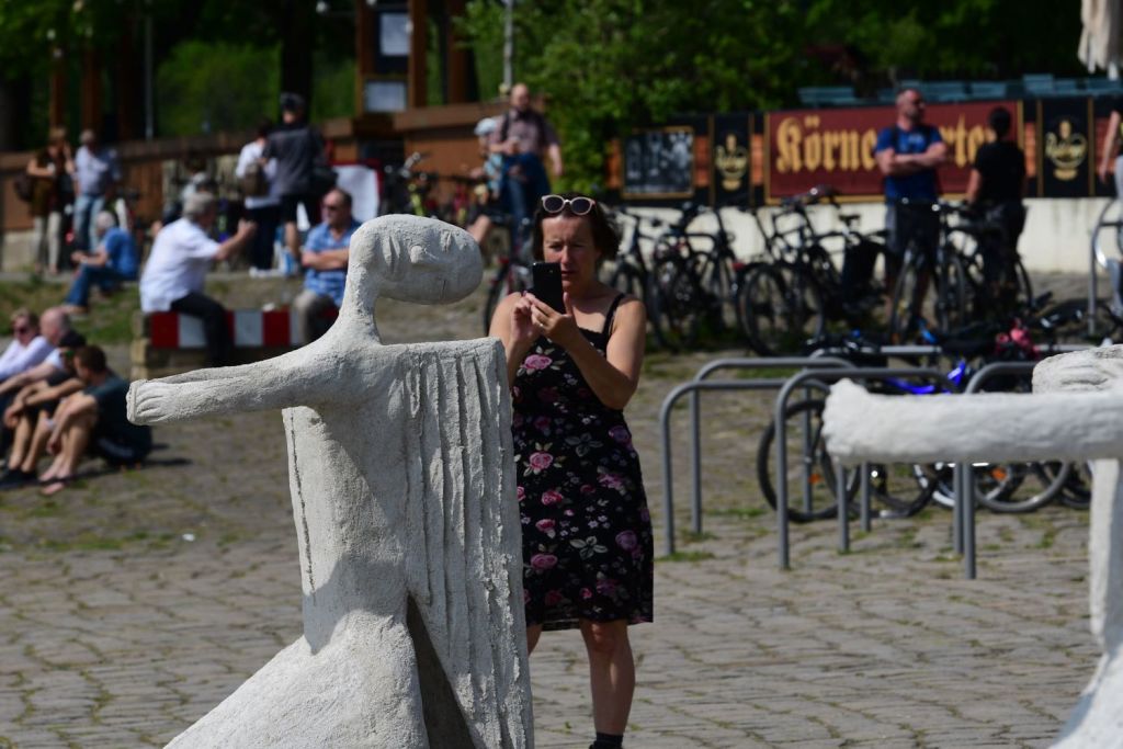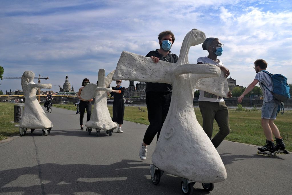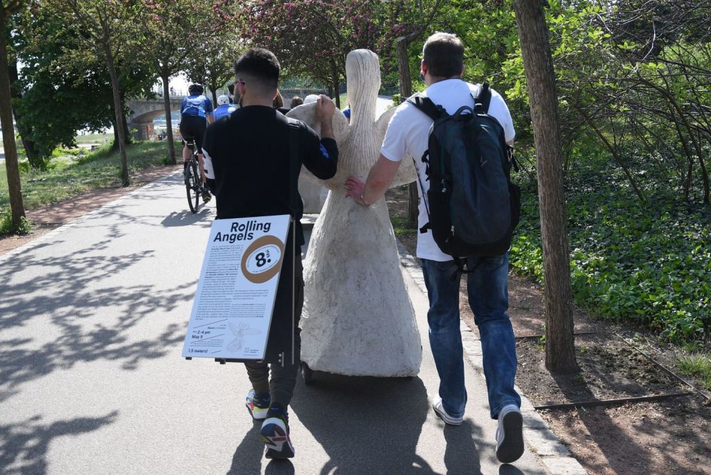 The performance with 17 rolling angel sculptures made of white concrete by the Norwegian-Danish artist Marit Benthe Norheim with music by composer Geir Johnson will be presented under the title ROLLING ANGELS. Mit sicherem Abstand simultaneously on both banks of the Elbe at the three historical bridges, Augustusbrücke, Albertbrücke and Blaues Wunder. All bridges in Dresden, except for Blaues Wunder, were destroyed by German troops shortly before the end of the war and rebuilt after the war. Today, the bridges can also be regarded as symbols of the connectedness of the urban community.