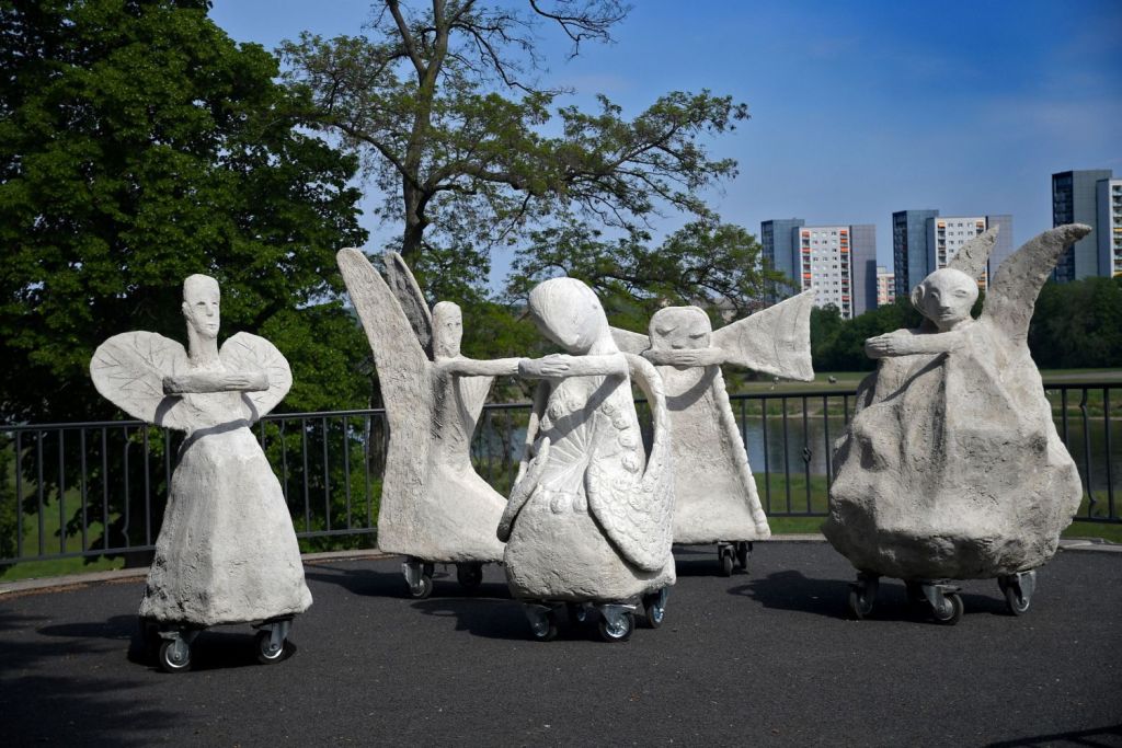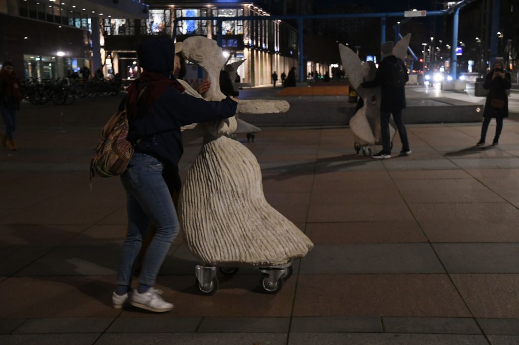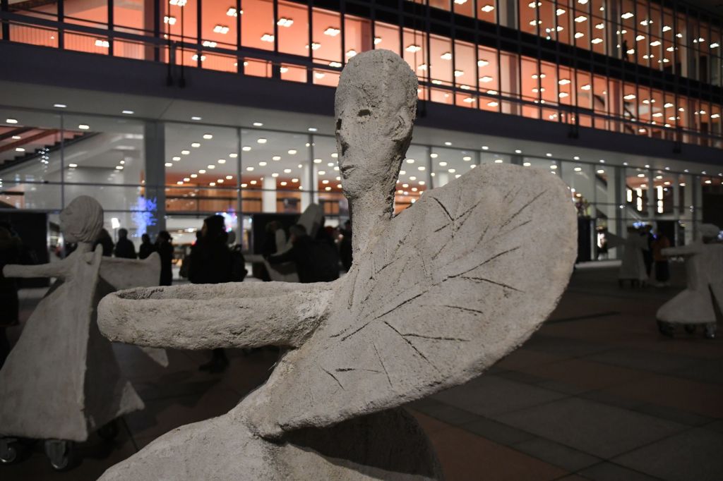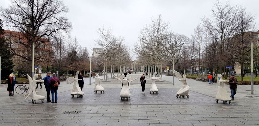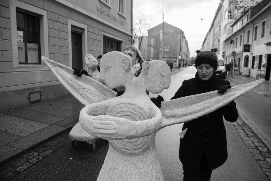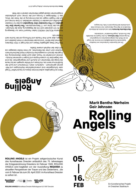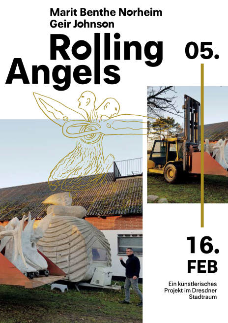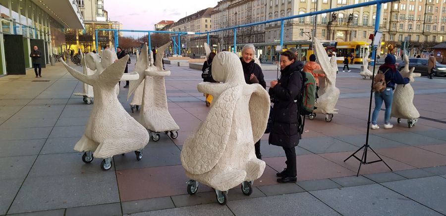 February 5th to 16th An Art Project by Kunsthaus Dresden with the Danish-Norwegian artist Marit Benthe Norheim and the Norwegian composer Geir Johnson in the Urban Space of Dresden. If angels existed, what could they help us with today? Various mythologies and religions have angels, or guardian spirits, in common – Judaism, Islam, Christianity, and also Buddhism is familiar with them. As messengers and intermediaries, they continue to reflect people’s worries about the future and the past. They are counterparts for our fears and worries in extremely distressful situations and stand for sorrow, but also for overcoming it. The angels of the Danish-Norwegian artist Marit Benthe Norheim mingle with humans, moving about on their rollers over the asphalt of our cities.Like Paul Klee’s winged beings and the angels in Wim Wender’s film “Wings of Desire,” they are close to humans with their doubts and worries, but also in their joys and hopes and their quest for peace.The art project is initiated by the Kunsthaus Dresden as part of the Museums of the City of Dresden on the occasion of the 75th anniversary of the destruction of Dresden during the war in February 1945. The flock of angels will be released into the public space in the center of Dresden in front of the Culture Palace on the 5th of February, 5 pm in the presence of the mayor of Dresden, Dirk Hilbert.The flock of angels invites passers-by to move, their positions change upon the encounter. Two of the guardian angels from the flock of 17 concrete sculptures, “The Carrier” and “The Caretaker,” were created for and will remain in Dresden. In their arms and on their wings they carry the memory of the dead of the Shoah, the Second World War in Europe, and the still prevailing violence of war against people all over the world.A sound installation inside the angels is based on the chirping sounds of insects and is a work by the contemporary Norwegian composer Geir Johnson. The project will be accompanied by postcards inviting passers-by to share their thoughts around the role, that angels could play in our contemporary life:“If angels existed, what could they help us with? Would they need a passport? What would be their role in our shared life of today?“Marit Benthe Norheim lives and works as a contemporary artist in Hjørring, Denmark. Her work will also be part of the group exhibition REQUIEM on contemporary artistic perspectives on commemoration and mourning at Kunsthaus Dresden from the 8th of February to the 26th of April 2020. Geir Johnson lives and works as a contemporary composer in Oslo. His choir piece “Angel Revelation” has also been created in conjunction with the angels. ROLLING ANGELS is a contemporary art project of Kunsthaus Dresden on the occasion of the 75th anniversary of the destruction of Dresden during the war in February 1945. Requiem is a project of “Rest in Peace” and “Neighbourhoods 2025”.