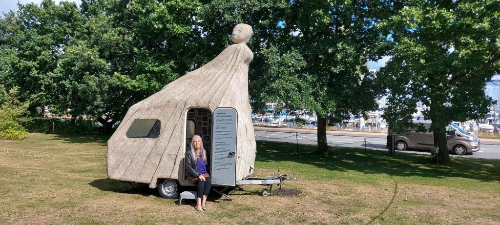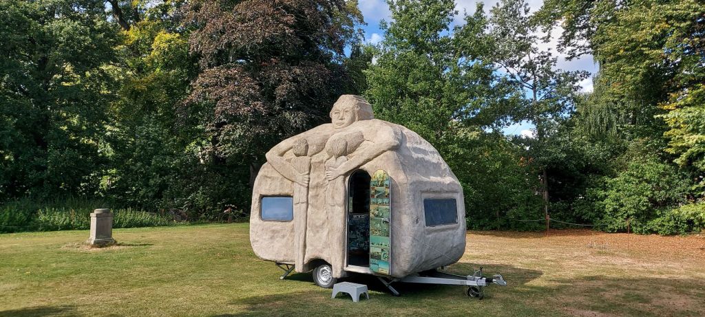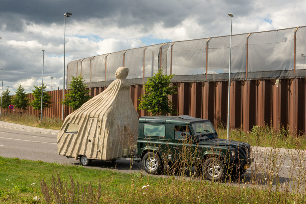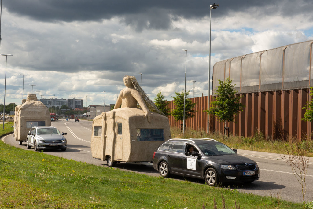 The bearing idea and simultaneously the inner armature of the construction of the cement sculptures are functioning caravans. Each of the female sculptures’ torsos grows out of the roof, such that the caravan functions as the skirt of the figure. One can enter the 4 metre tall Campingwomen which are the Refugee, the Bride, Maria the Protector, The Siren and the Campingmamma. Inside, the space has been customised in various ways - several of them with the participation of different population groups. The Refugee’s caravan is, for example, filled with porcelain reliefs about the process of fleeing, made by children and refugee women working together. Others with wallpaper made out of collected photographs.