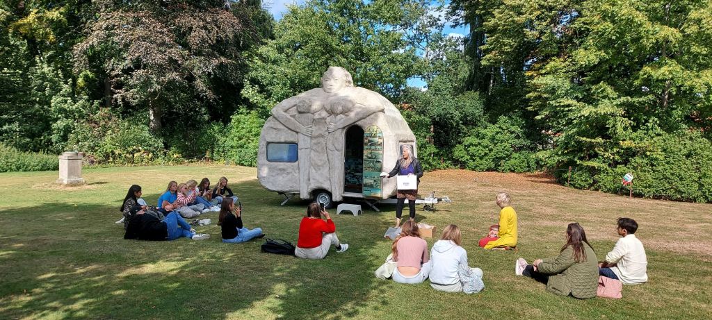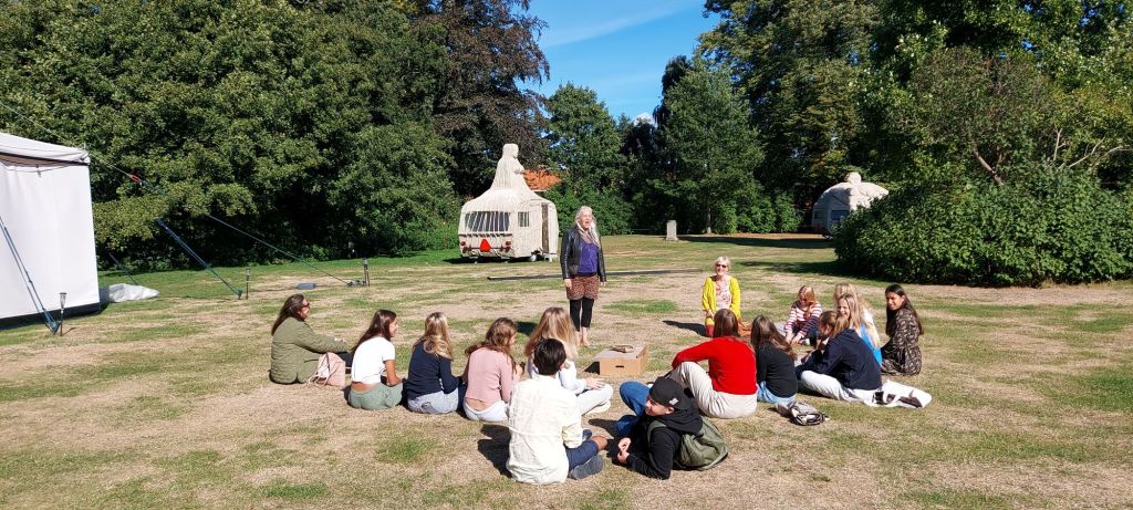 6/9 2022 CAMPING WOMEN IN THE MUSEUM'S GARDEN AT RUNGSTEDLUND. AND BENTHE NORHEIM HOLDING A WORKSHOP FOR SCHOOL STUDENTS