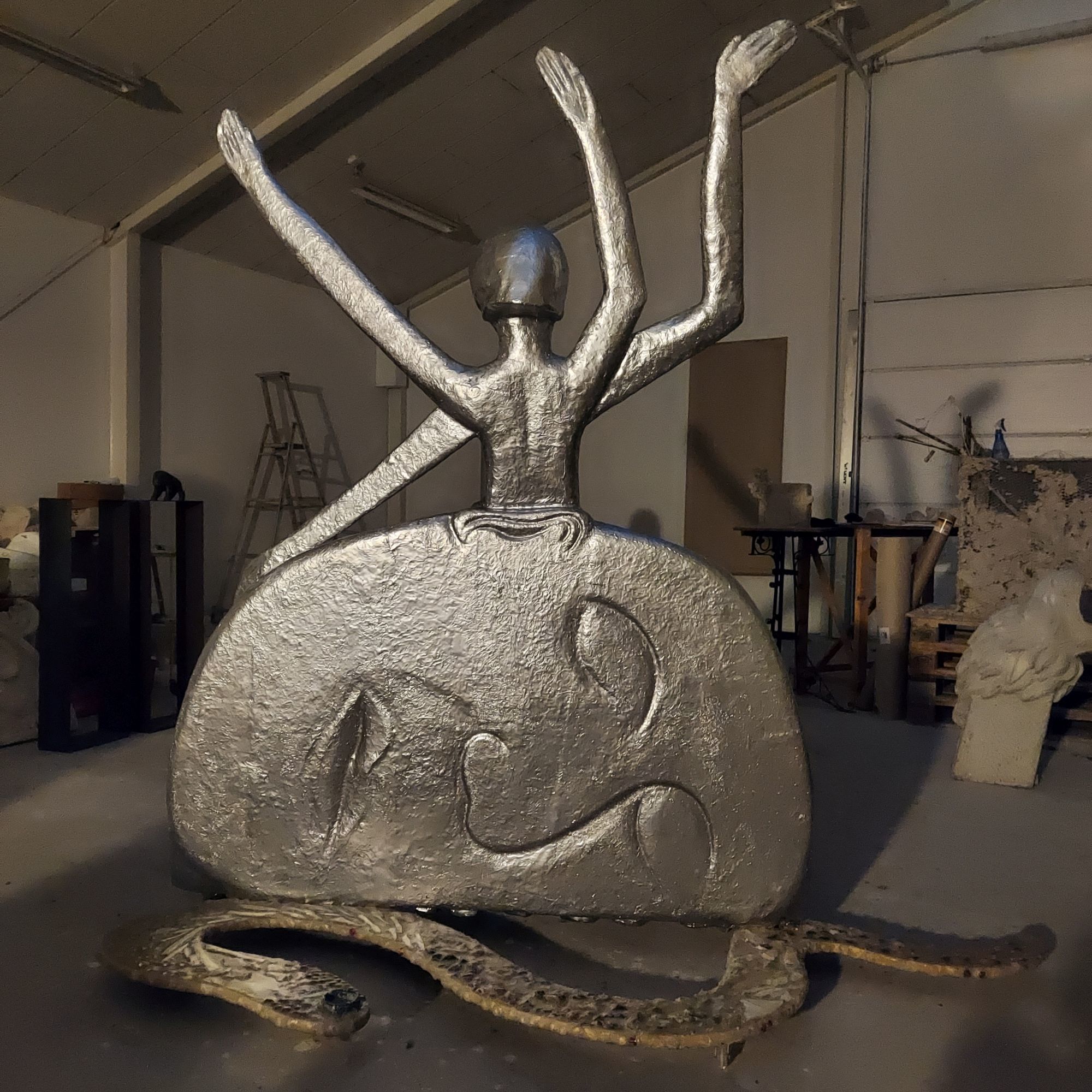 Since September 2021 my installation titled Rolling Angels, consisting of 15 sculptural mobile angels, (modelled in concrete over second-hand rubbish bins) have been residing in Linksmakalnis. They have been used by a contemporary circus group who have pushed and pulled them through Linksmakalnis and Kaunas City.In addition to bringing this flock of Rolling Angels, I was asked to create an angel specifically for the small town Linksmakalnis, who would be staying there permanently. The sculpture was handed over on the 1st of October in Linksmakalnis, with speeches by the Elder/Mayor of the town, three representatives from the European Capital of Culture Kaunas22, Representative from The Danish Cultural Institute and the artist. There was also a handover performance by Džiugas Kunsmanas and Sigrid N. Ørntoft, accompanied by the music for the Angel of Smiles and a concert by local musicians.In 1995 I participated in an exhibition at Ciurlionis Museum in Kaunas, where I bought a brochure about the Lithuanian folk artist and children’s book author Stasė Samulevičienė. This woman received in 1977 the “Order of Smiles” which was given to people who had shown a great compassion towards children. I found the booklet about her, titled Smile – and decided that this little town needed the energy that I found in the story of Samulevičienė. The angel for Linksmakalnis is therefore a symbolic portrait of this woman, where I have tried to work out a smile without sentimental or scary connotations. Stasé Samulevičienė made small fluffy creatures which also illustrated her stories. As an event for the opening ceremony, I had collected second-hand teddies from Denmark and fastened them to my costume with safety-