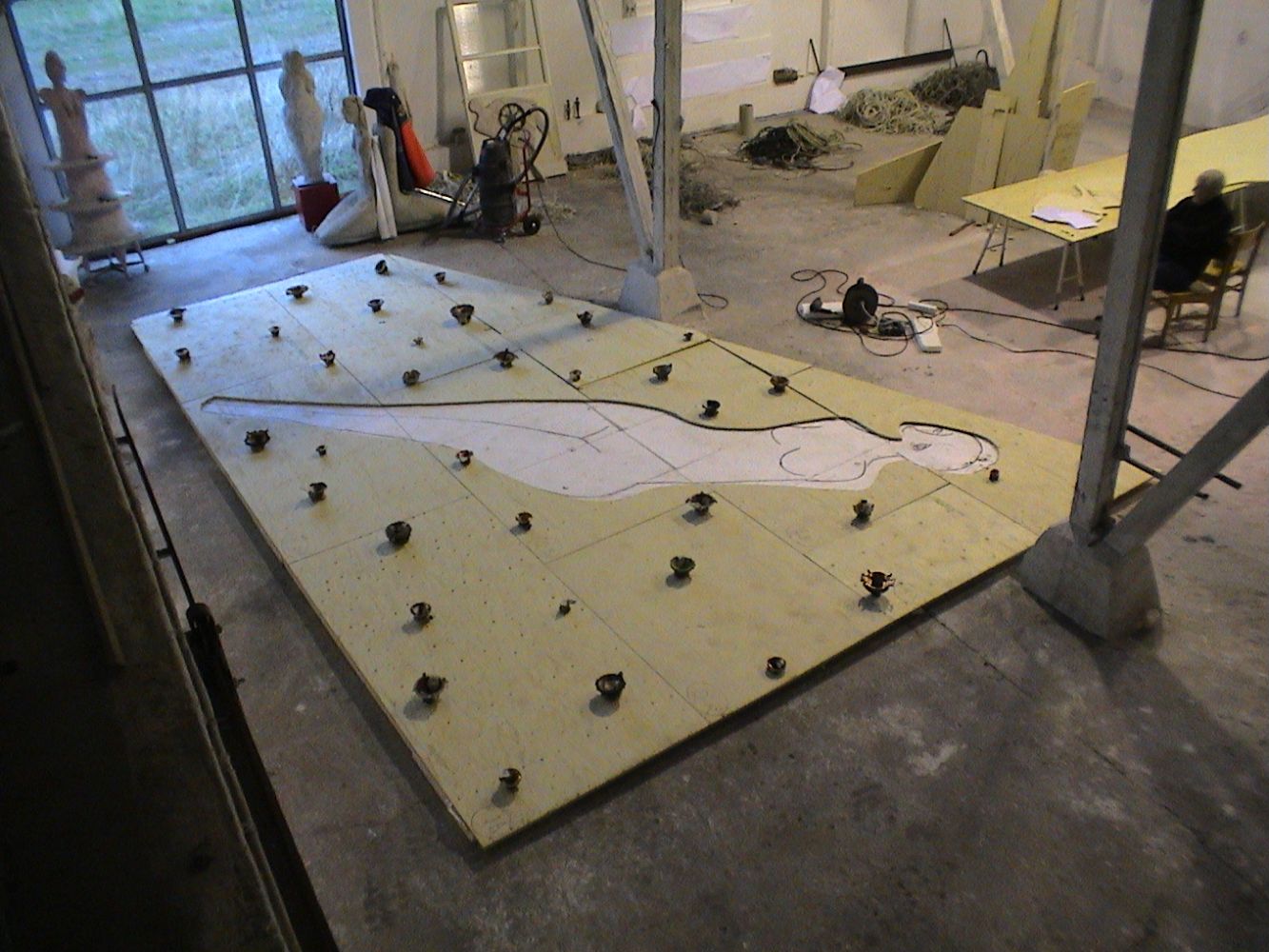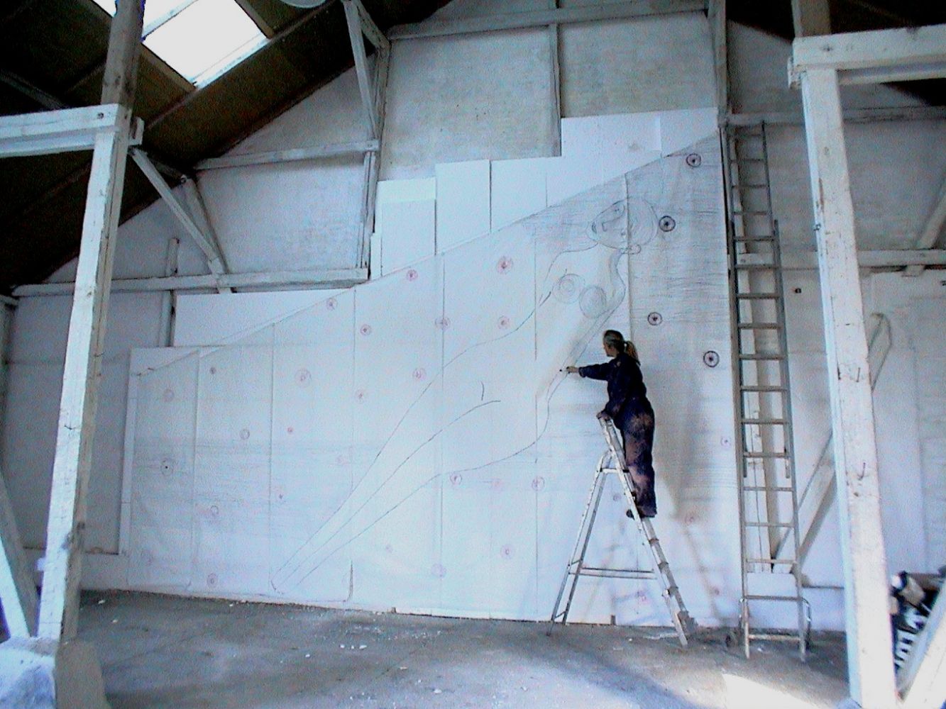 Menneskestillads2004-2005, beton og stilladselementer,5 x 5 x 6 meter”Menneskestillads” er bygget op over et funktionelt stillads. Det fungerer både som armering og ramme. 36 beton figurer, ( hver ca. 2m. høje), er modelleret direkte over de lodrette stillads stænger og bliver dermed de bærende elementer. På denne måde vil konstruktionen kunne tilpasses forskellige steders karakter og arkitektur.Menneskets overlevelsesdrift, evne til foranderlighed, til at flytte på sig og genopbygge har altid fascineret mig. I ”Menneskestillads”  har jeg kunnet gå ind i disse temaer, fordi stilladset giver en logisk indgang til at lege med dette. Væsnerne vil kunne bytte plads indbyrdes og f.eks. vende op eller ned næste gang.