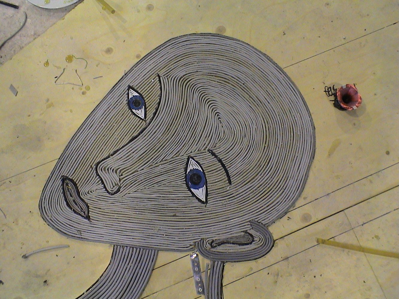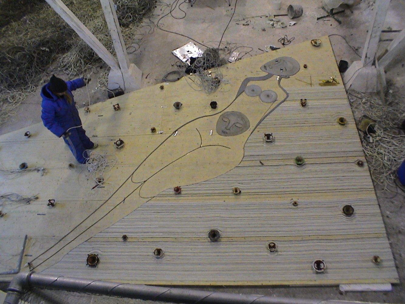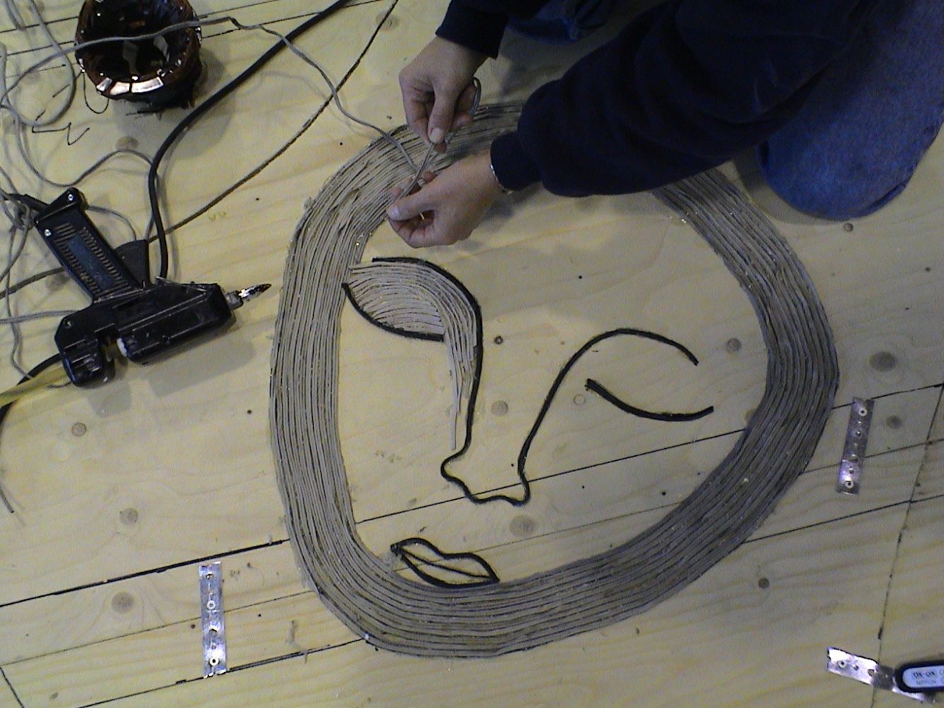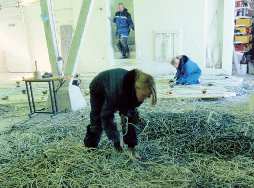 The basis for the Cable Tapestry was the experience of watching the sorting work at the waste plant, where the cables seemed to me to symbolise a kind of umbilical cord for our modern civilisation. The umbilical cord to all our ”vital” organs; that keep us warm/clean/fed/informed and wealthy.